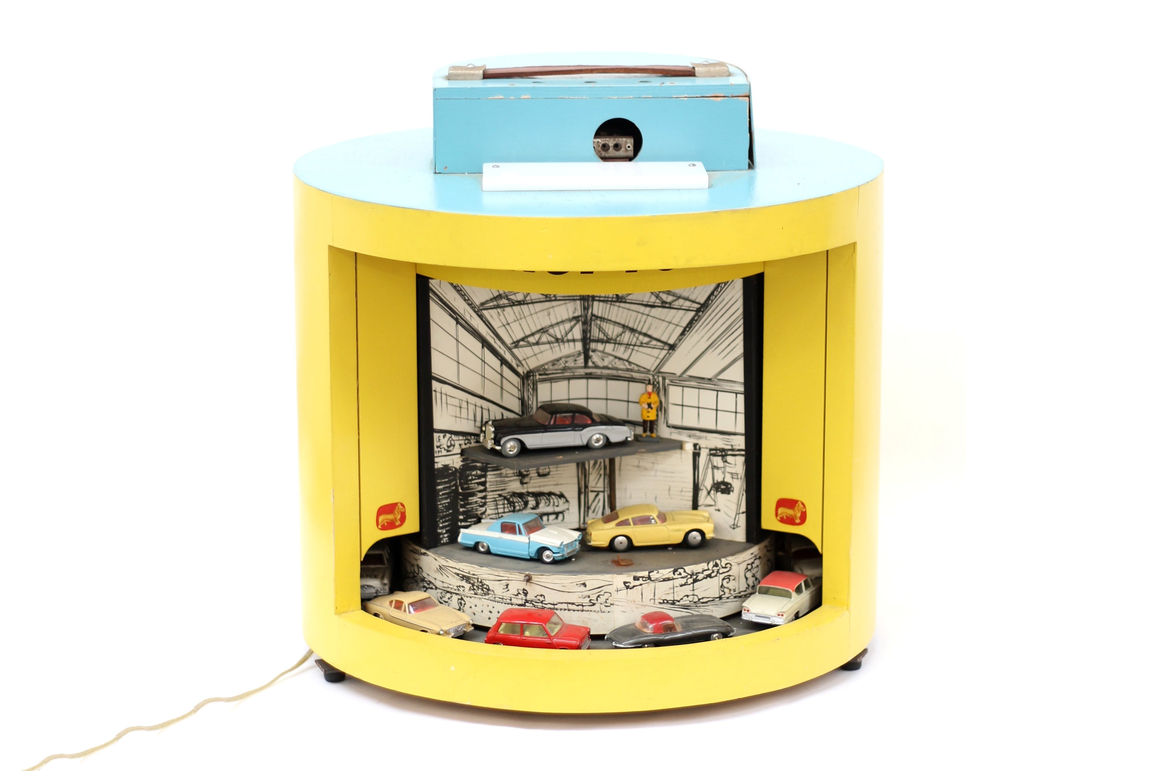 What is scarcer than a rare item? The next item successfully fits that description and is believed to be one-of-a-kind. Made for a trade show to display Corgi cars it is anything but a ‘typical’ display. Featuring sixteen diecast model vehicles, the lower section as a circular rotating motorway. The central section with three alternating dioramas with moving parts including bonnets and boots opening and closing, truck tipping, tractor shovel rising and lowering and hydraulic crane truck extending and lowering. The display is housed within a blue and yellow painted ply casing with Corgi logo to front and light up top.