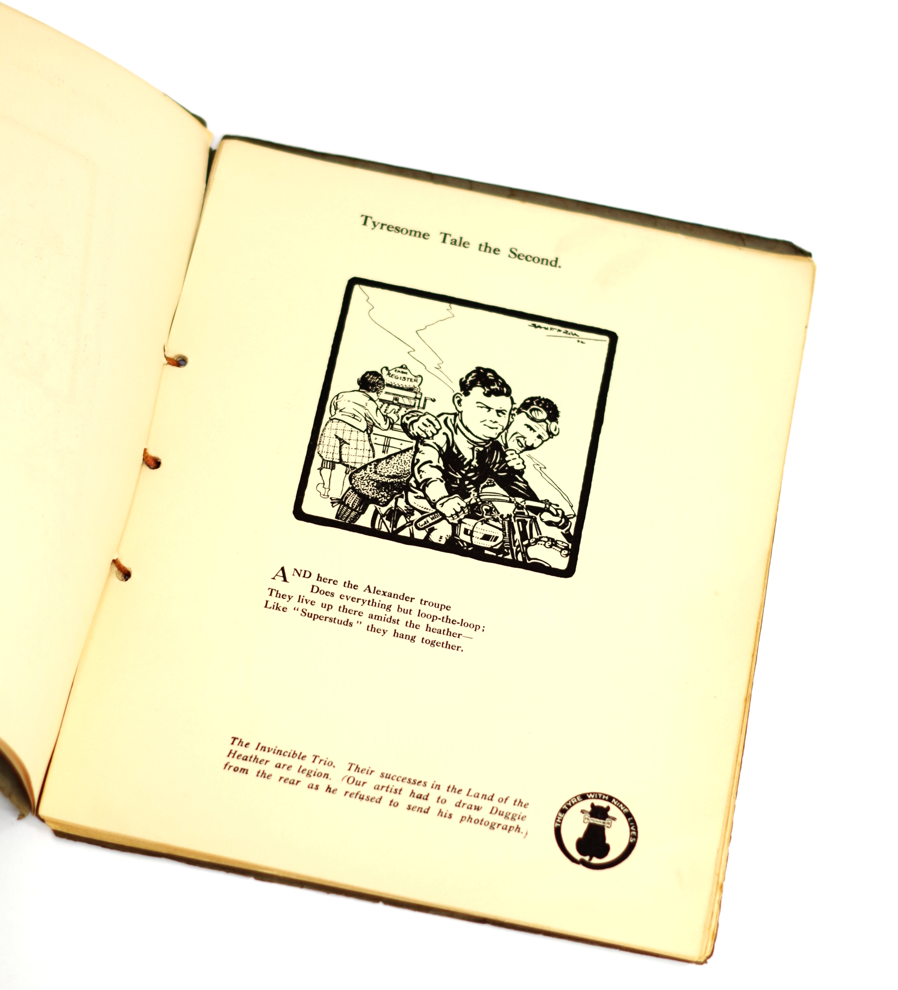 Featuring in the next Automobilia auction at TW Gaze Diss Auction Rooms on 8 July is a fine copy of Hutchinson’s promotional volume “Tyresome Tales”, published almost 100 years ago to celebrate the top stars of early 20th Century two-wheel speed and their achievements, in collaboration with Hutchinson whose tyres were fitted on their machines. The Hutchinson black cat logo features on each page of the booklet with the motto “The Tyre with Nine Lives”.