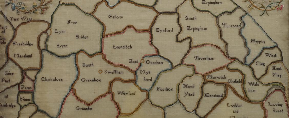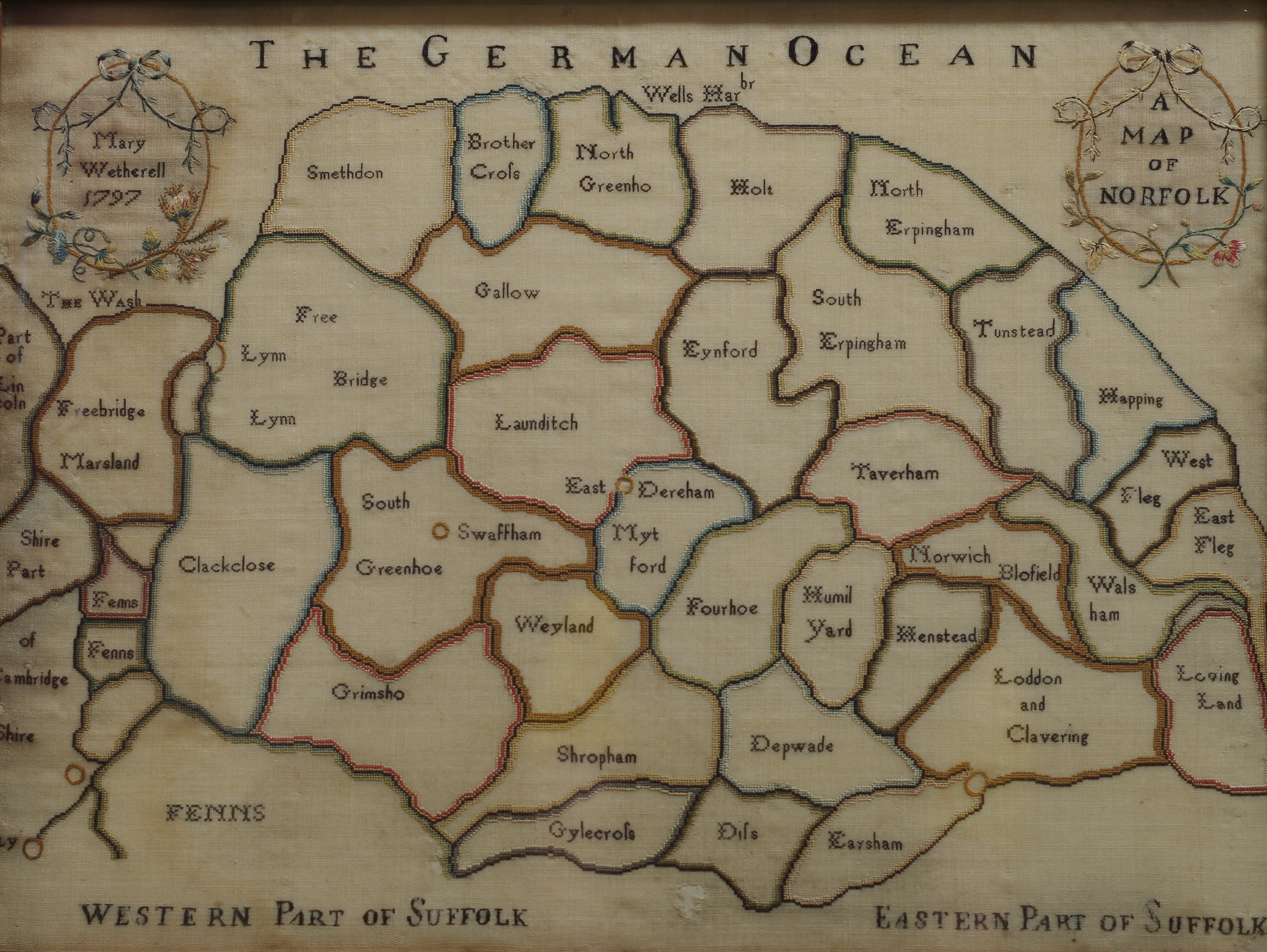 However, standing proud amongst the international representatives are some lovely East Anglian samplers which may appeal to local people for lots of reasons other than merely their needle craft. Maybe association with a village, the name of a forebear, or even an interest in local history, will prick the interest of potential bidders? There is a finely worked late George III silk work sampler dated 1819, by Eliza Brett, a member of a family from the Norwich area, well known for their samplers. Within a selection of map samplers is an even earlier work, a map of Norfolk by Mary Wetherell, dated 1797. There is a deceptively simple sampler sewn in silk thread on a muslin ground with “Spiritual Railway”, two verses taken from a stone memorial in Ely Cathedral to two men, victims of a railway accident on the Norwich to Ely railway line on Christmas Eve, 1845. It is thought that Miss Rolph, who worked the piece, may have been a relative of either William Pickering and Richard Edgar, or was perhaps a fellow-passenger on the fateful journey.