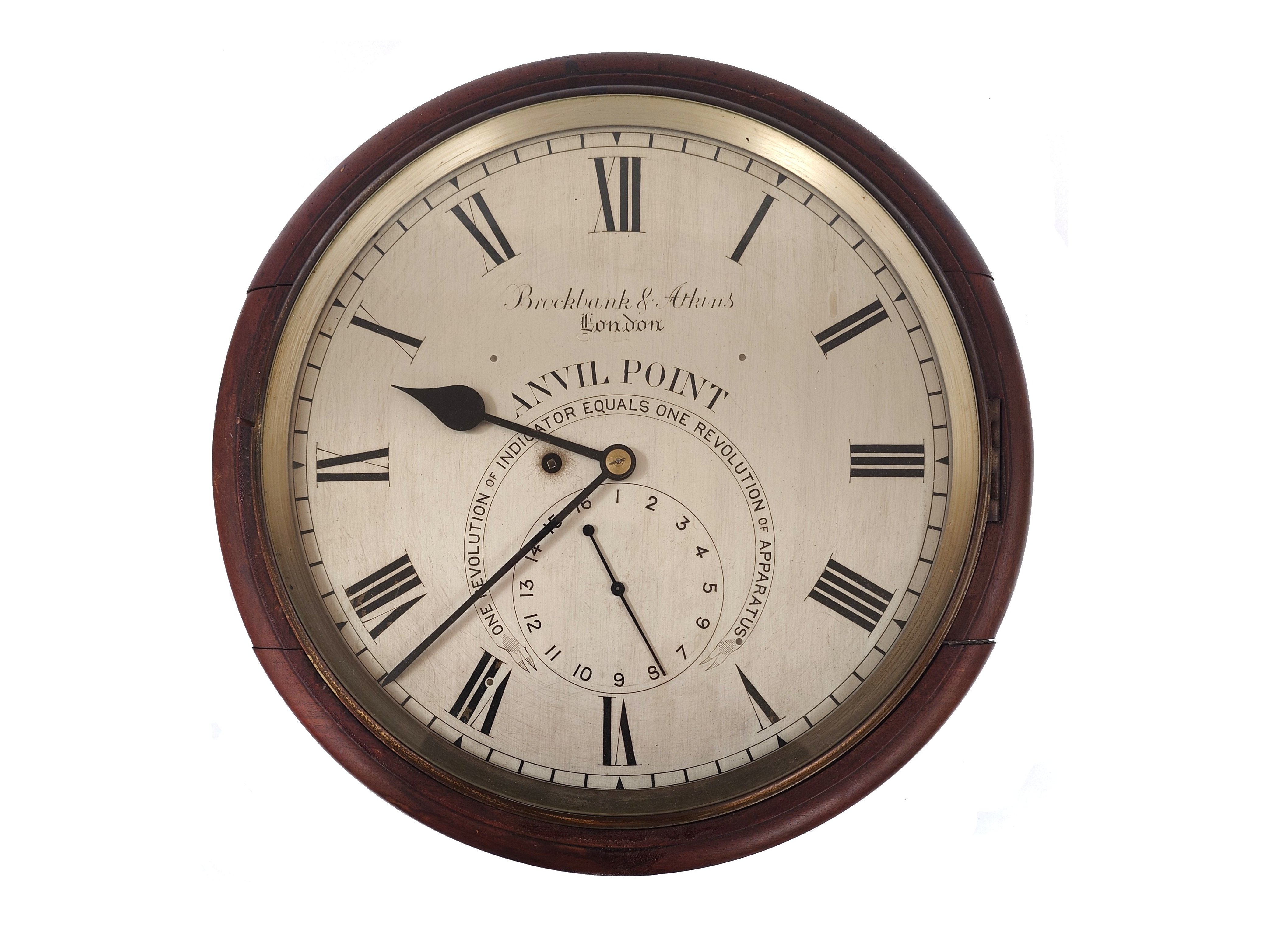 One of the lots submitted to TW Gaze’s next dedicated Clocks & Watches auction is already causing a ripple of interest amongst maritime historians. Consigned by a private vendor from an East Suffolk coastal port, the late 19th Century eight-day circular wall time piece in a plain mahogany case is very unassuming in appearance. However, the silvered face carries an unusual subsidiary dial, numbered 1 – 16 and is handsomely engraved “Anvil Point. One Revolution of Indicator Equals One Revolution of Apparatus”. These words instantly provide the provenance and explain the purpose of this unique example of a rare type of clock. What’s more, the makers were Brockbank & Atkins of London.