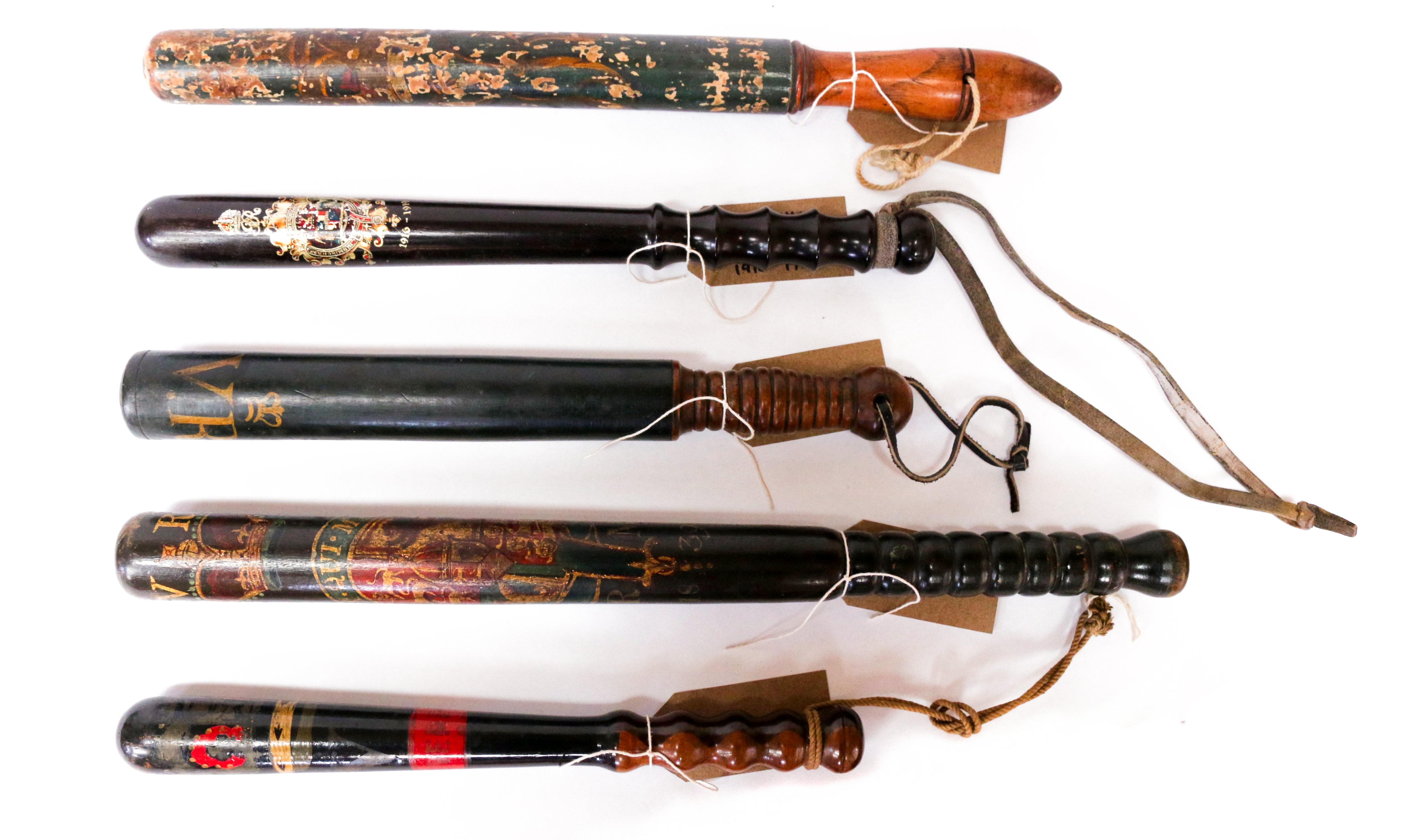 A private collection of nearly 60 truncheons is to be offered for sale in the next Militaria auction at TW Gaze Diss Auction Rooms on Tuesday 30th September, providing opportunity for the baton of ownership to be passed on. Many date from the Victorian period, with well-worn original decoration identifying sovereign or city, whilst the earliest bears the cypher of George IV. The collection perfectly illustrates the variety of shape and handle design and also contains a few Lignum Vitae examples.