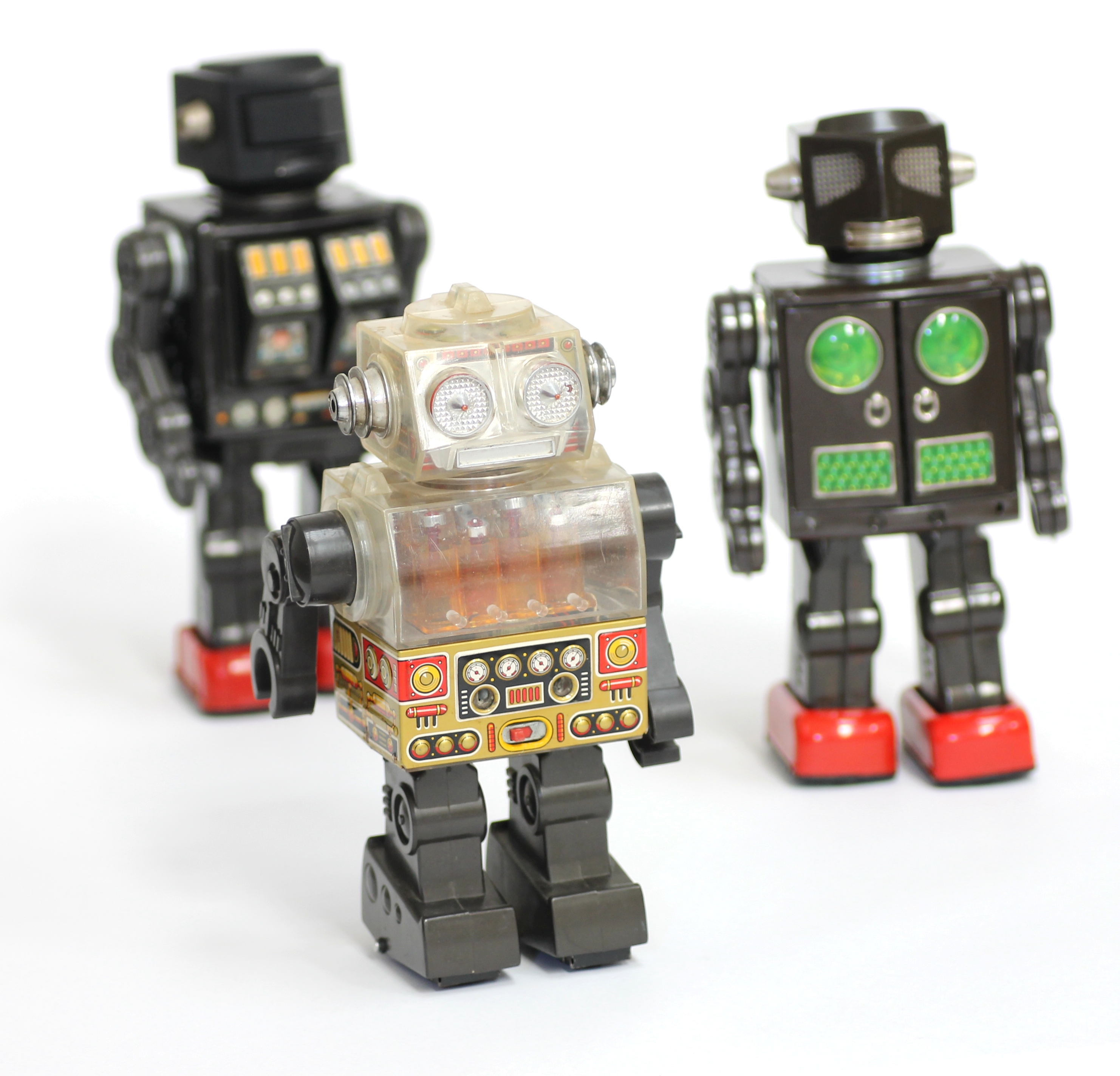 The earliest (modern) robots as we know them were created in the early 1950s by George C. Devol, an inventor from Louisville, Kentucky. Somewhere between 1954 and 1956 he invented and patented a reprogrammable manipulator called “Unimate,” from “Universal Automation.” Also in 1954, the first American-made robotic toy, known as Robert the Robot, appeared in the Sears Christmas Book. The very next year, Japan started exporting battery-operated robotic toys to the U.S. By the mid-1950’s, Japan had become the world’s primary toy manufacturer.