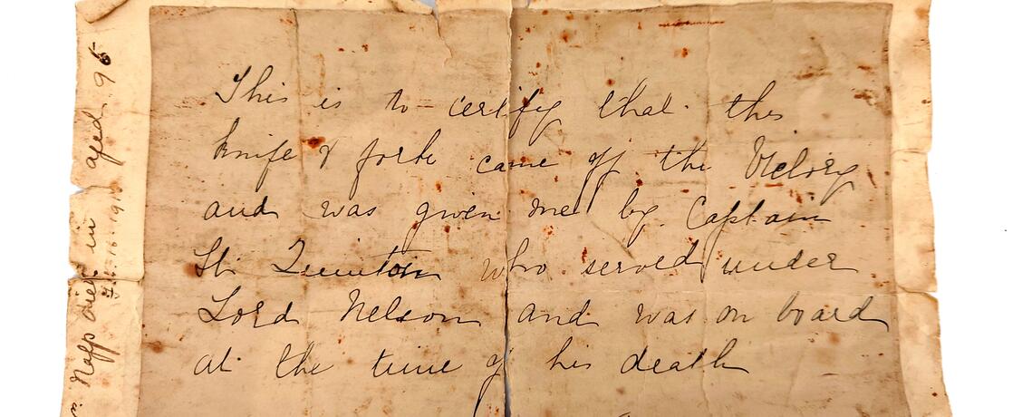 A little stash of Nelson-related items has been found, hidden in an unassuming cupboard in a characterful rural retreat in coastal Norfolk. Wrapped in home-knitted woollen socks and cheek-by-jowl with vintage thermos flasks, outmoded drinking glasses and extremely faded Christmas decorations of several ages ago, without careful consideration and patient inspection, the treasures could so easily have been discarded as rubbish; the executors had skips outside at the ready and were eager to empty the property as quickly as possible. Instead, the clearance of the house was being overseen by an experienced valuer with an instinctive appreciation for surroundings and context, a curious nature, and a painstaking methodology.