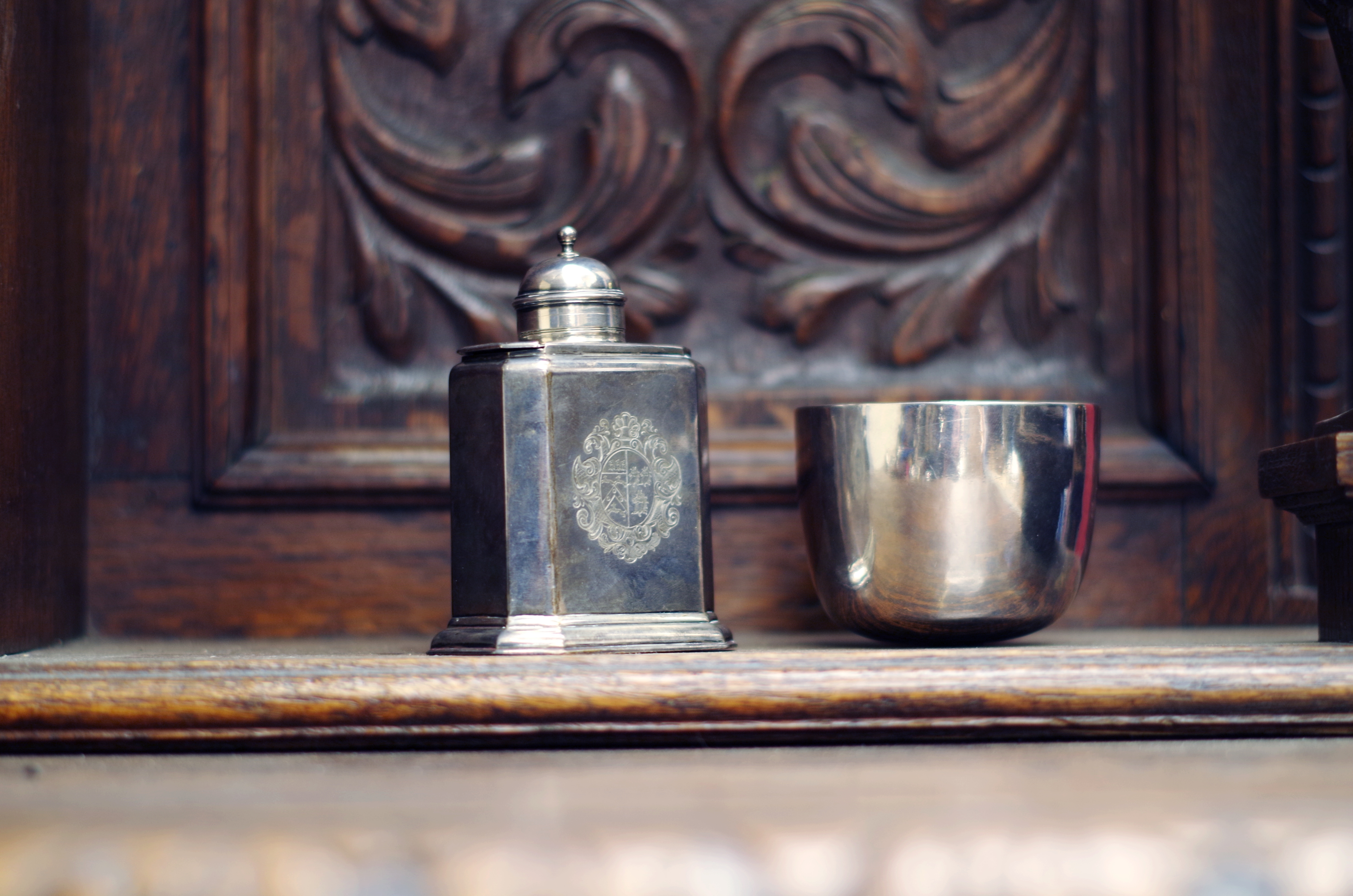 The slightly later item is a tea caddy assayed in London in 1724. A tea caddy can be a box, jar canister or other receptacle used to store tea. The word is believed to derive from the Chinese word “catty” or the Malay word “kati”, a measure of weight; a topical reference to the need to weigh tea for trading. Tea in the early 18th Century was exotic, highly fashionable and expensive and there was also a tax on tea, so early tea caddies were small and made in precious materials such as silver, shagreen (shark’s skin) or tortoiseshell which reflected the valuable contents they contained. This example was made part-way through the reign of George I, but the style borrows directly from the distinctive tea caddies of the earlier Queen Anne period. It is of vertical rectangular form with canted corners; it has a slide-off lid (for easy filling) which is centred by a cylindrical neck (for accurate pouring) with a little domed lid (which acts as a measure for the tea before it is put into the teapot).