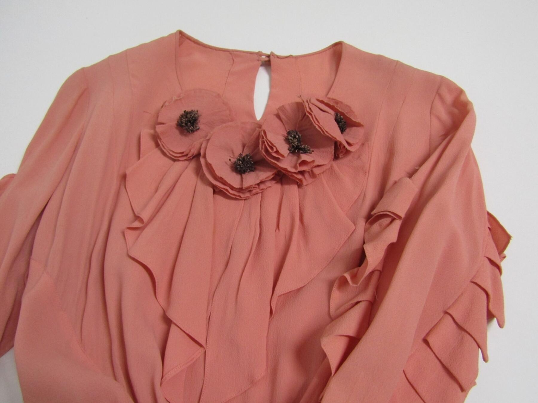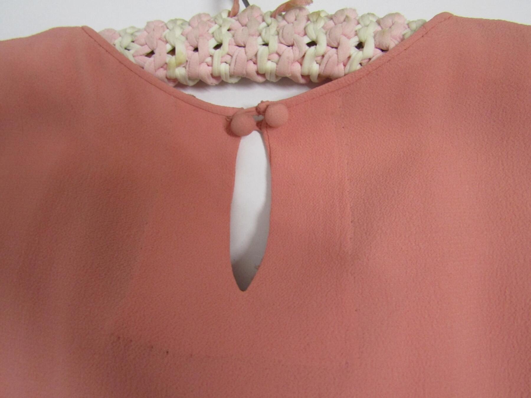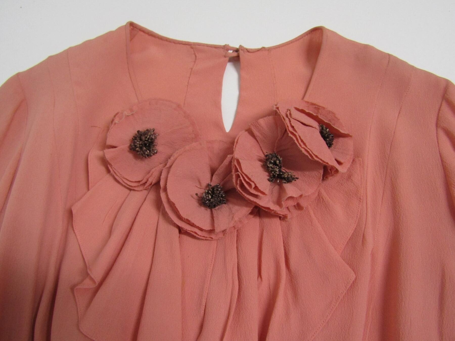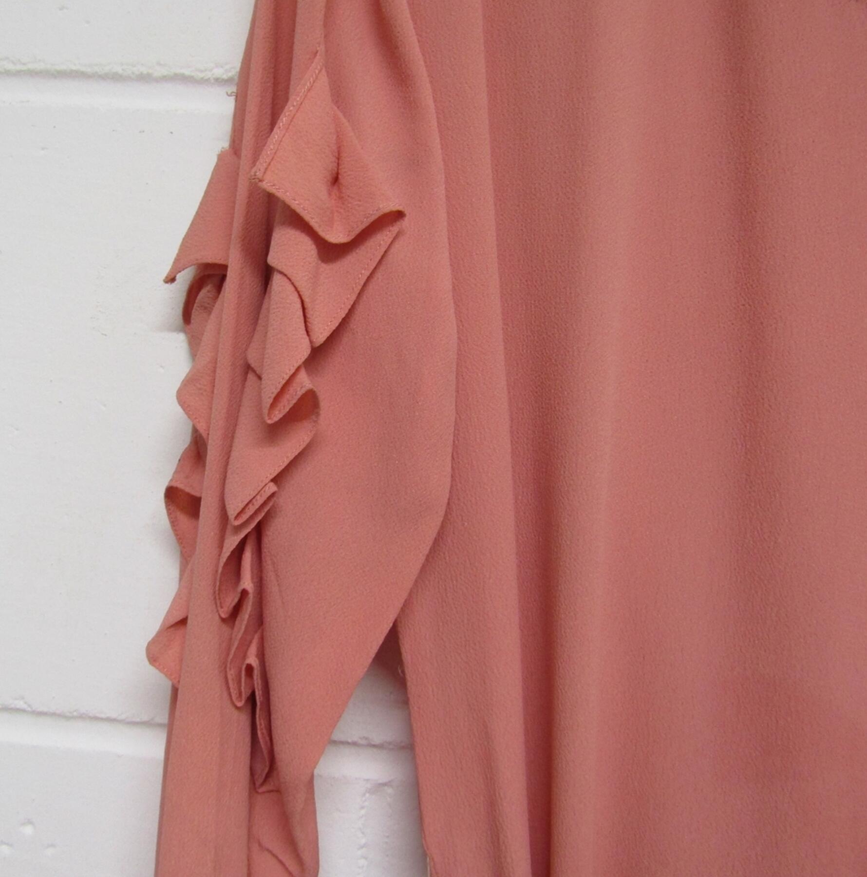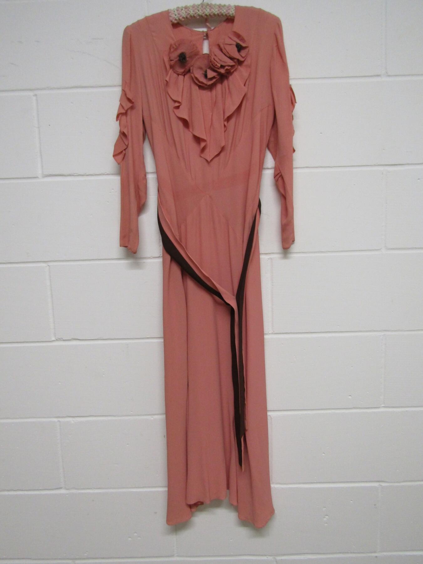 A 1930's pink crepe tea dance dress with pink and brown flowered neckline