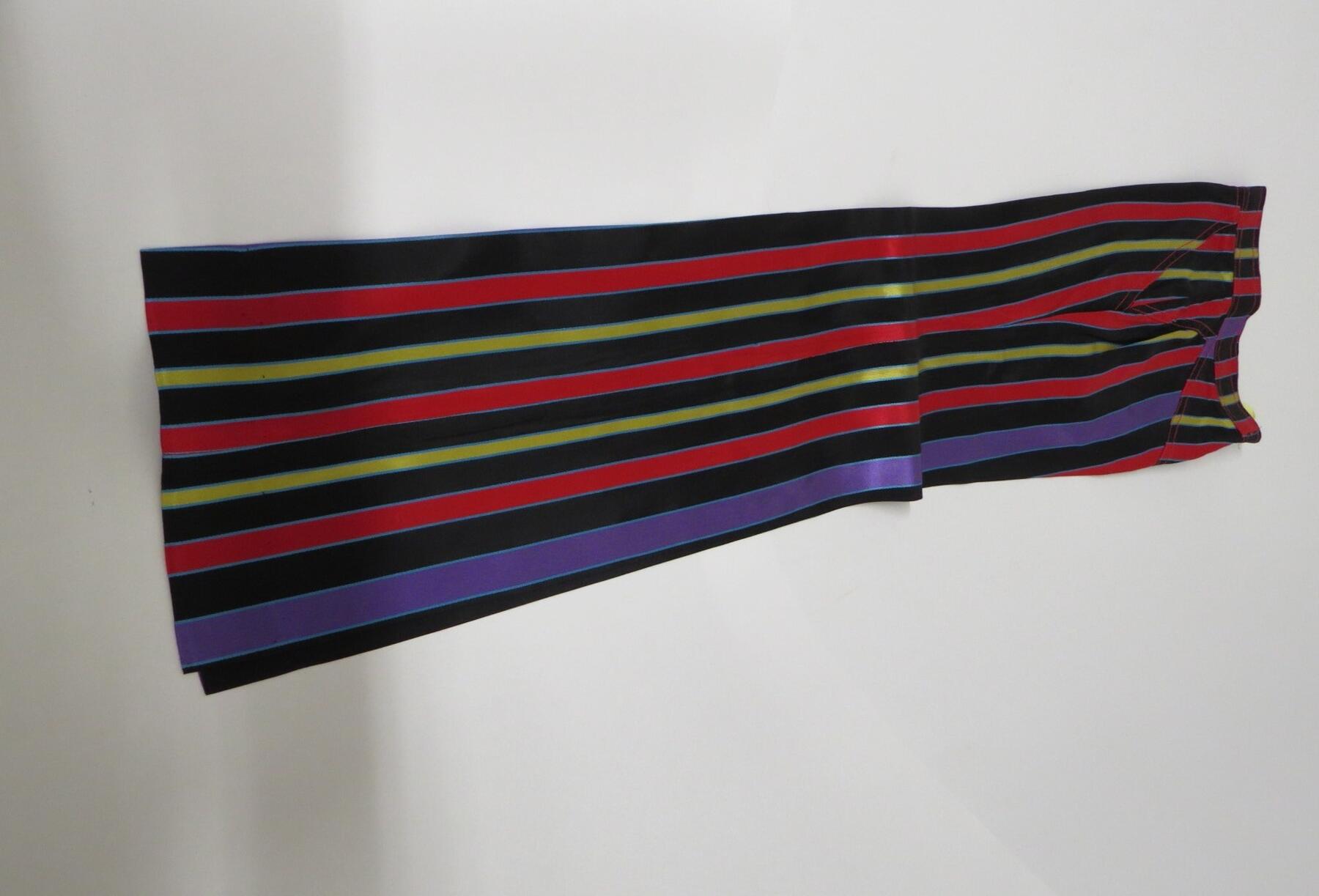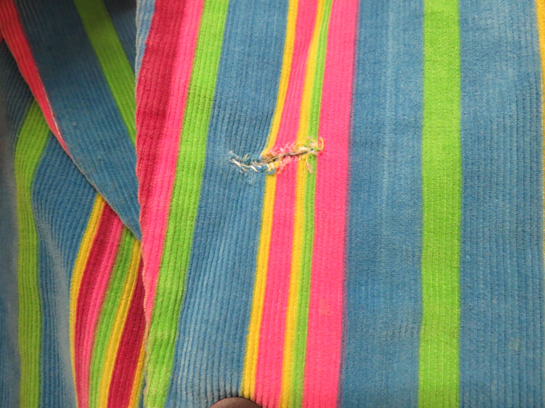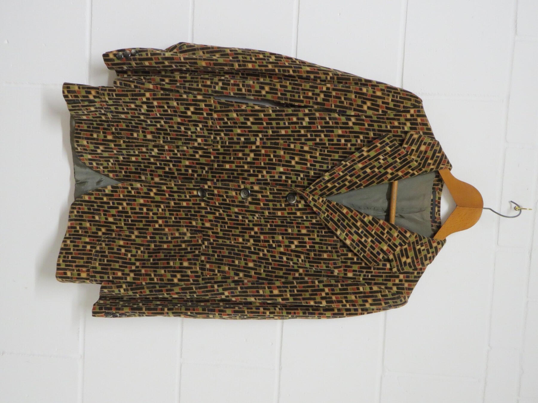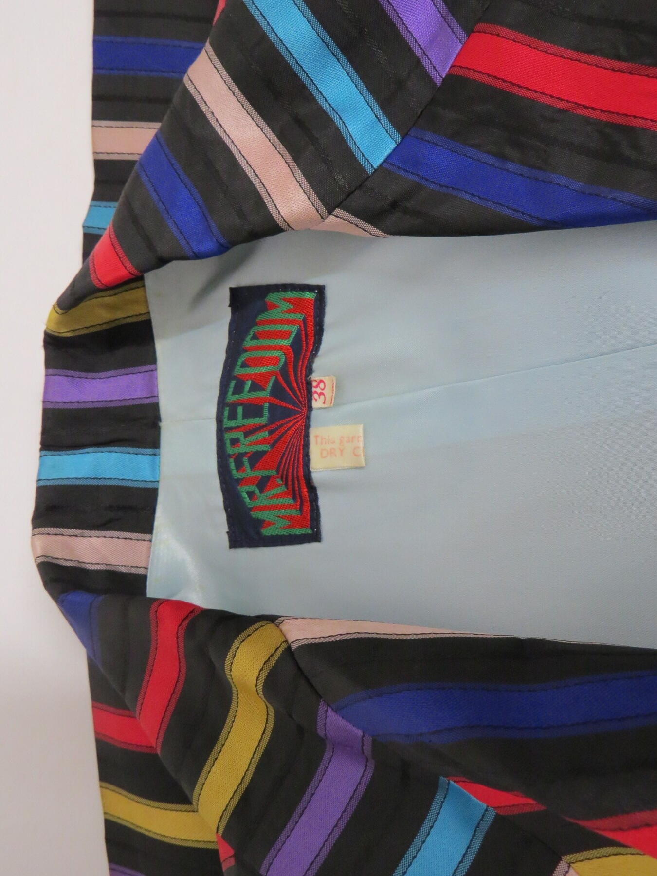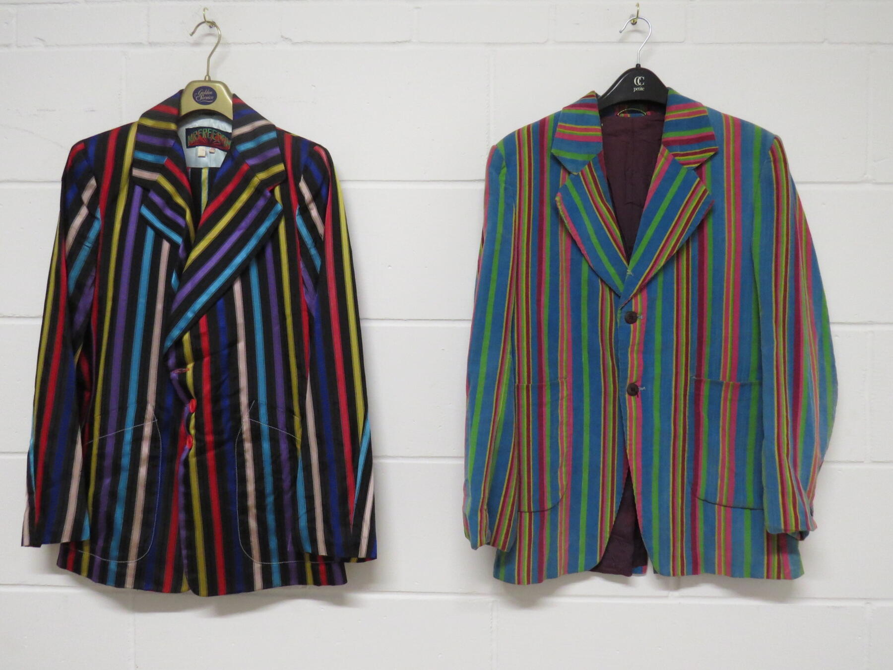 A 1960's iconic multicoloured gents striped suit and two 1960's velvet jackets, multi coloured stripe and brown green, red pattern (3)