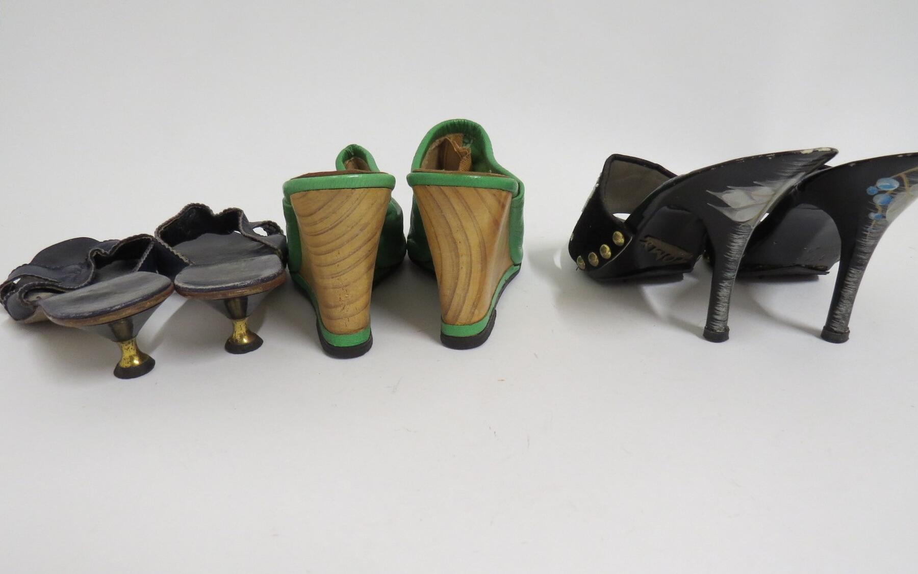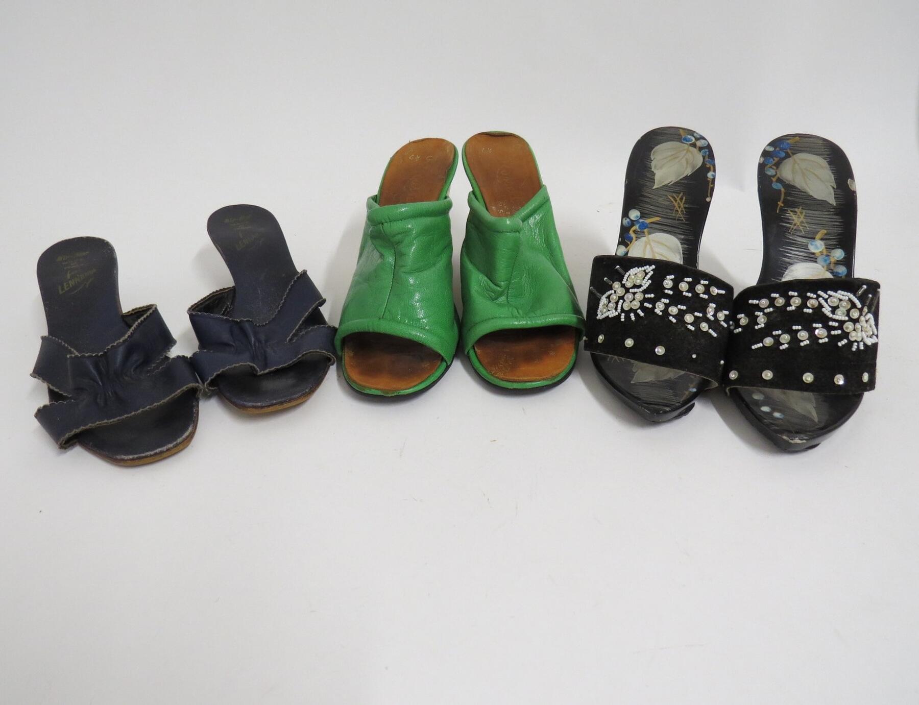 A pair of 1970's green leather wedge slip-ons, 60's navy leather mules with low kitten heels and a pair of ''Tomy Dakao'', Saigon, pointed toed high heel mules