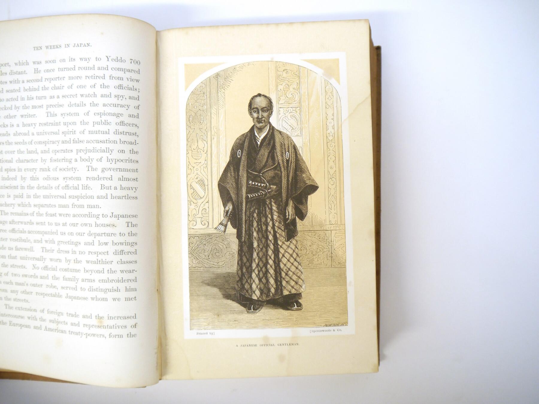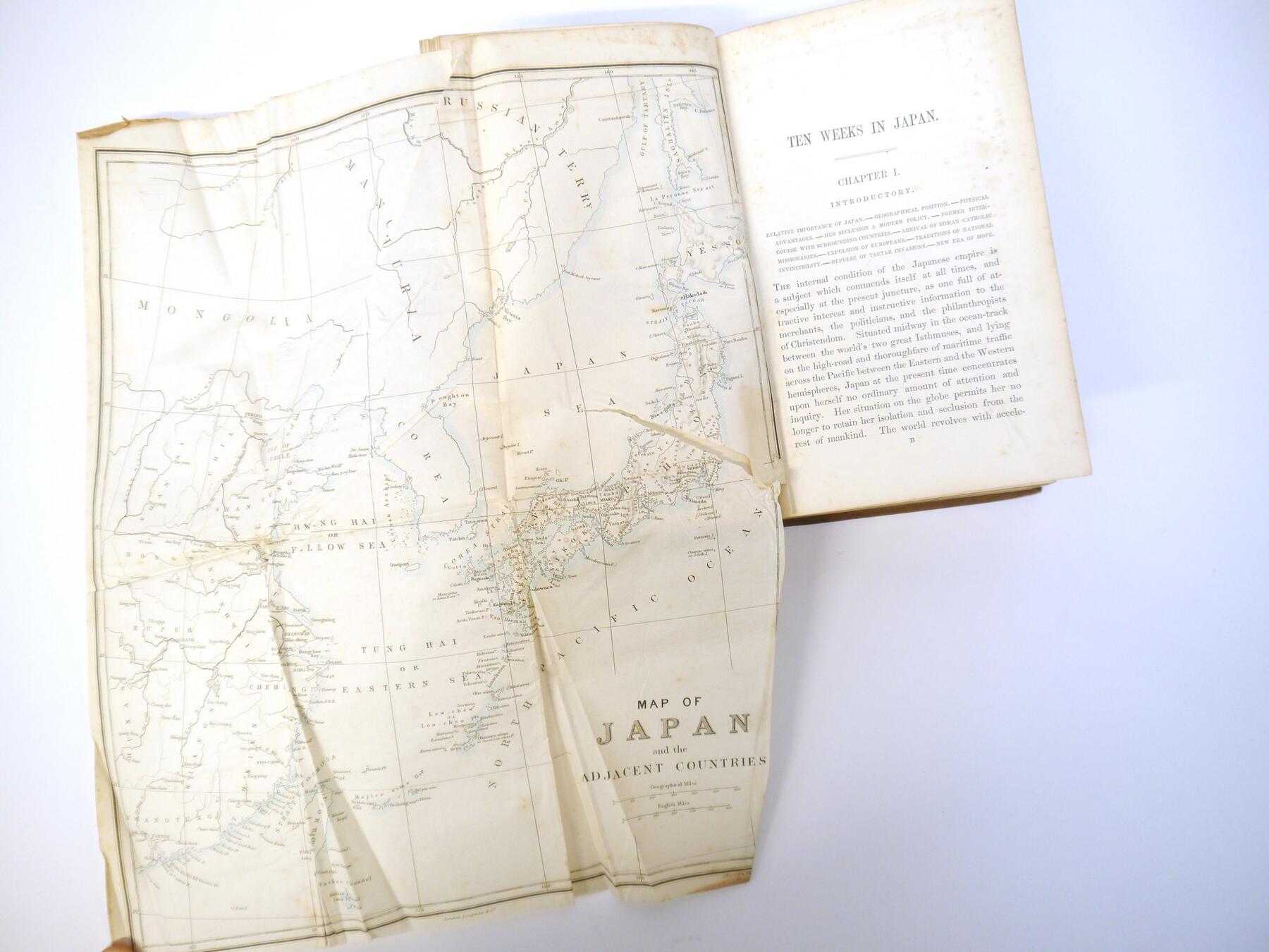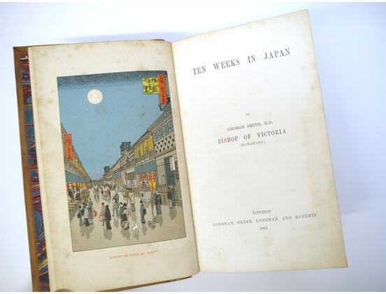 George Smith: 'Ten Weeks in Japan', London, Longman, Green et al, 1861, 1st edition, folding map and eleven plates (of which eight tinted wood plates as call for plus three additional coloured plates not listed), contemporary prize leather binding gilt, all edges gilt
