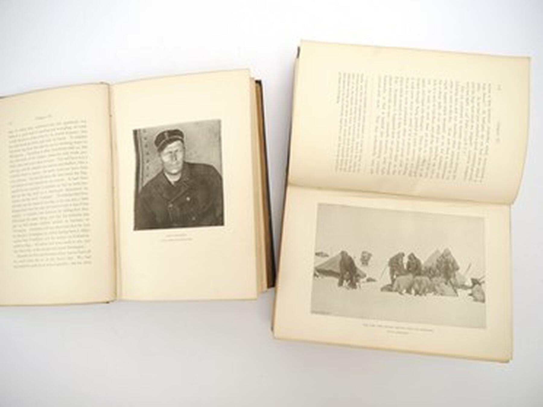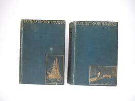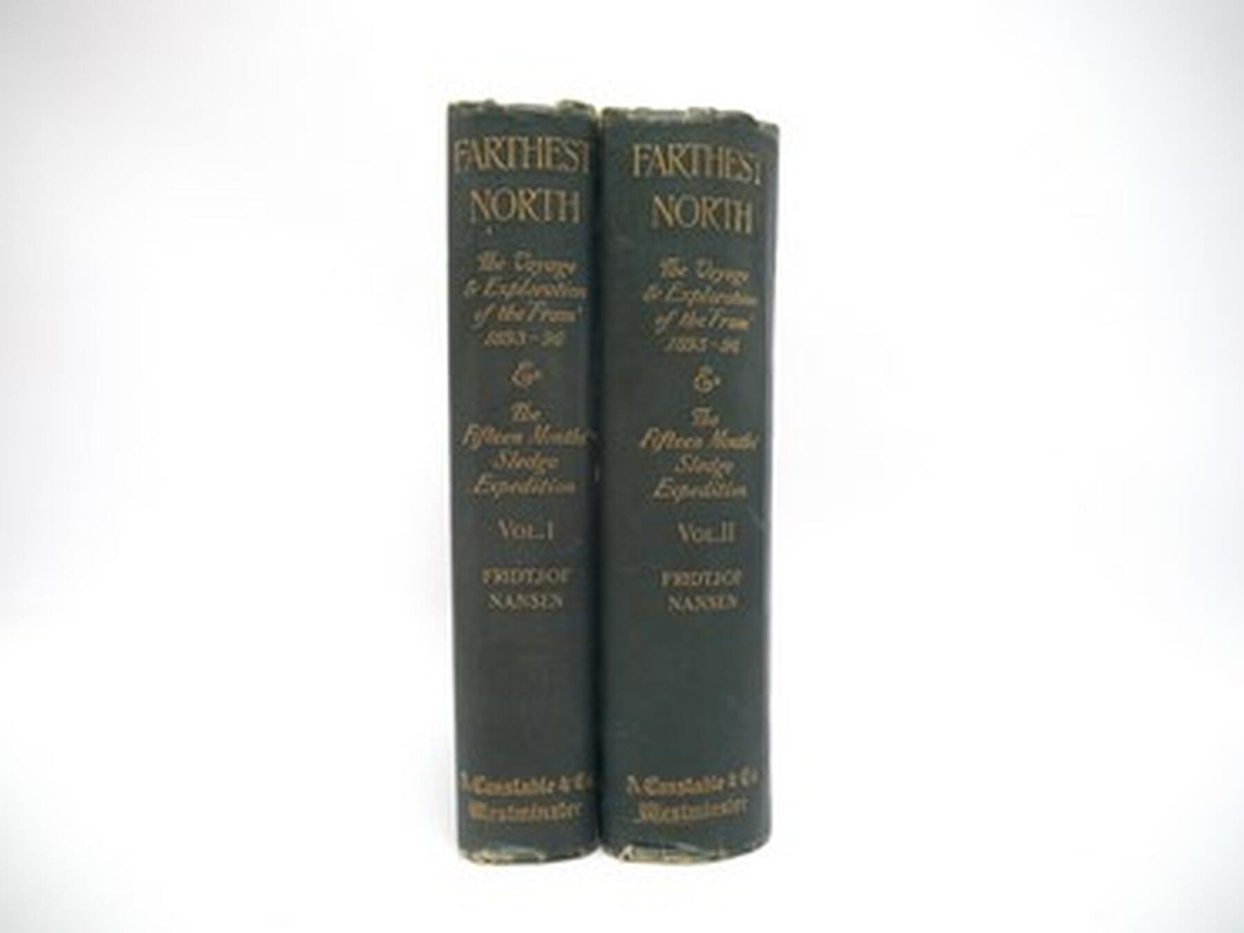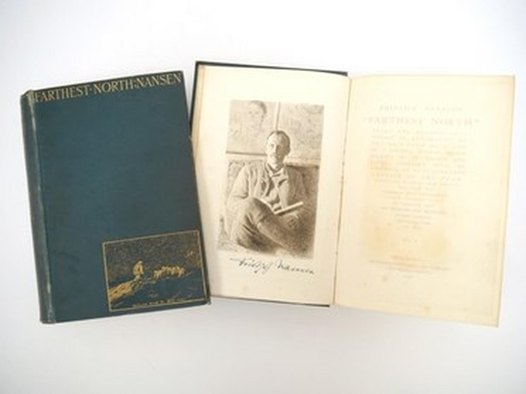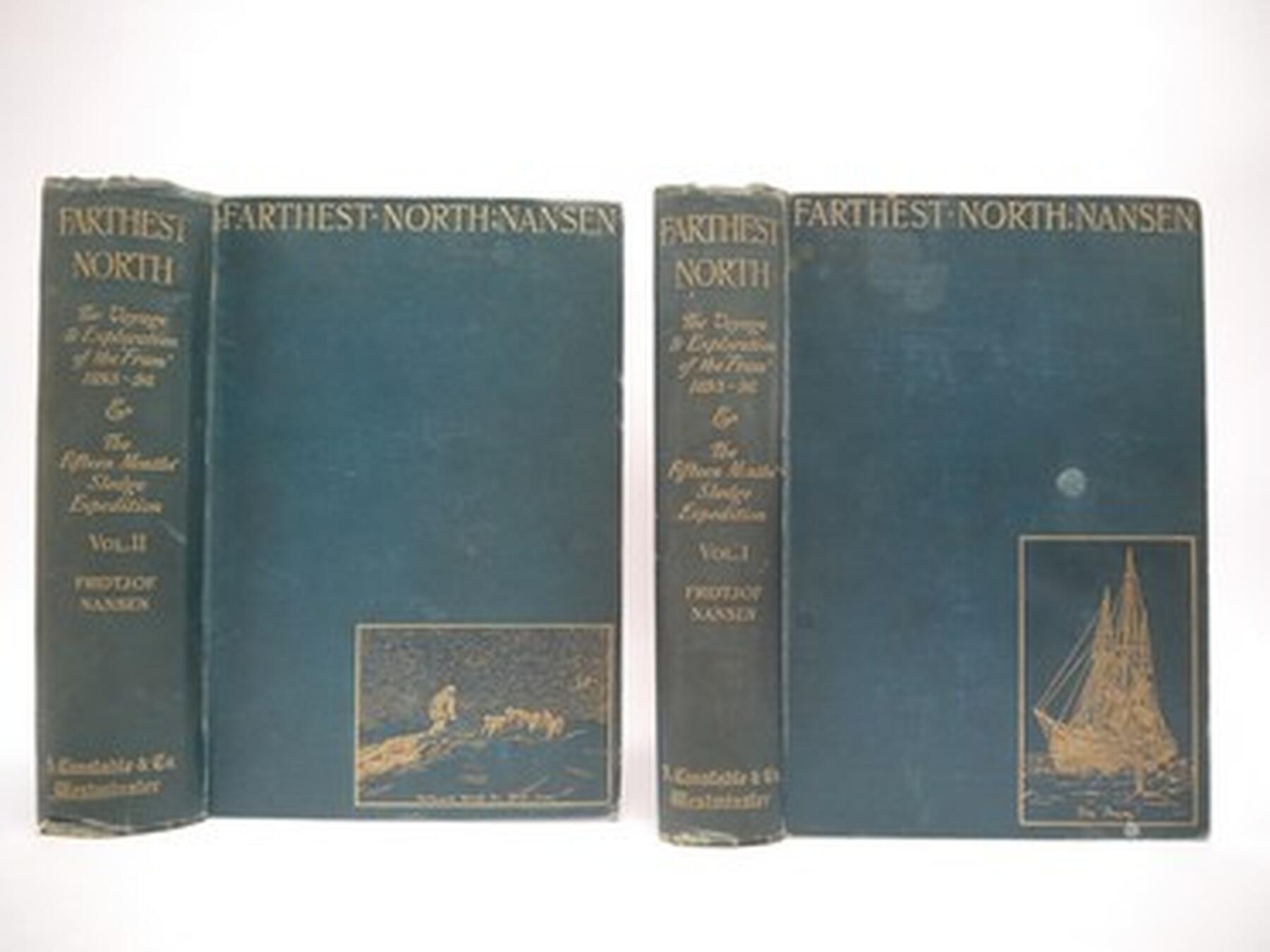 Fridtjof Nansen: 'Farthest North', London, Archibald Constable, 1897, 1st edition, 2 volumes, signed by Nansen in blue ink at foot of frontispiece in volume 1, etched frontispiece to volume 1, photogravure frontispiece to volume 2, 127 plates of which 16 in colour, 92 illustrations to the text, 4 folding colour maps as called for; title pages printed in red and black, original pictorial cloth gilt (2)