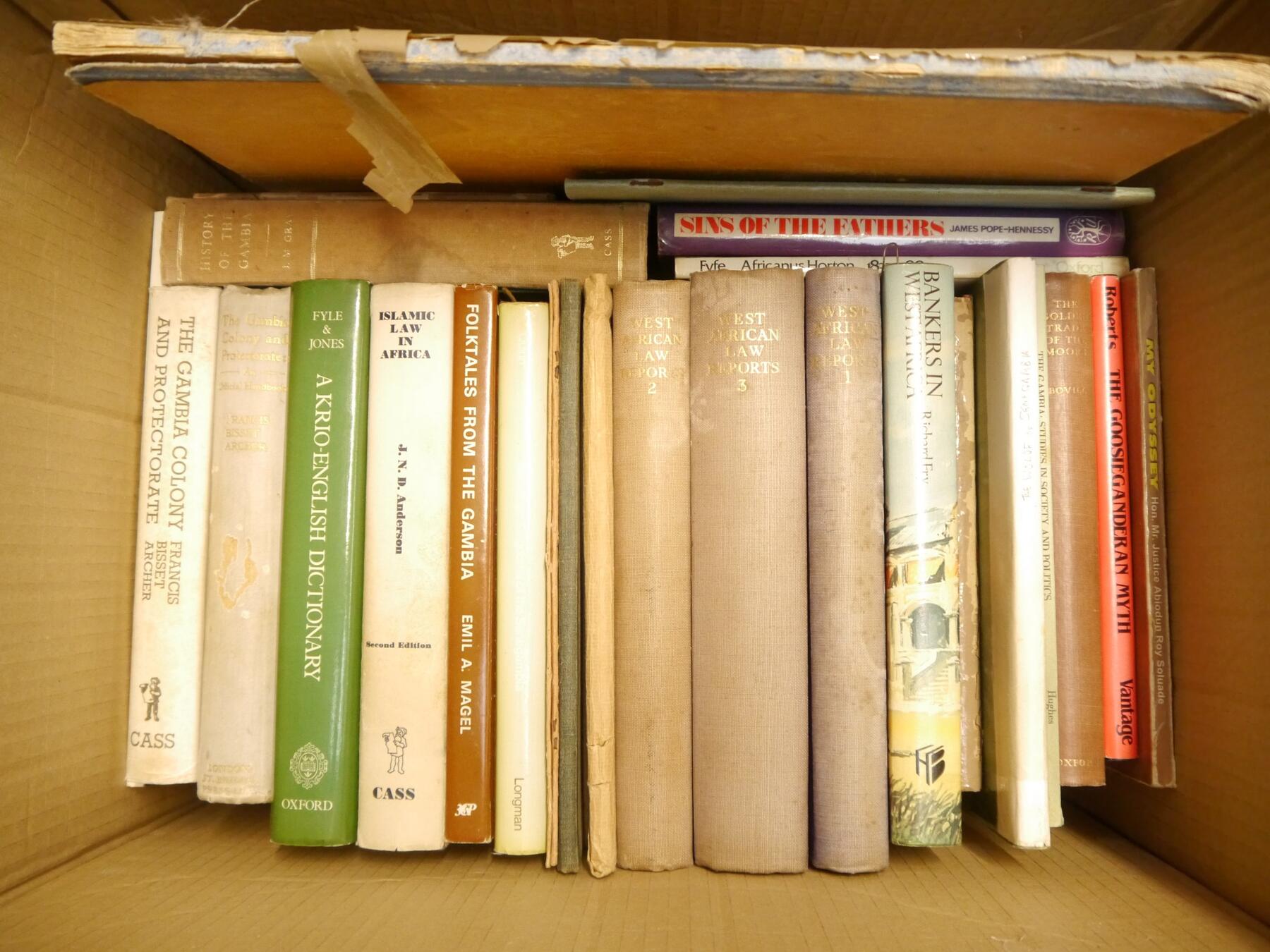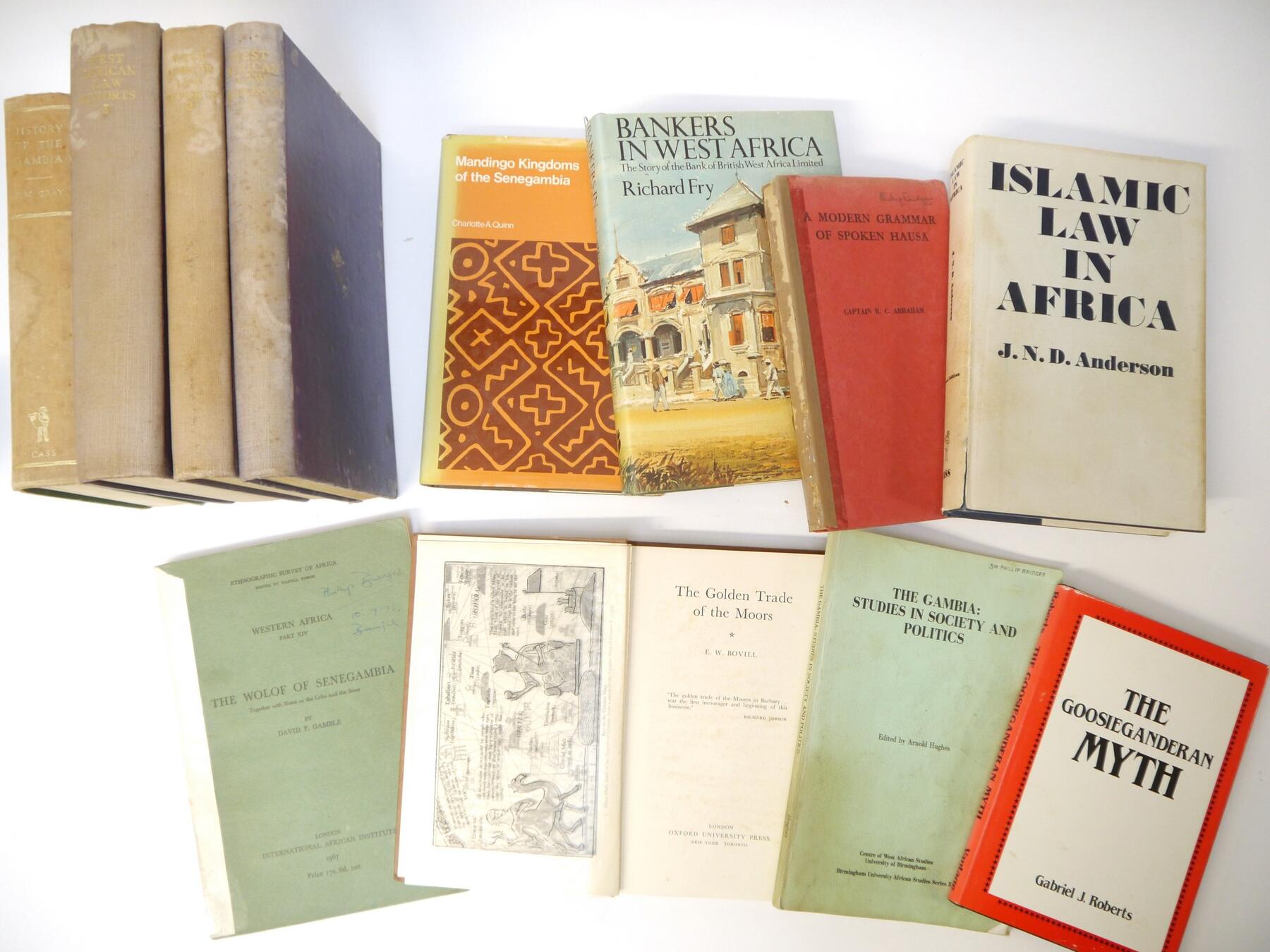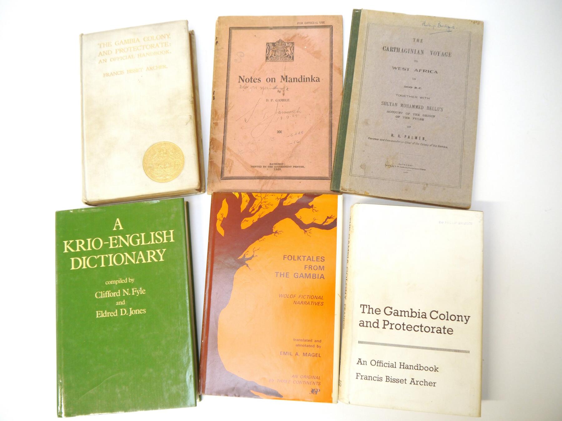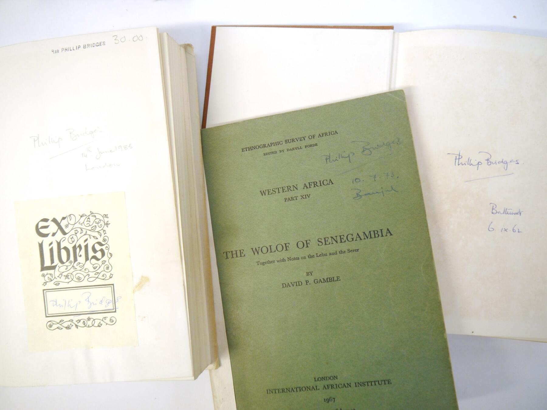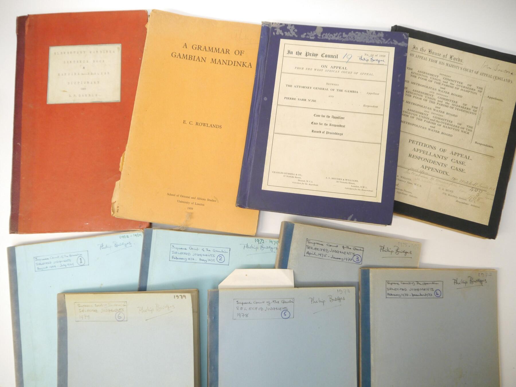 A collection of 70+ books and booklets on The Gambia and West Africa, ex libris Sir Phillip Rodney Bridges (1922-2007) Chief Justice of the Gambia from 1968-1983, many with his ownership signatures and inscriptions/ book plates/ ink stamps to top page edges, plus nine volumes of typed selected judgements from the Supreme Court of the Gambia 1968-1982, each with Bridges' signature and manuscript title on top wrap and his manuscript indexes at front, three folders typed notes similar, books include Francis Bisset Archer: 'The Gambia Colony and Protectorate: An Official Handbook', London, St Bride's Press, [1905], 1st edition, port frontis and two folding maps and numerous illustrations throughout as called for, 364pp, original cloth gilt, all edges gilt; 1967 new impression of the same work, two folding maps, folding table and illustrations as called for, original cloth gilt, dust wrapper, Bridge's ownership ink stamp to dust wrapper, ownership signature and inscription to FFEP and book plate to front paste down; 'The Gambia Currency Board', bound volume containing First Issue of Currency Notes, 5th October, 1964, six bank notes mounted on printed card leaves, oblong, crushed green morocco gilt by Sangorski & Sutcliffe, in original printed envelope marked for Bridges; Gamble: 'Notes on Mandinka', Bathurst, 1949, original printed wraps; H.R. Palmer: 'The Carthaginian Voyage to West Africa in 500 B.C.', Bathurst, 1931, xiii, 51pp, original cloth backed boards; plus numerous others folktales, Mandingo Kingdoms of the Senegambia, Wolof language, Krio-English dictionary, Ornithology, West African Law, Atlas of Gold Coast, Acora, 1945, plus W. African folding map, 1966, Gambian History, religion etc, plus a packet containing a quantity of Gambian stamp covers, Sir Phillip Bridges served in the Royal Artillery circa 1940-46, was attached to the RWAFF and served with them in Burma, and fought in the Arakan campaign involving a five month journey crossing ten rivers. After military service he was posted to the Gambia as a lands officer, becoming Attorney General in 1964, he helped draft the Gambian constitution prior to independence in 1965, remaining in his post until 1968 being the only European in the Gambian cabinet after independence. He was appointed Chief Justice of the Gambia in 1968 and earned a reputation for fairness, tolerance and kindness. He retired to England in 1983 and died in December 2007 in Suffolk