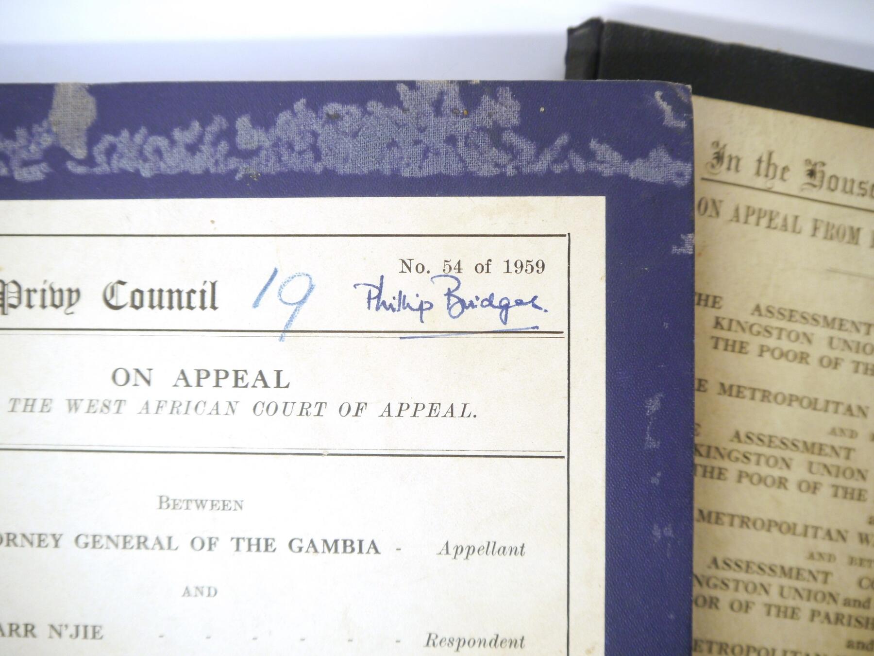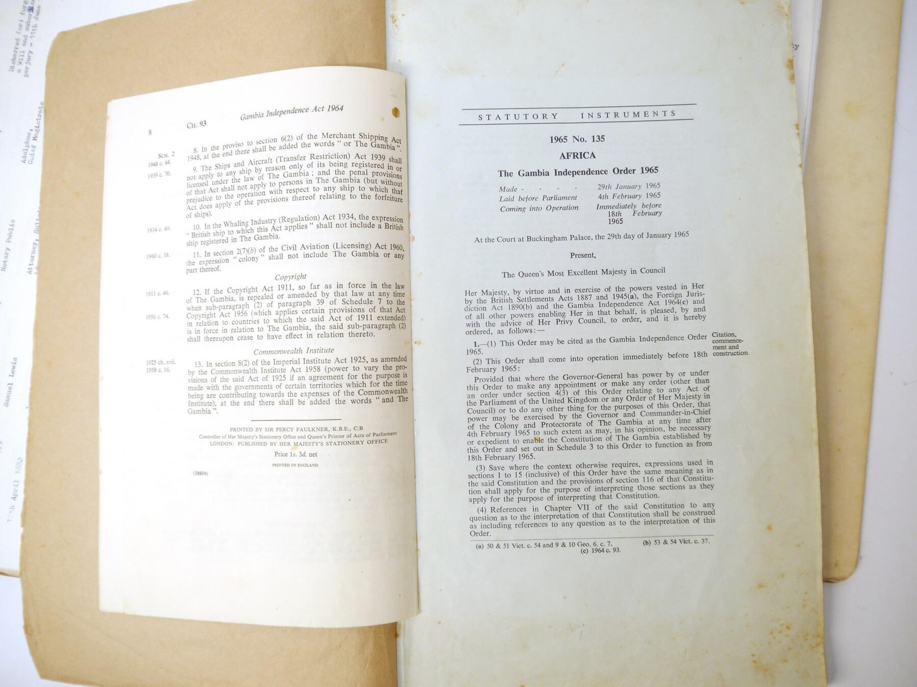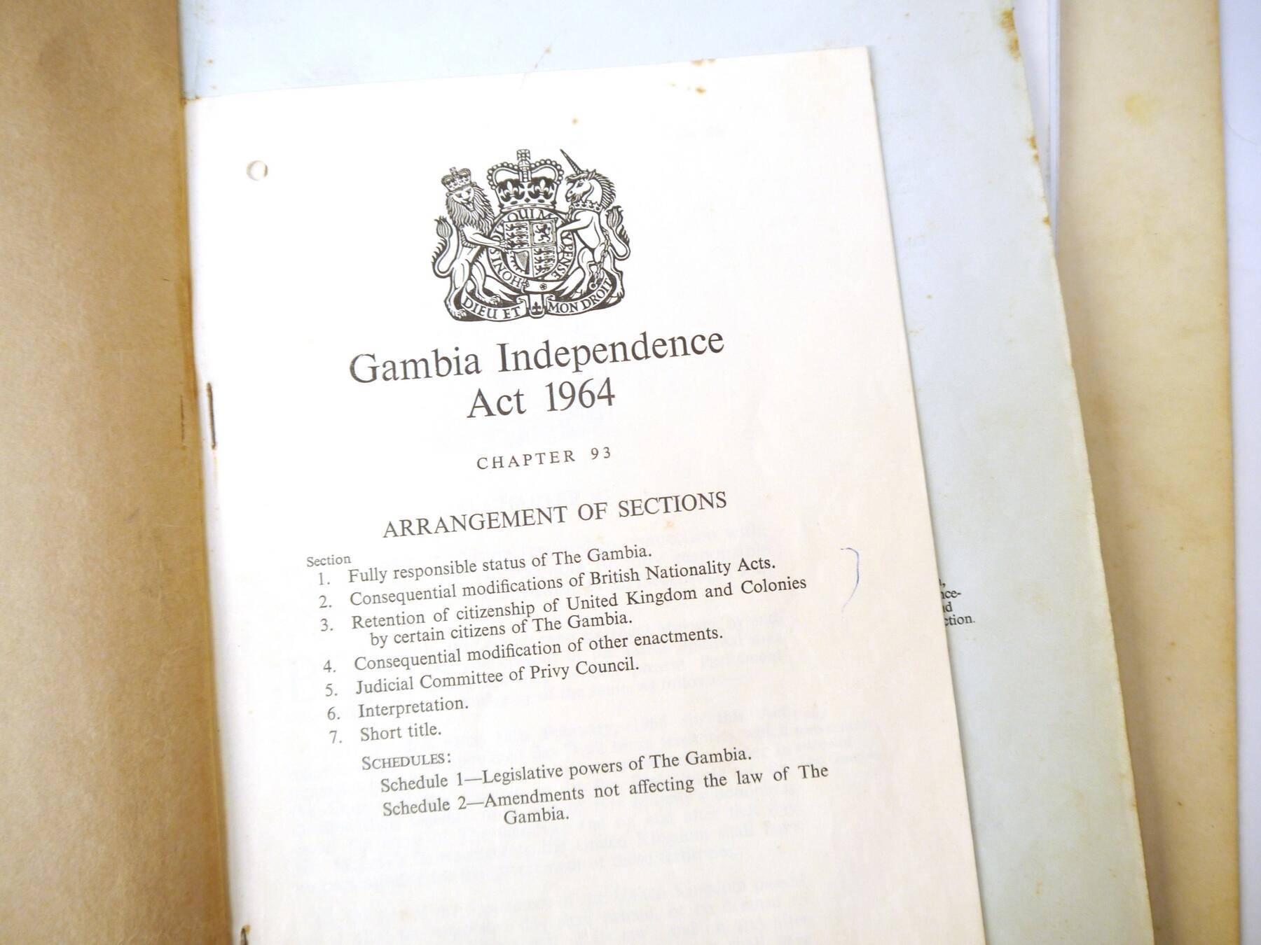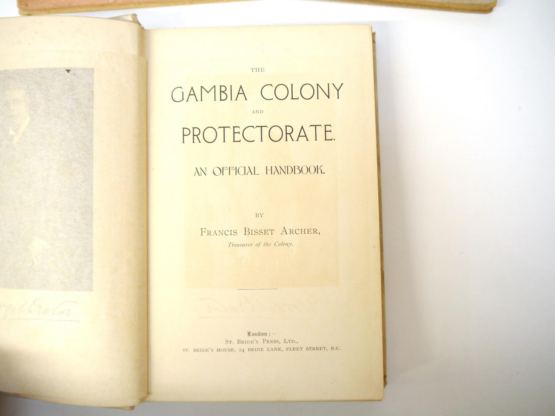 A collection of 70+ books and booklets on The Gambia and West Africa, ex libris Sir Phillip Rodney Bridges (1922-2007) Chief Justice of the Gambia from 1968-1983, many with his ownership signatures and inscriptions/ book plates/ ink stamps to top page edges, plus nine volumes of typed selected judgements from the Supreme Court of the Gambia 1968-1982, each with Bridges' signature and manuscript title on top wrap and his manuscript indexes at front, three folders typed notes similar, books include Francis Bisset Archer: 'The Gambia Colony and Protectorate: An Official Handbook', London, St Bride's Press, [1905], 1st edition, port frontis and two folding maps and numerous illustrations throughout as called for, 364pp, original cloth gilt, all edges gilt; 1967 new impression of the same work, two folding maps, folding table and illustrations as called for, original cloth gilt, dust wrapper, Bridge's ownership ink stamp to dust wrapper, ownership signature and inscription to FFEP and book plate to front paste down; 'The Gambia Currency Board', bound volume containing First Issue of Currency Notes, 5th October, 1964, six bank notes mounted on printed card leaves, oblong, crushed green morocco gilt by Sangorski & Sutcliffe, in original printed envelope marked for Bridges; Gamble: 'Notes on Mandinka', Bathurst, 1949, original printed wraps; H.R. Palmer: 'The Carthaginian Voyage to West Africa in 500 B.C.', Bathurst, 1931, xiii, 51pp, original cloth backed boards; plus numerous others folktales, Mandingo Kingdoms of the Senegambia, Wolof language, Krio-English dictionary, Ornithology, West African Law, Atlas of Gold Coast, Acora, 1945, plus W. African folding map, 1966, Gambian History, religion etc, plus a packet containing a quantity of Gambian stamp covers, Sir Phillip Bridges served in the Royal Artillery circa 1940-46, was attached to the RWAFF and served with them in Burma, and fought in the Arakan campaign involving a five month journey crossing ten rivers. After military service he was posted to the Gambia as a lands officer, becoming Attorney General in 1964, he helped draft the Gambian constitution prior to independence in 1965, remaining in his post until 1968 being the only European in the Gambian cabinet after independence. He was appointed Chief Justice of the Gambia in 1968 and earned a reputation for fairness, tolerance and kindness. He retired to England in 1983 and died in December 2007 in Suffolk