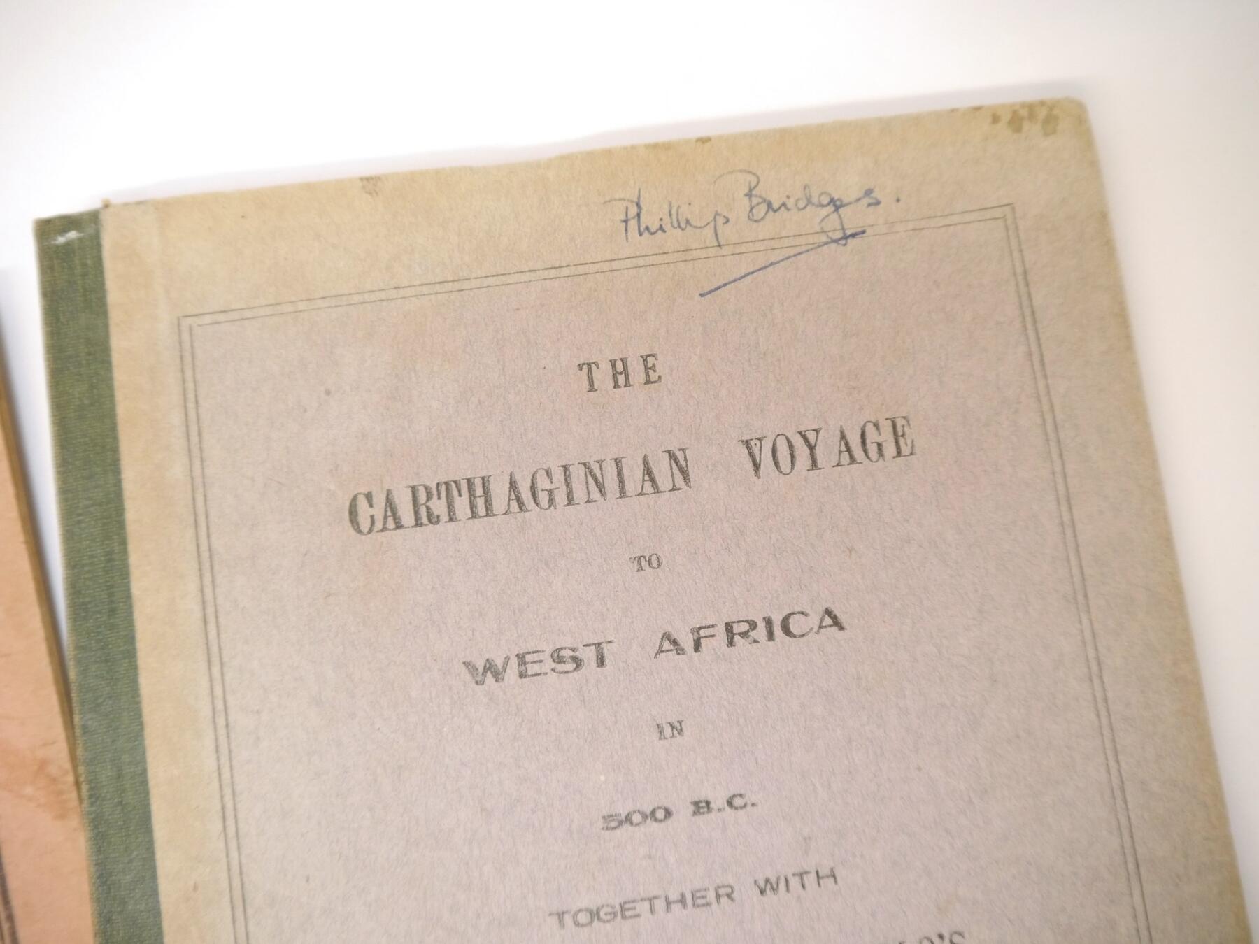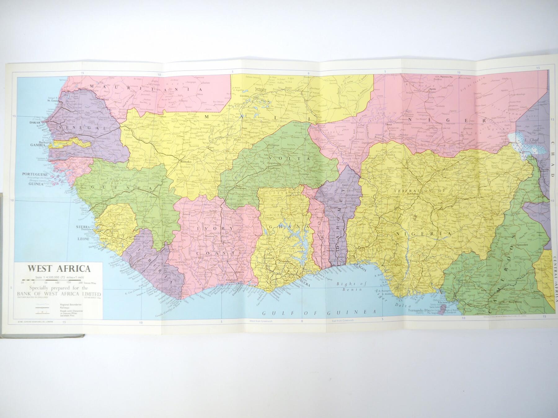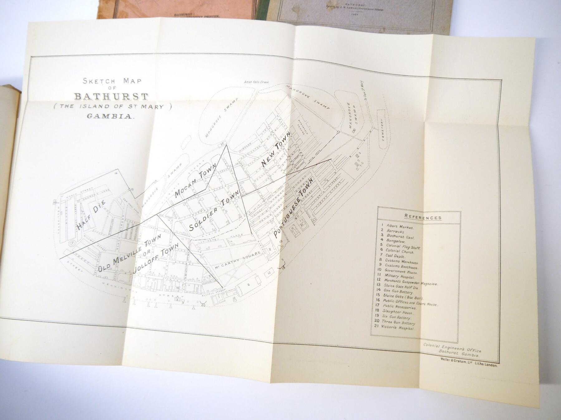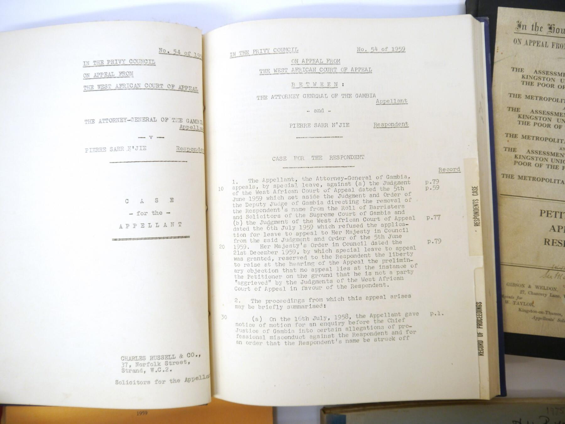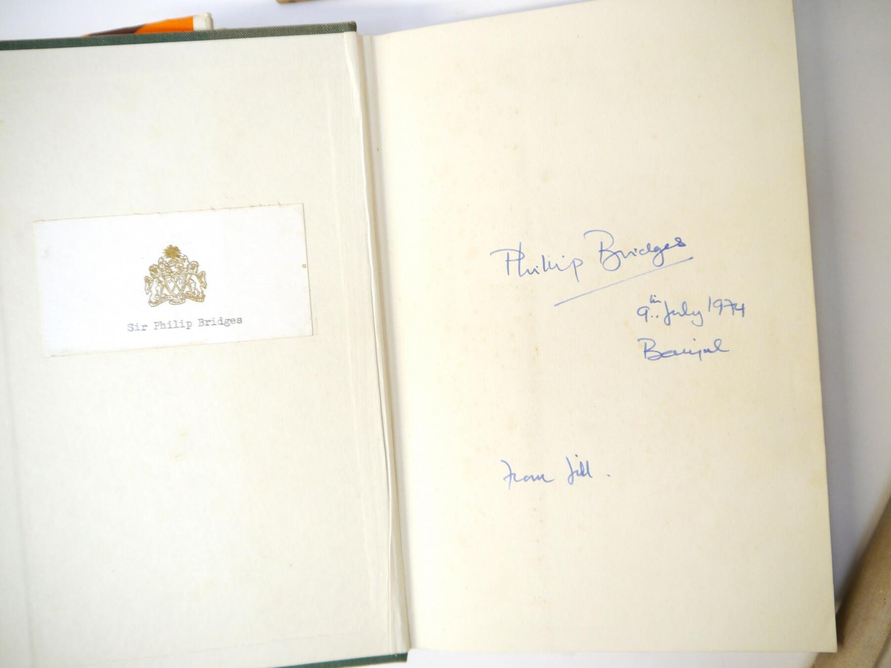 A collection of 70+ books and booklets on The Gambia and West Africa, ex libris Sir Phillip Rodney Bridges (1922-2007) Chief Justice of the Gambia from 1968-1983, many with his ownership signatures and inscriptions/ book plates/ ink stamps to top page edges, plus nine volumes of typed selected judgements from the Supreme Court of the Gambia 1968-1982, each with Bridges' signature and manuscript title on top wrap and his manuscript indexes at front, three folders typed notes similar, books include Francis Bisset Archer: 'The Gambia Colony and Protectorate: An Official Handbook', London, St Bride's Press, [1905], 1st edition, port frontis and two folding maps and numerous illustrations throughout as called for, 364pp, original cloth gilt, all edges gilt; 1967 new impression of the same work, two folding maps, folding table and illustrations as called for, original cloth gilt, dust wrapper, Bridge's ownership ink stamp to dust wrapper, ownership signature and inscription to FFEP and book plate to front paste down; 'The Gambia Currency Board', bound volume containing First Issue of Currency Notes, 5th October, 1964, six bank notes mounted on printed card leaves, oblong, crushed green morocco gilt by Sangorski & Sutcliffe, in original printed envelope marked for Bridges; Gamble: 'Notes on Mandinka', Bathurst, 1949, original printed wraps; H.R. Palmer: 'The Carthaginian Voyage to West Africa in 500 B.C.', Bathurst, 1931, xiii, 51pp, original cloth backed boards; plus numerous others folktales, Mandingo Kingdoms of the Senegambia, Wolof language, Krio-English dictionary, Ornithology, West African Law, Atlas of Gold Coast, Acora, 1945, plus W. African folding map, 1966, Gambian History, religion etc, plus a packet containing a quantity of Gambian stamp covers, Sir Phillip Bridges served in the Royal Artillery circa 1940-46, was attached to the RWAFF and served with them in Burma, and fought in the Arakan campaign involving a five month journey crossing ten rivers. After military service he was posted to the Gambia as a lands officer, becoming Attorney General in 1964, he helped draft the Gambian constitution prior to independence in 1965, remaining in his post until 1968 being the only European in the Gambian cabinet after independence. He was appointed Chief Justice of the Gambia in 1968 and earned a reputation for fairness, tolerance and kindness. He retired to England in 1983 and died in December 2007 in Suffolk
