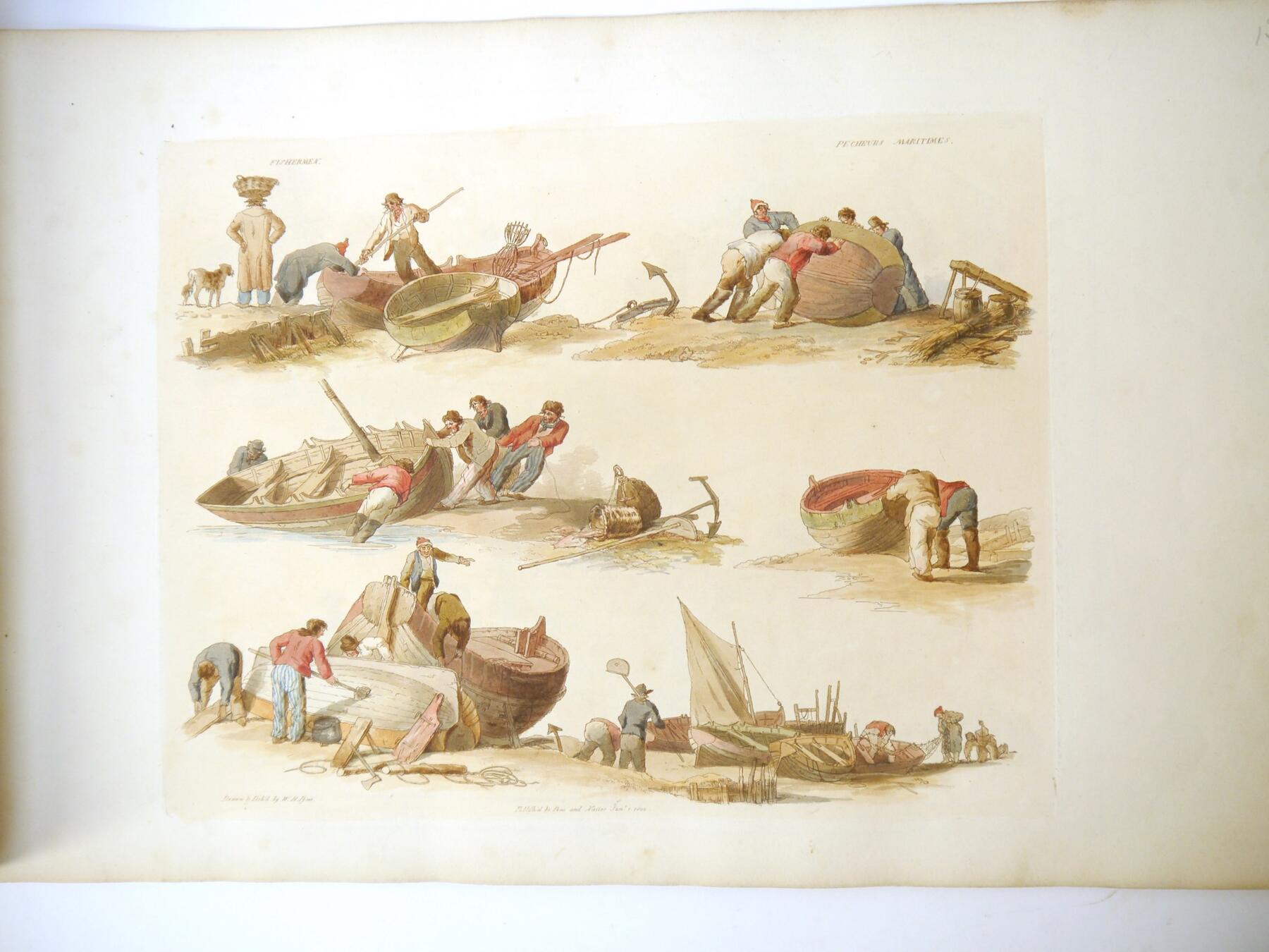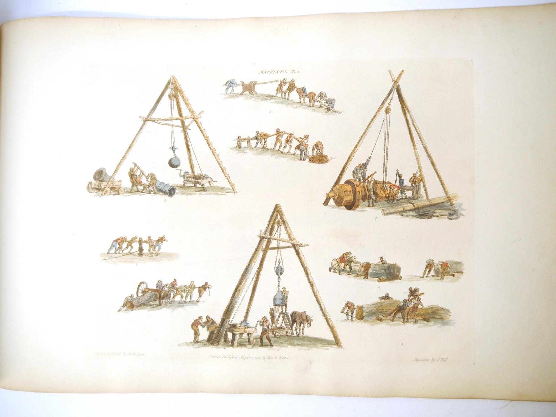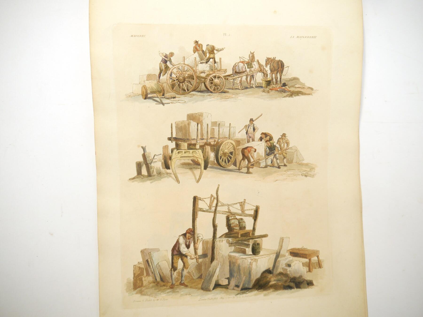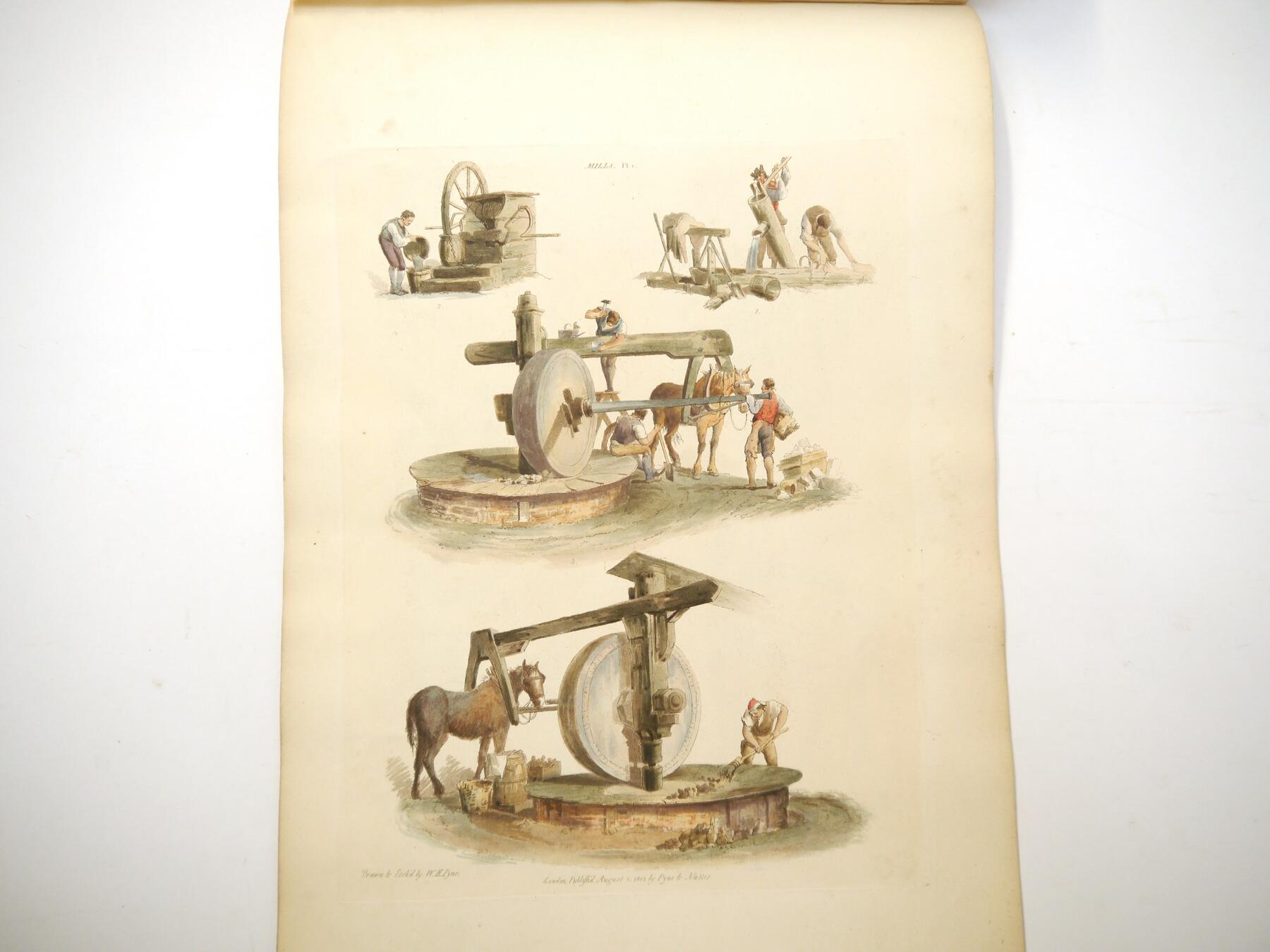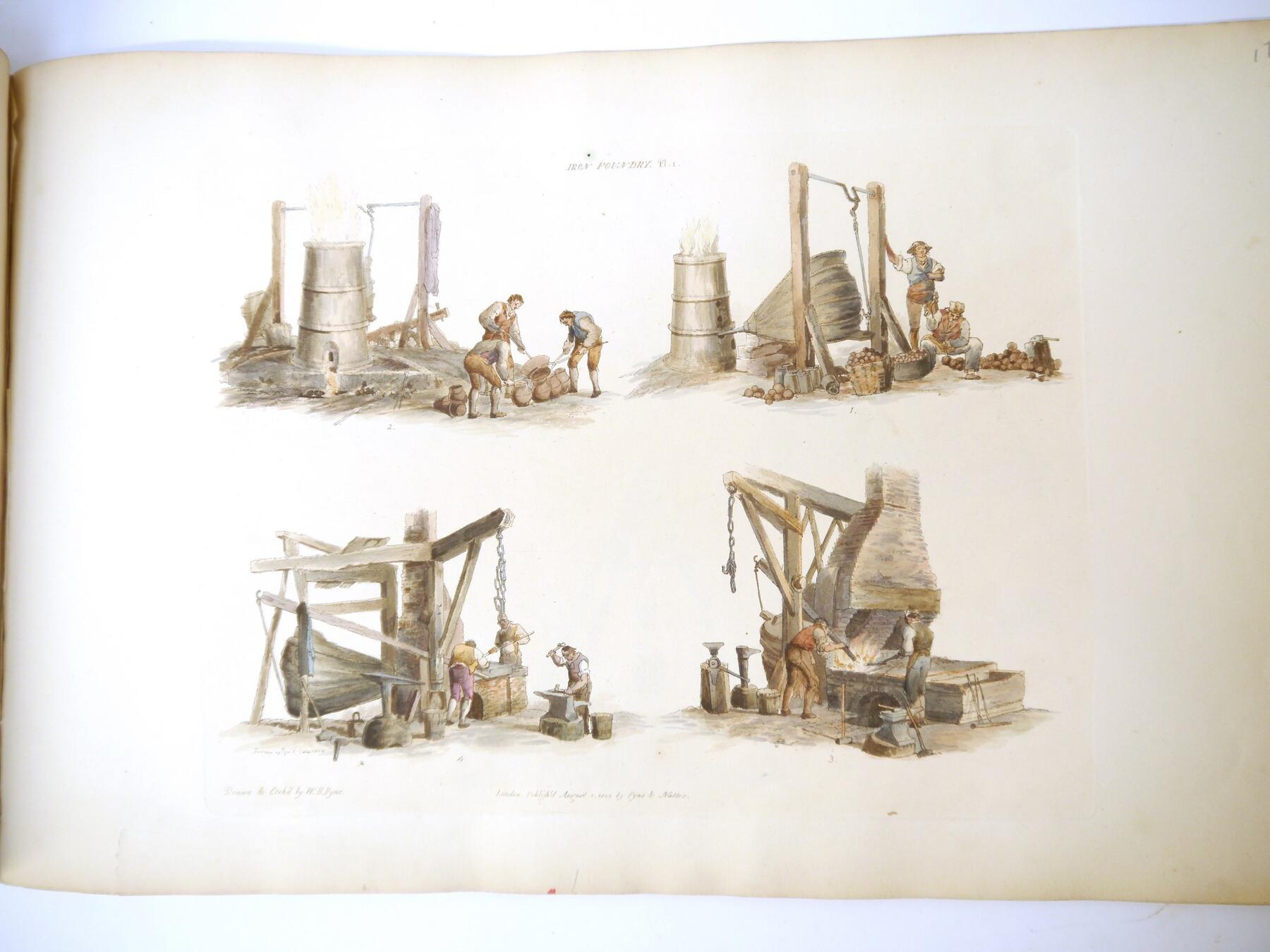 W H Pyne: 'Microcosm: or, A Picturesque Delineation of the Arts, Agriculture, Manufacturer, & c of Great Britain', 1806, a/f sold as a series of plates only, 26 hand coloured aquatint plates only (one of which with closed tear, others VGC), depicting fishermen, blacksmiths, masons, millers, agriculture, sail makers, potters, sawing, wagons, woodmen, shepherds etc, disbound oblong folio, title page loose/creased, several plates loose