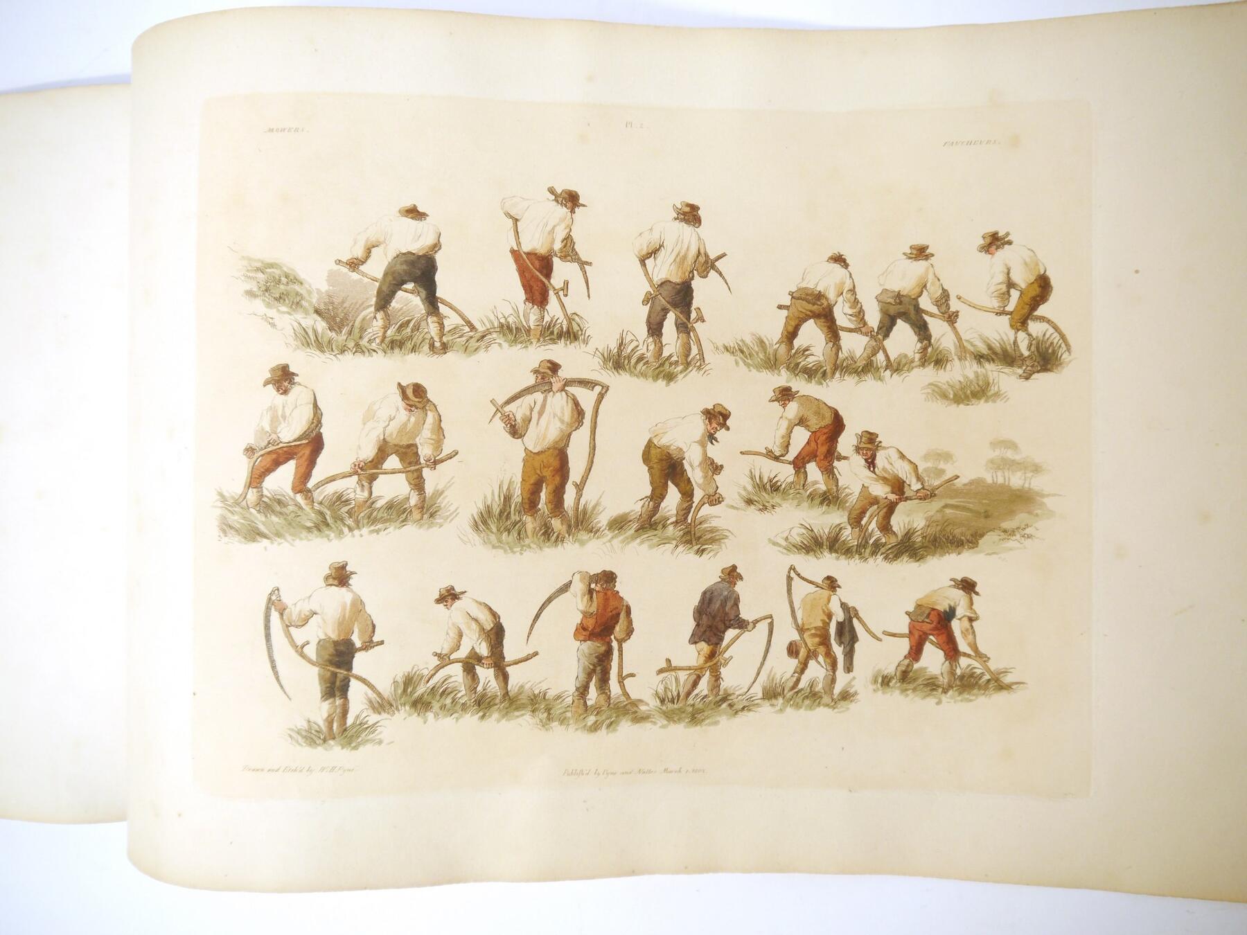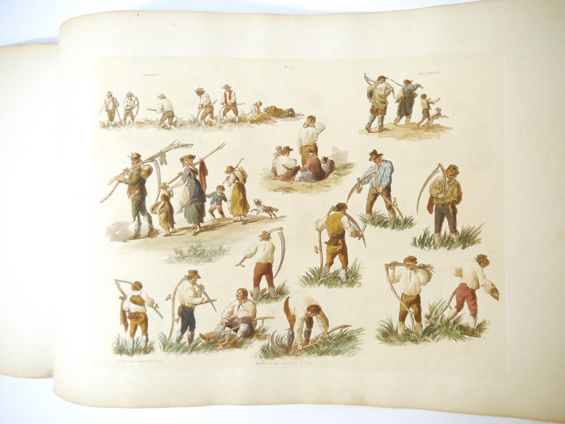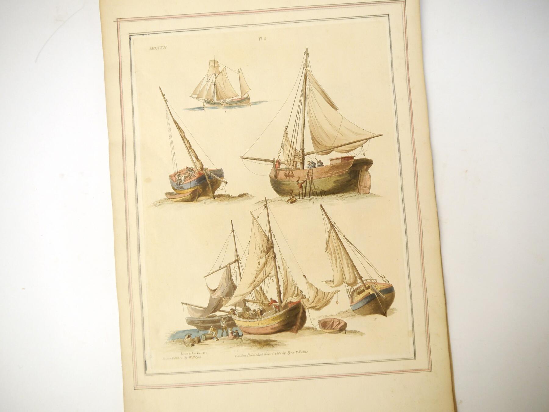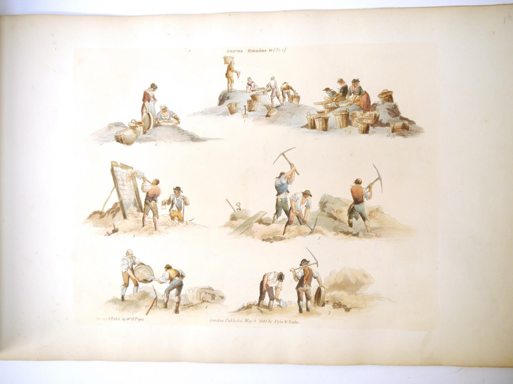 W H Pyne: 'Microcosm: or, A Picturesque Delineation of the Arts, Agriculture, Manufacturer, & c of Great Britain', 1806, a/f sold as a series of plates only, 26 hand coloured aquatint plates only (one of which with closed tear, others VGC), depicting fishermen, blacksmiths, masons, millers, agriculture, sail makers, potters, sawing, wagons, woodmen, shepherds etc, disbound oblong folio, title page loose/creased, several plates loose