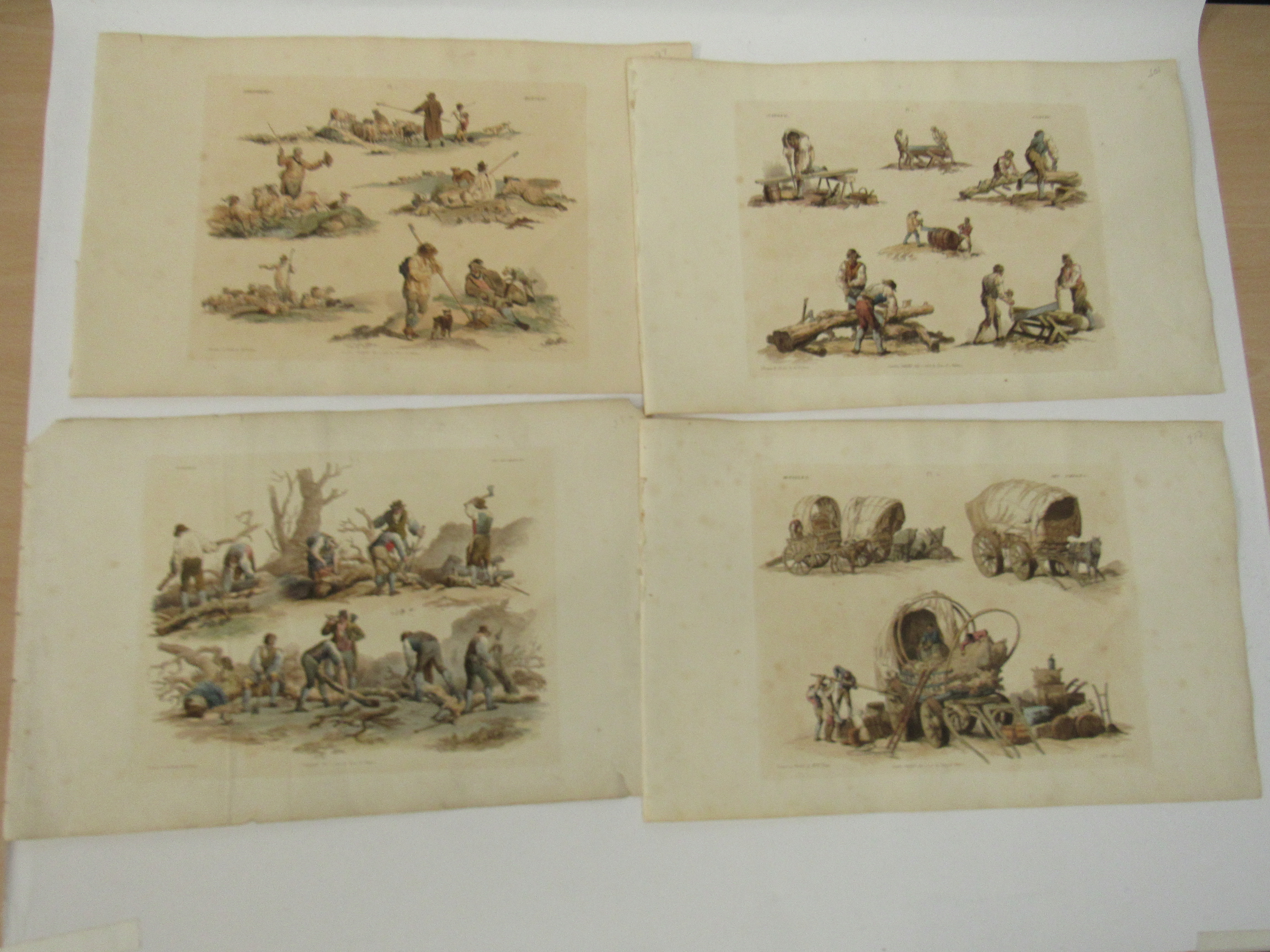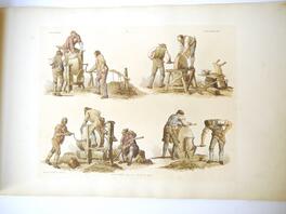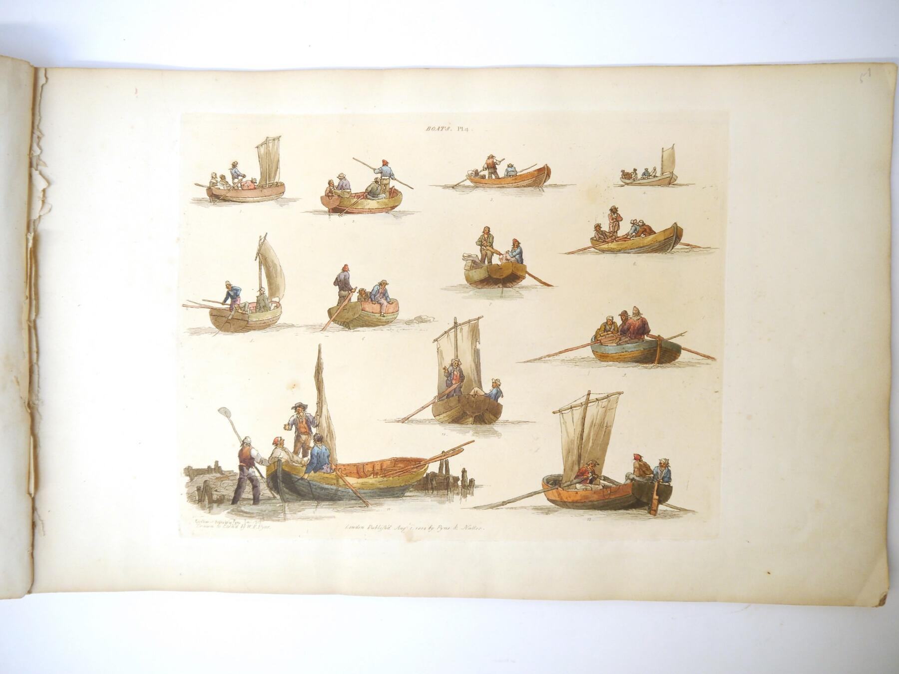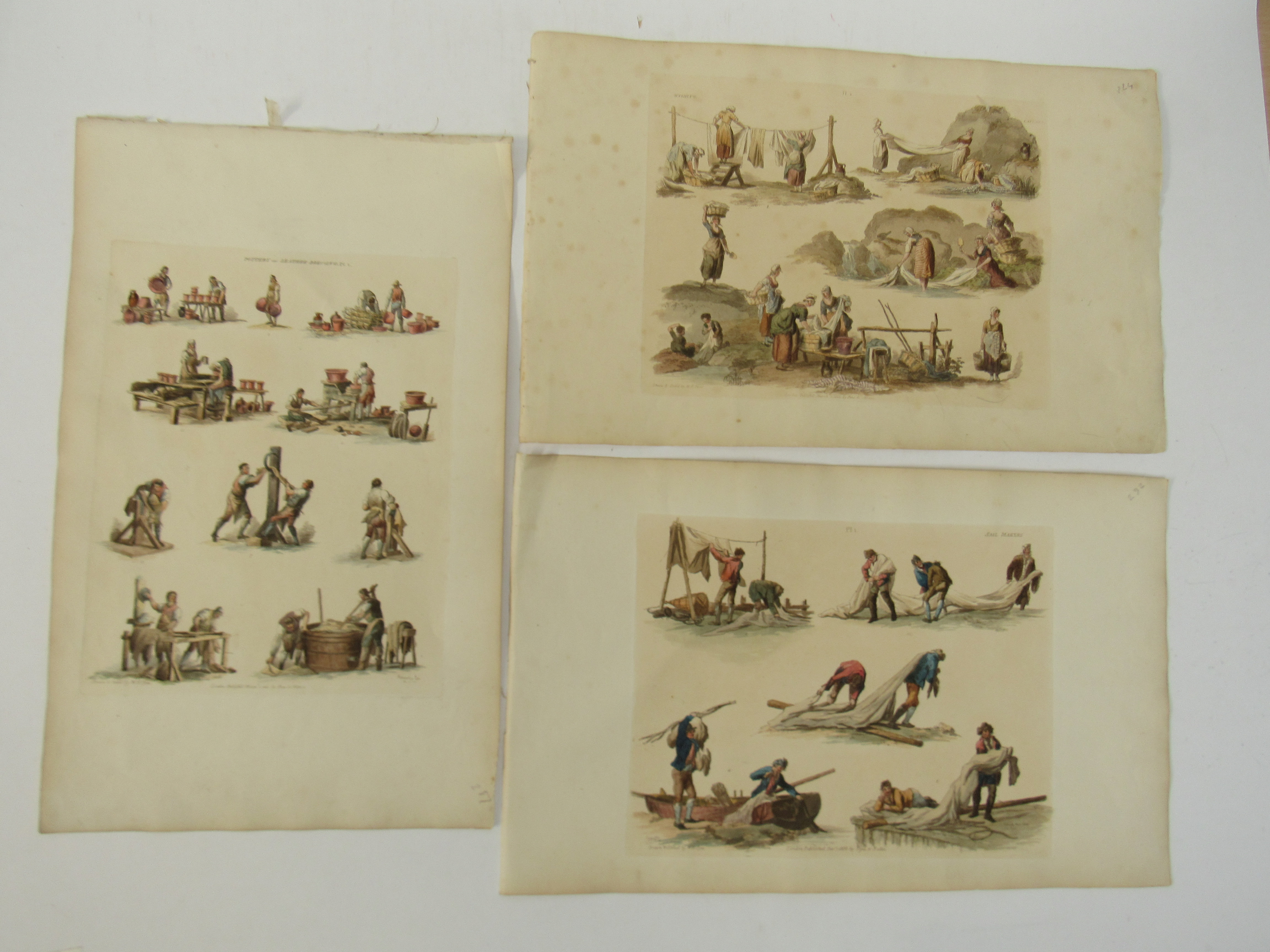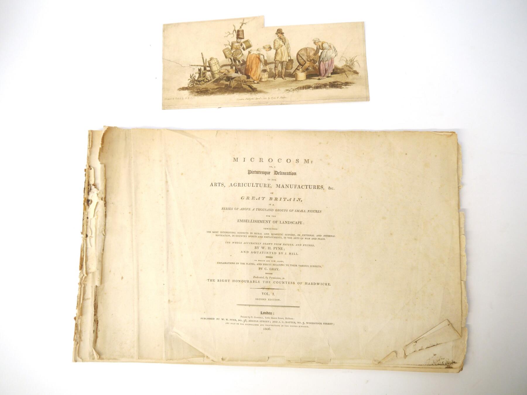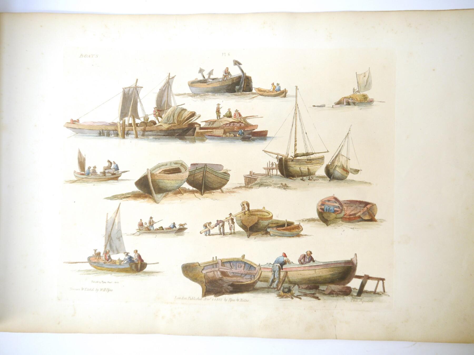 W H Pyne: 'Microcosm: or, A Picturesque Delineation of the Arts, Agriculture, Manufacturer, & c of Great Britain', 1806, a/f sold as a series of plates only, 26 hand coloured aquatint plates only (one of which with closed tear, others VGC), depicting fishermen, blacksmiths, masons, millers, agriculture, sail makers, potters, sawing, wagons, woodmen, shepherds etc, disbound oblong folio, title page loose/creased, several plates loose