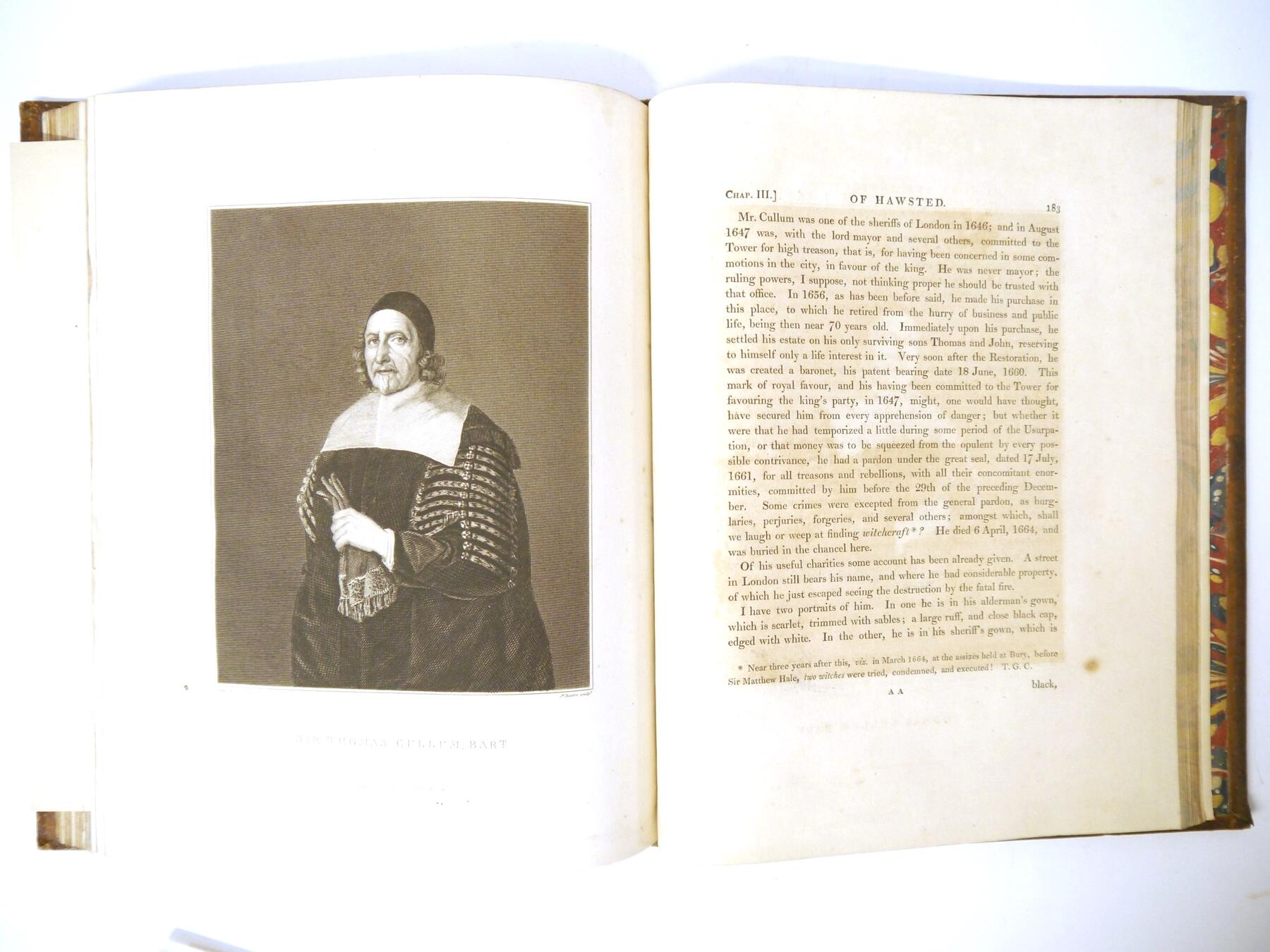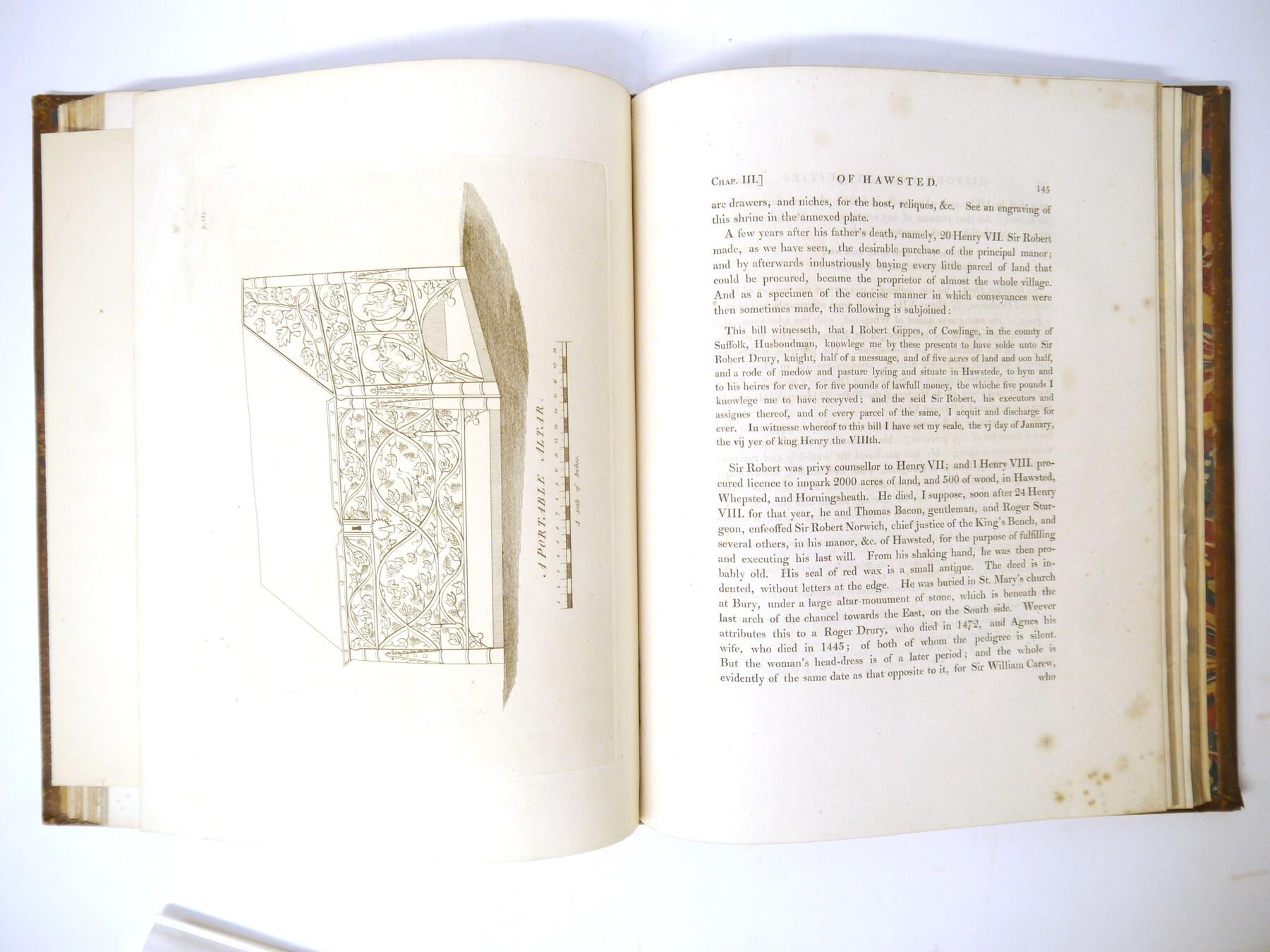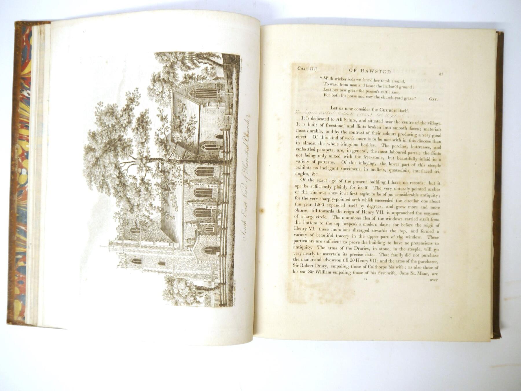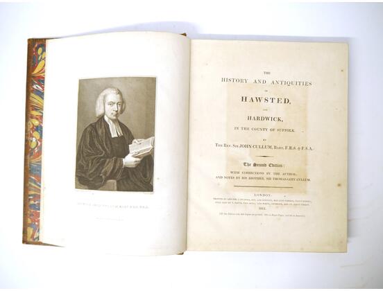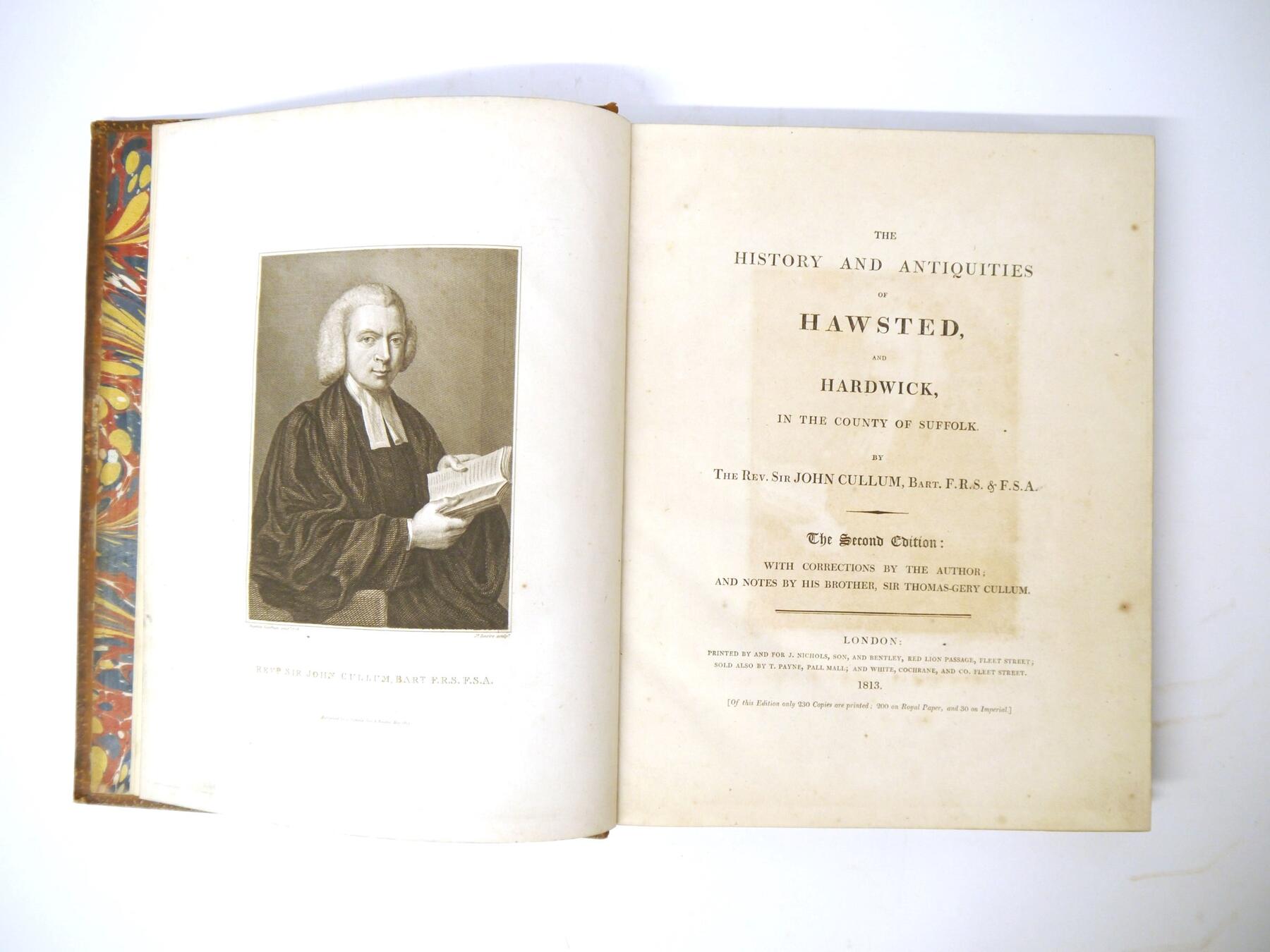 John Cullum: 'The History & Antiquities of Hawstead, and Hardwick, in the County of Suffolk', London, 1813, 2nd and best edition, one of 230 copies only, 2 engraved plates and 6 pedigrees as called for, extra illustrated with addtional illustrations and autograph letters including plan of Hawstead church Hawstead Place letter, Gery Milner-Gibson-Cullum letters, Grants of Arms of Mary Cullum etc, 4to, contempory calf gilt worn (top board detached but present)