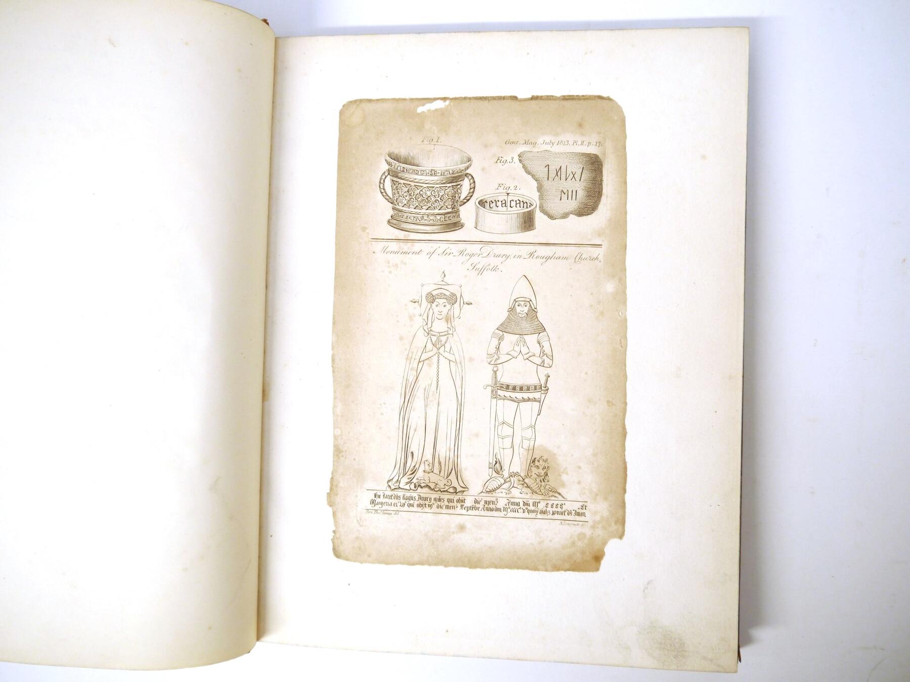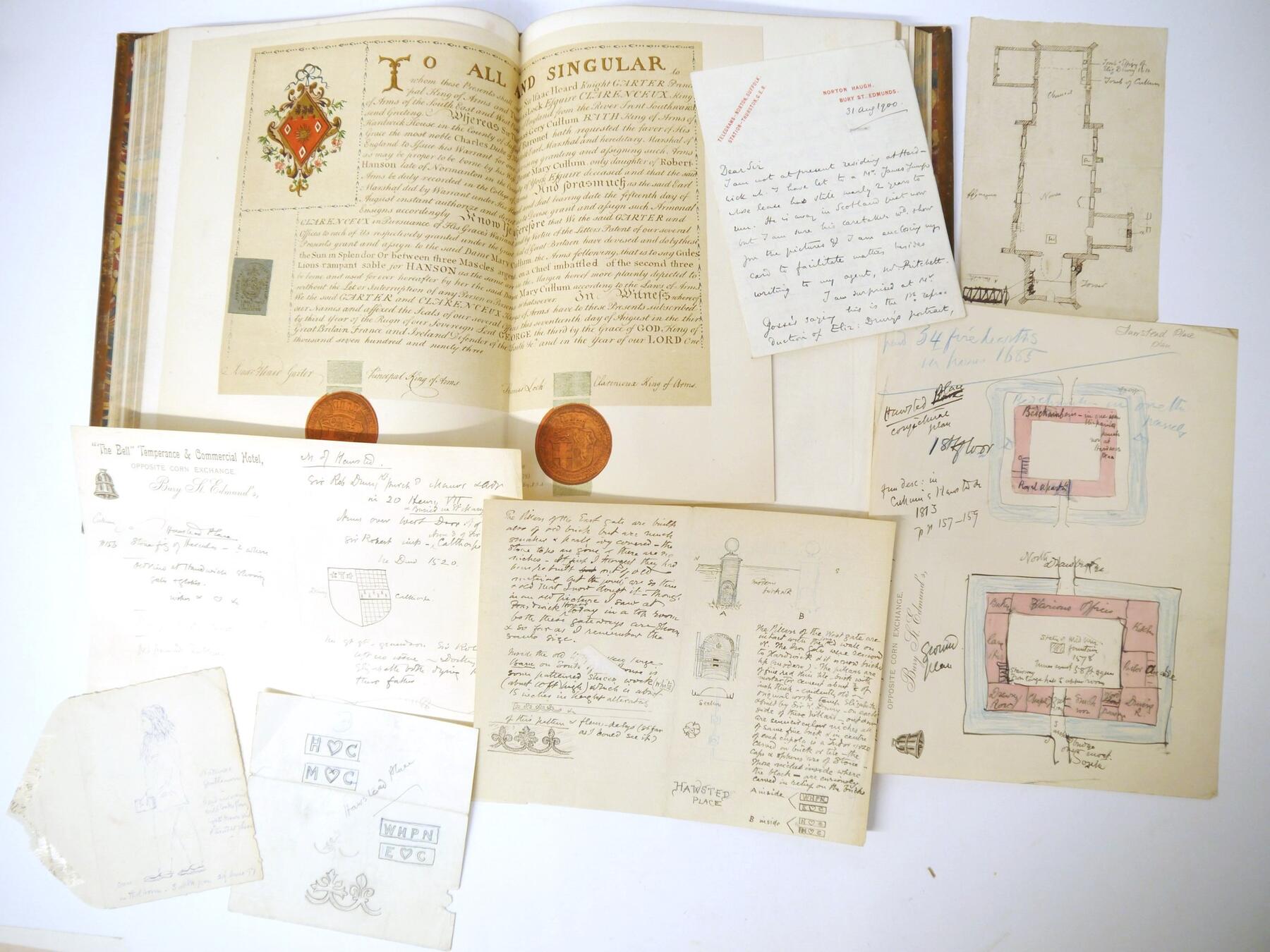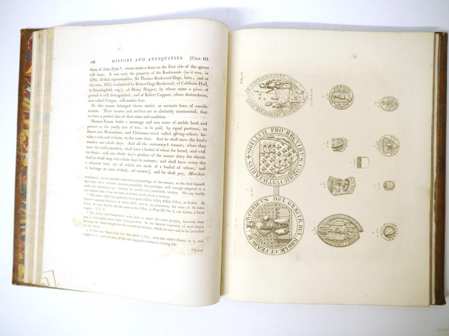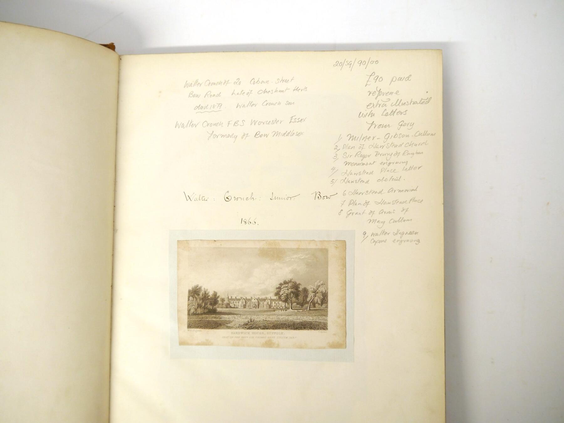John Cullum: 'The History & Antiquities of Hawstead, and Hardwick, in the County of Suffolk', London, 1813, 2nd and best edition, one of 230 copies only, 2 engraved plates and 6 pedigrees as called for, extra illustrated with addtional illustrations and autograph letters including plan of Hawstead church Hawstead Place letter, Gery Milner-Gibson-Cullum letters, Grants of Arms of Mary Cullum etc, 4to, contempory calf gilt worn (top board detached but present)