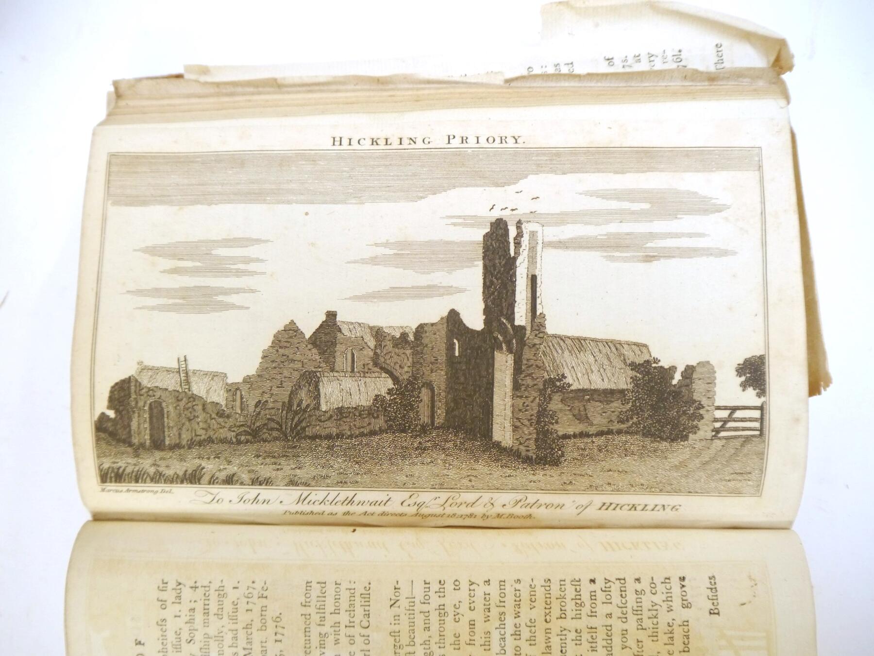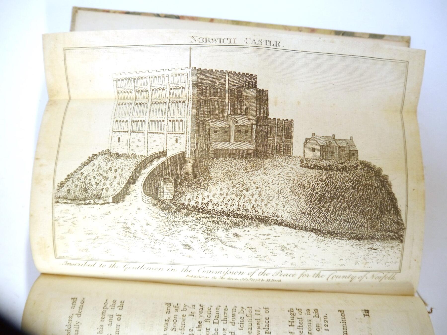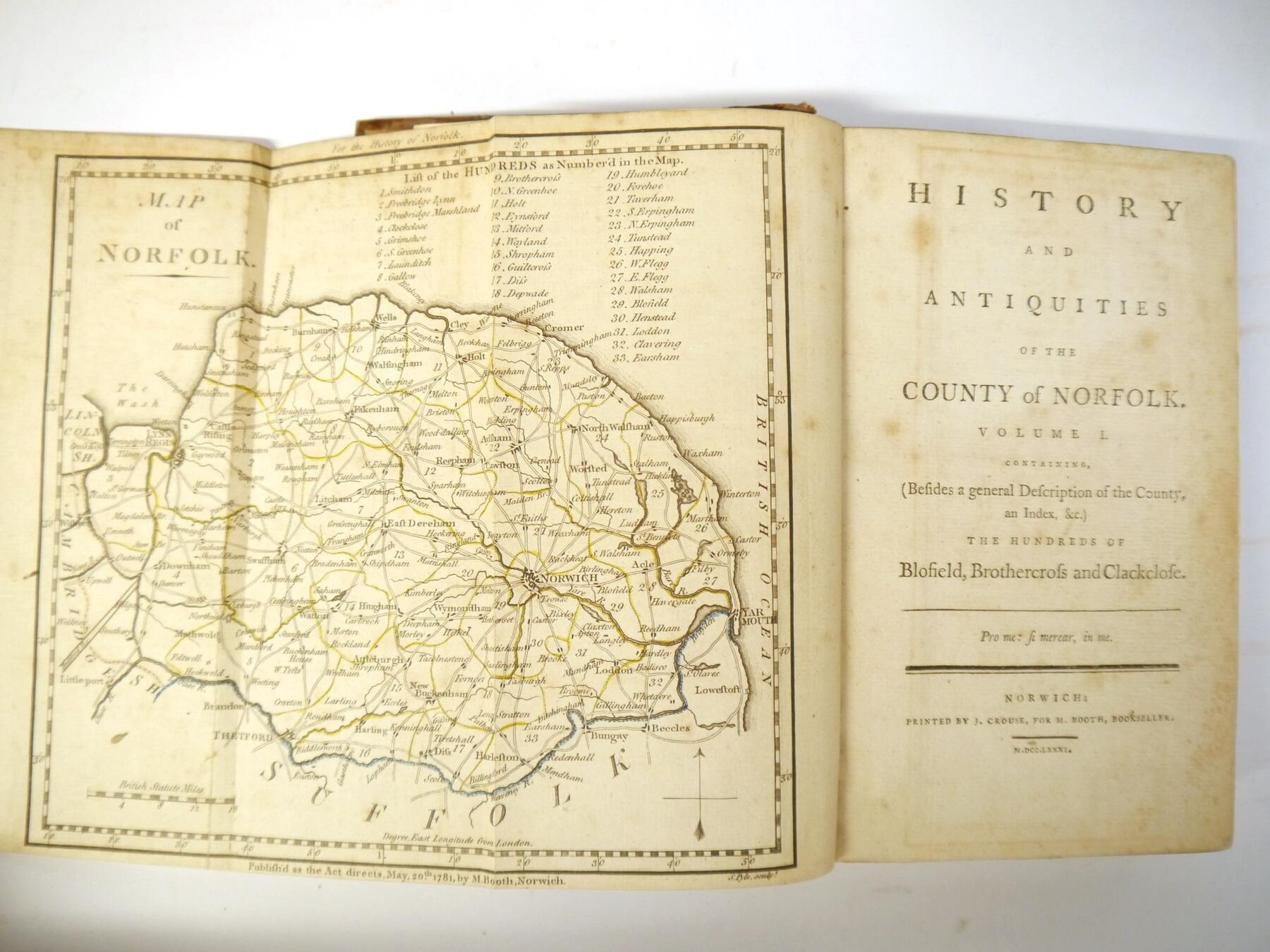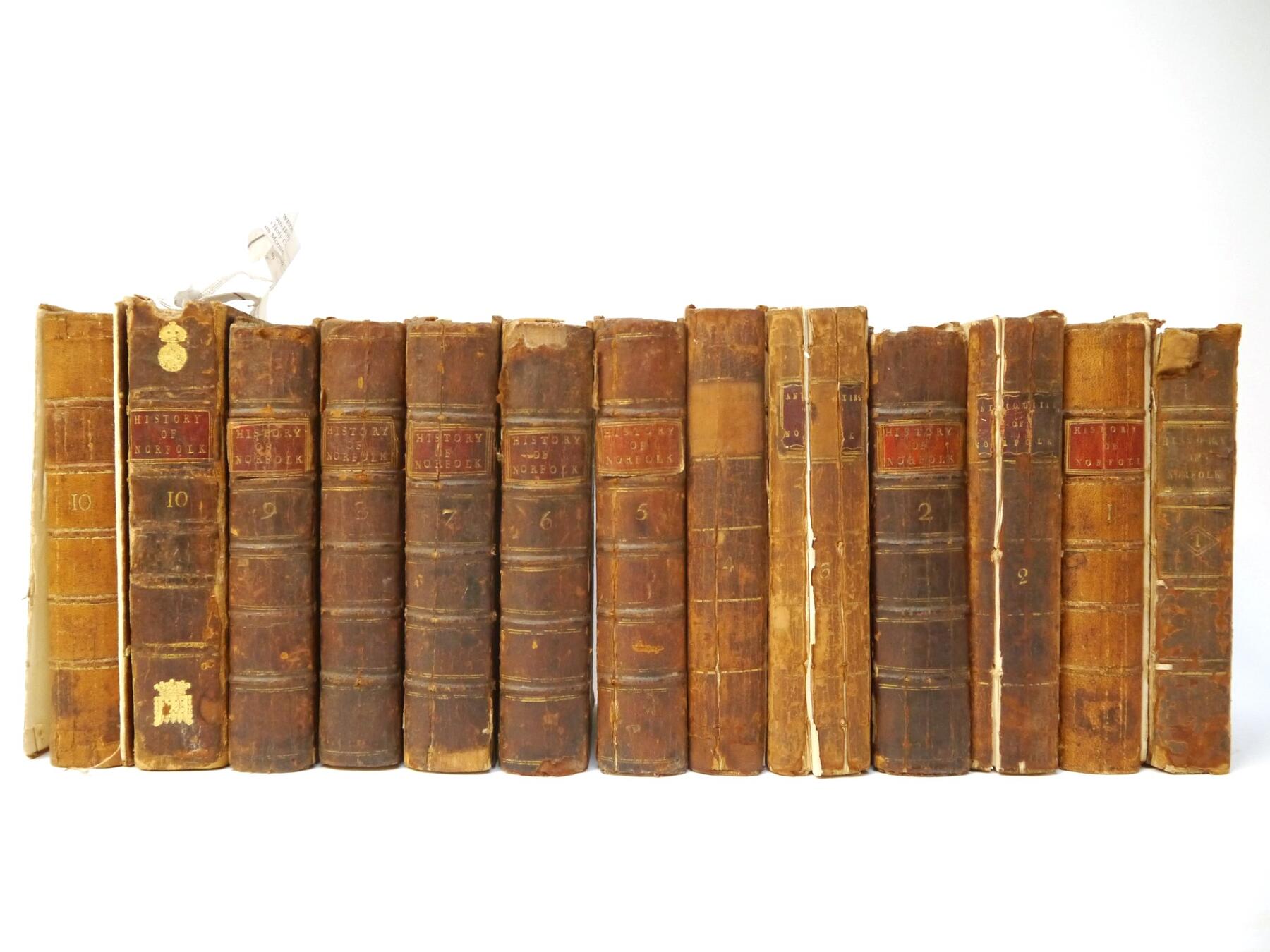 Mostyn John Armstrong: 'History & Antiquities of the County of Norfolk', Norwich, 1781, 10 volumes, volume 1 (Blofield, Brothercross & Clackclose), engraved folding map of Norfolk; Volume 2 (Clavering, Depwade, Diss & Earsham), 5 engraved plates including Scole Inn and Scole Inn sign, both folding; Volume 3 (North Erpingham, South Erpingham & Eynsford) 12 engraved plates including Barningham Hall, Cromer, Felbrigg Hall, Wolterton Hall etc; Volume 4 (East Flegg, West Flegg & Forehoe), 5 engraved plates including Yarmouth, Costessey Hall, Wymondham Abbey etc, Volume 5 (Freebridge Lynn, Freebridge Marshland & Gallow), engraved folding map of Fens and 6 engraved plates including Castleacre, Castle Rising, Middleton Castle etc, Volume 6 (North Greenhoe, South Greenhoe, Grimeshoe & Guiltcross), 7 plates including Binham Priory, Holkham Hall, Stiffkey Hall etc; Volume 7 (Happing, Henstead, Holt, Humbleyard & Loddon) , 6 plates including Bixley Hall, Kirby Bedon, Melton Constable etc and two extras not called for Langley House & Ditchingham Hall; Volume 8 (Launditch, Mitford & Shropham), 7 engraved plates; Volume 9 (Smithdon, Taverham, Tunstead, Walsham & Wayland), 6 engraved plates; Volume 10 (Norwich), 7 engraved plates including view of Norwich, Cathedral, Castle, Bank, Hospital etc (lacks plan of Norwich), a good set with majority of plates, old calf/half calf gilt, mixed condition, duplicates of Volume 1, 2 & 10 (13)