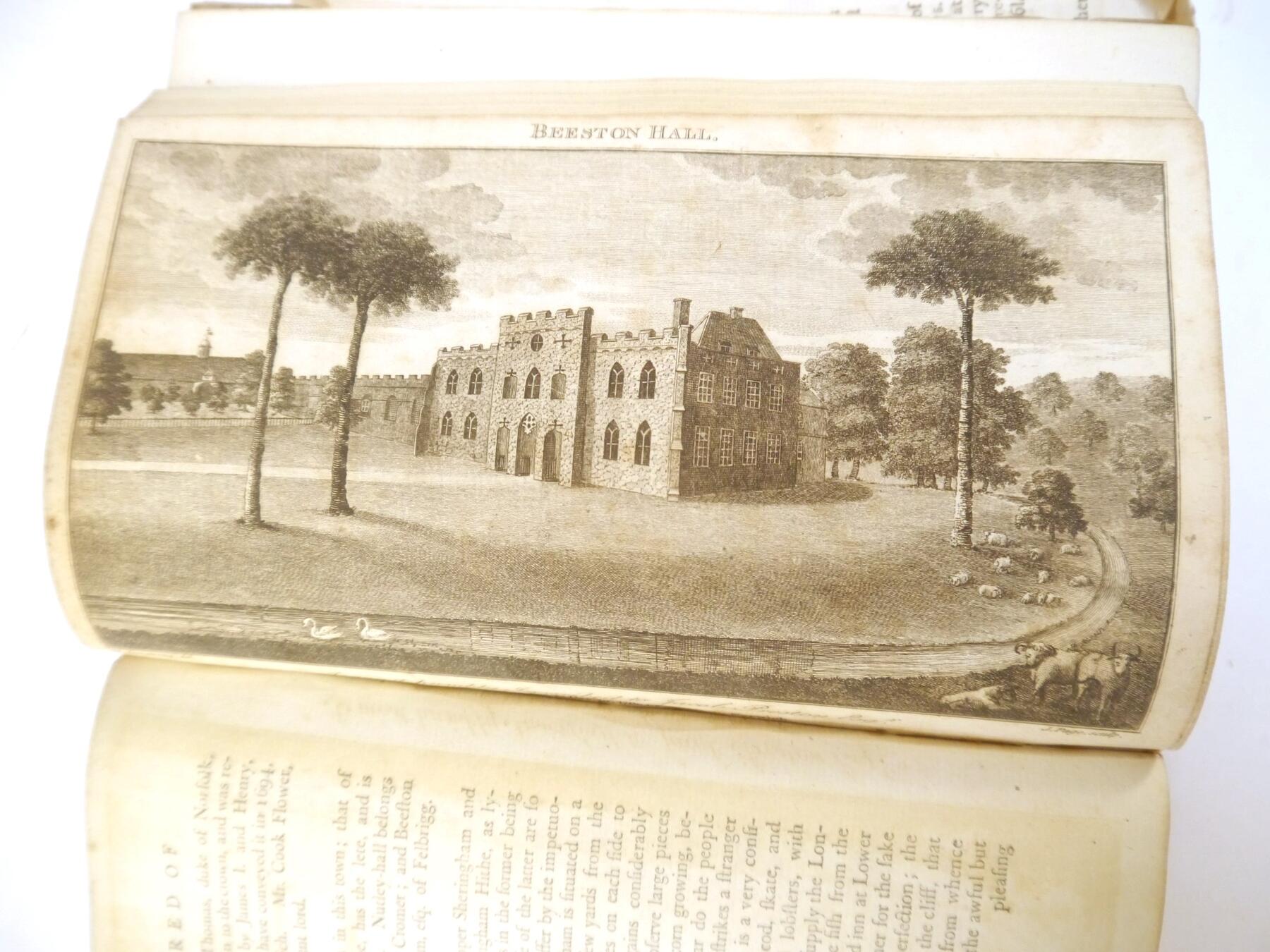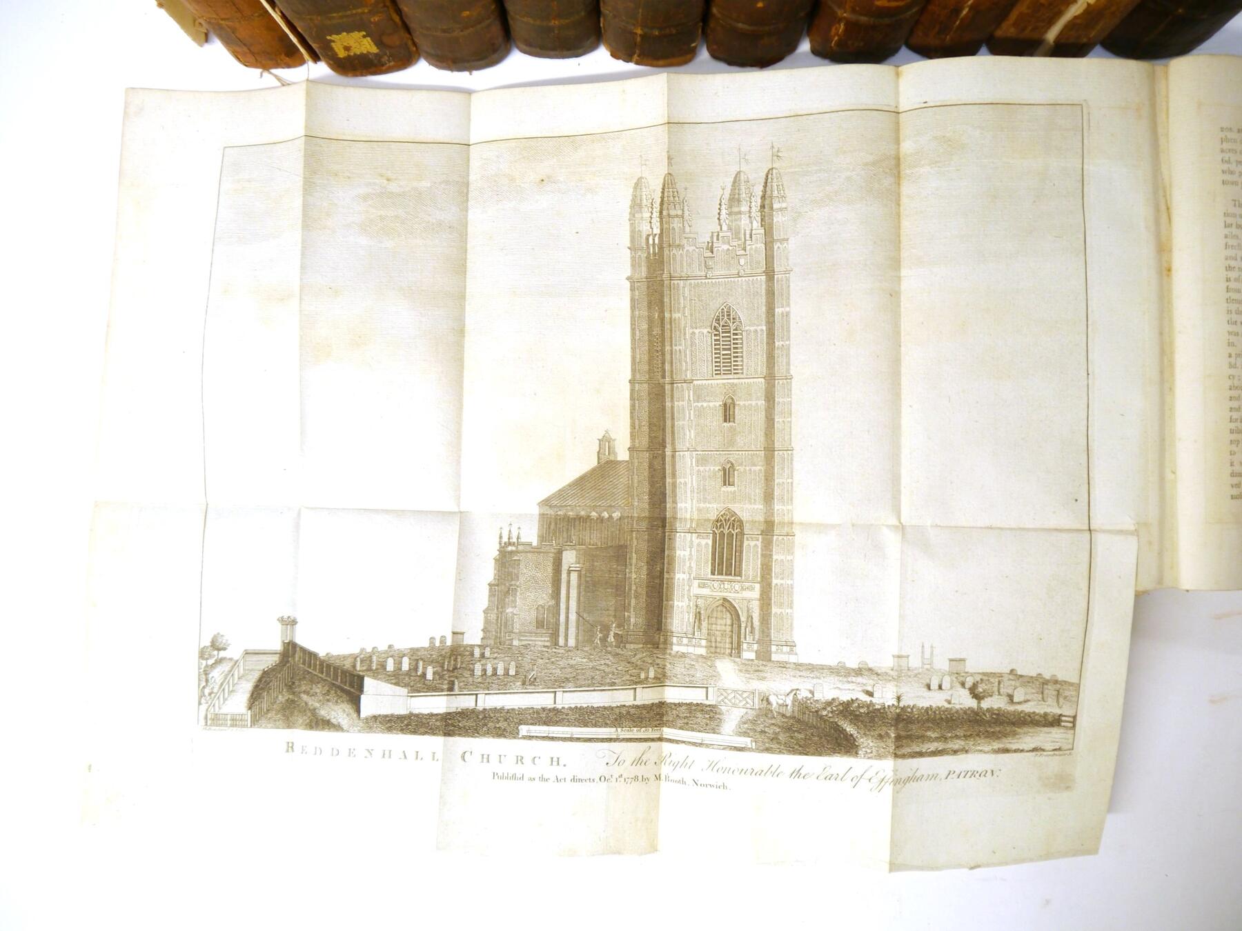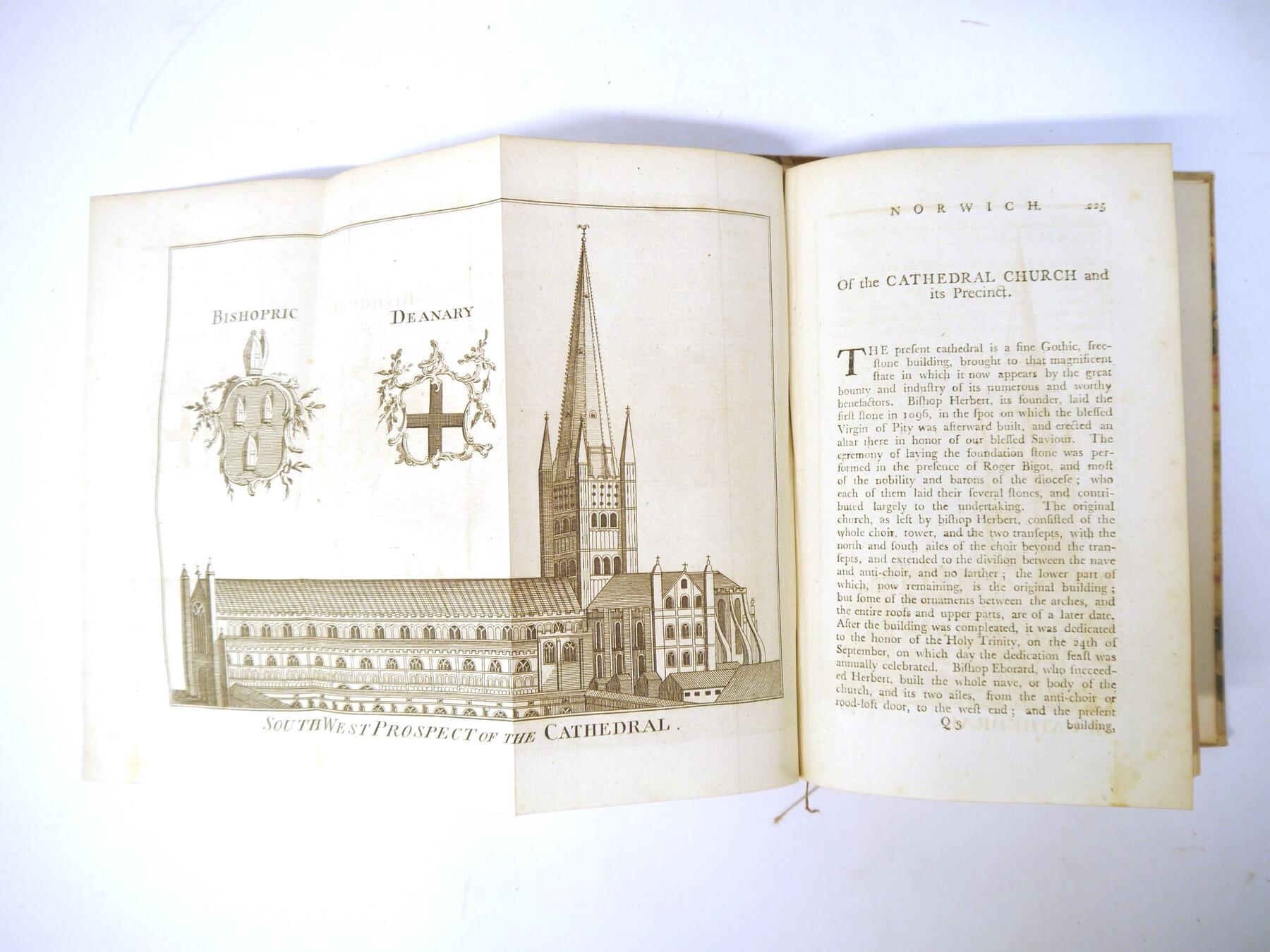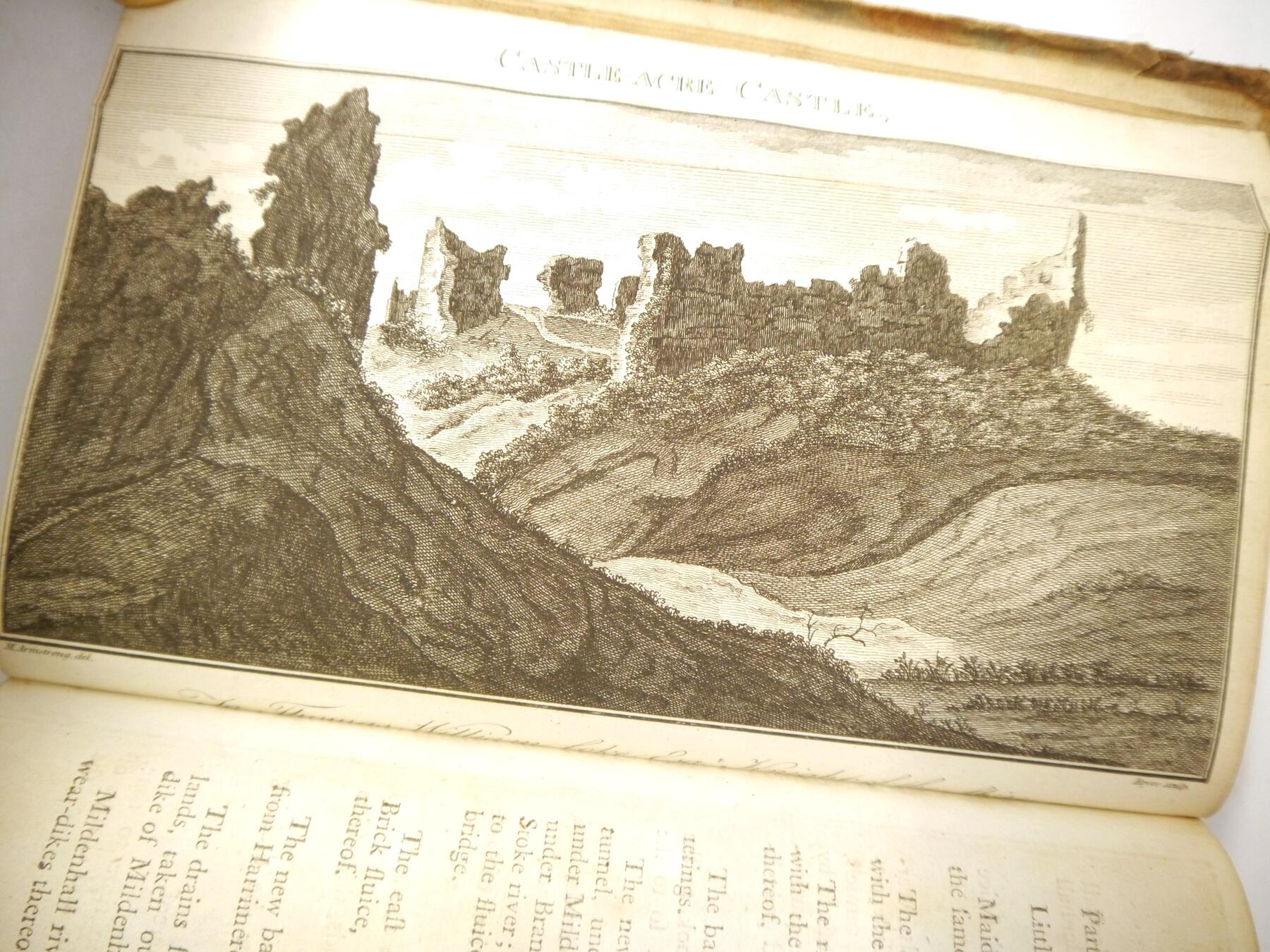 Mostyn John Armstrong: 'History & Antiquities of the County of Norfolk', Norwich, 1781, 10 volumes, volume 1 (Blofield, Brothercross & Clackclose), engraved folding map of Norfolk; Volume 2 (Clavering, Depwade, Diss & Earsham), 5 engraved plates including Scole Inn and Scole Inn sign, both folding; Volume 3 (North Erpingham, South Erpingham & Eynsford) 12 engraved plates including Barningham Hall, Cromer, Felbrigg Hall, Wolterton Hall etc; Volume 4 (East Flegg, West Flegg & Forehoe), 5 engraved plates including Yarmouth, Costessey Hall, Wymondham Abbey etc, Volume 5 (Freebridge Lynn, Freebridge Marshland & Gallow), engraved folding map of Fens and 6 engraved plates including Castleacre, Castle Rising, Middleton Castle etc, Volume 6 (North Greenhoe, South Greenhoe, Grimeshoe & Guiltcross), 7 plates including Binham Priory, Holkham Hall, Stiffkey Hall etc; Volume 7 (Happing, Henstead, Holt, Humbleyard & Loddon) , 6 plates including Bixley Hall, Kirby Bedon, Melton Constable etc and two extras not called for Langley House & Ditchingham Hall; Volume 8 (Launditch, Mitford & Shropham), 7 engraved plates; Volume 9 (Smithdon, Taverham, Tunstead, Walsham & Wayland), 6 engraved plates; Volume 10 (Norwich), 7 engraved plates including view of Norwich, Cathedral, Castle, Bank, Hospital etc (lacks plan of Norwich), a good set with majority of plates, old calf/half calf gilt, mixed condition, duplicates of Volume 1, 2 & 10 (13)