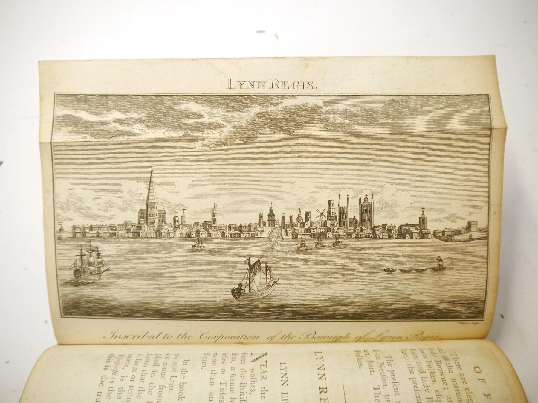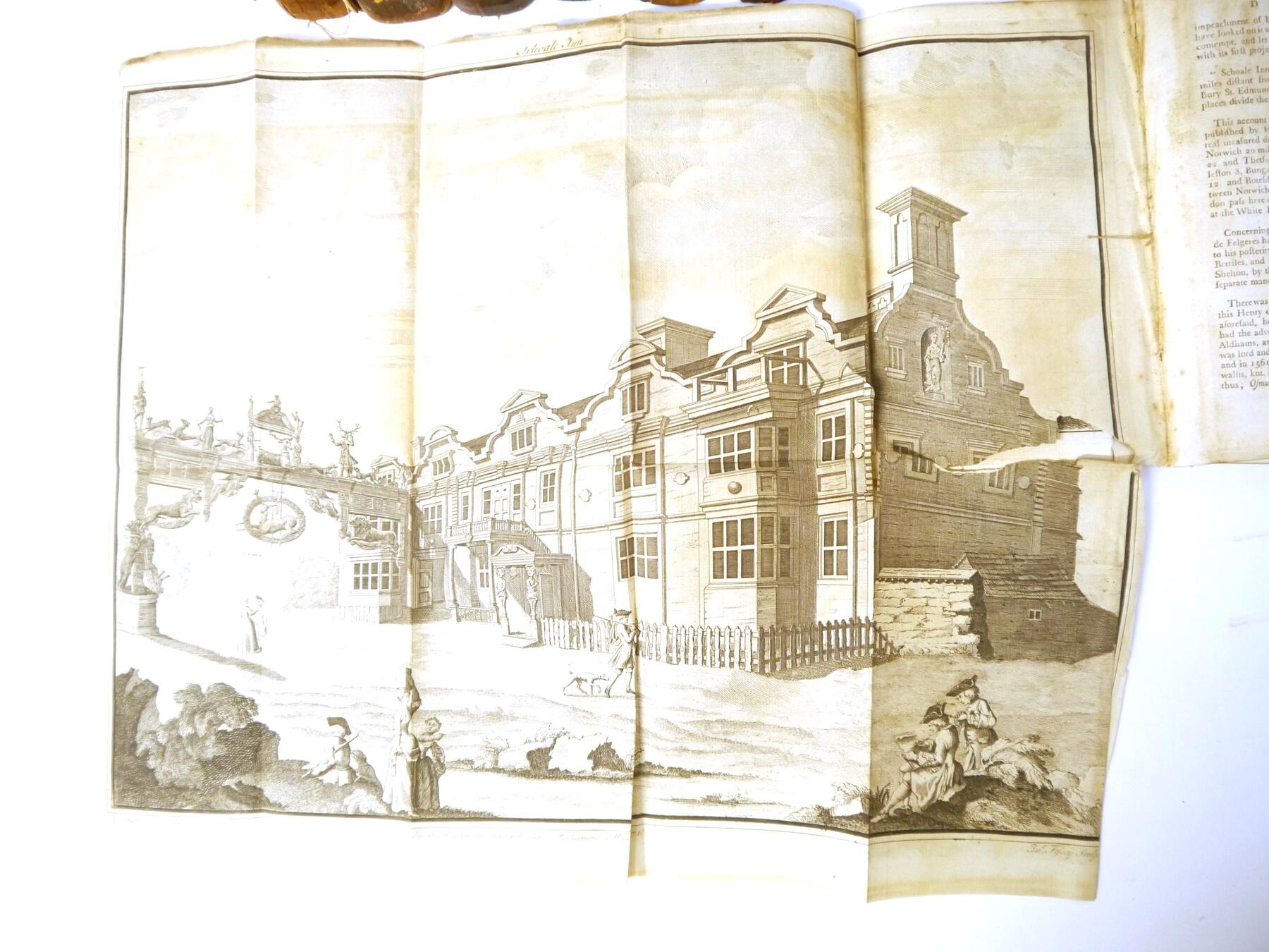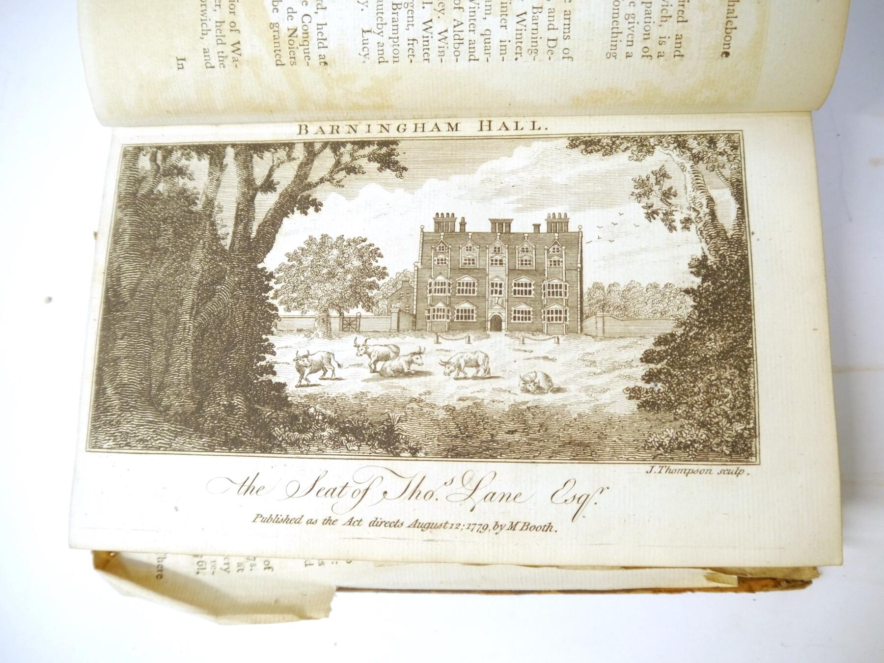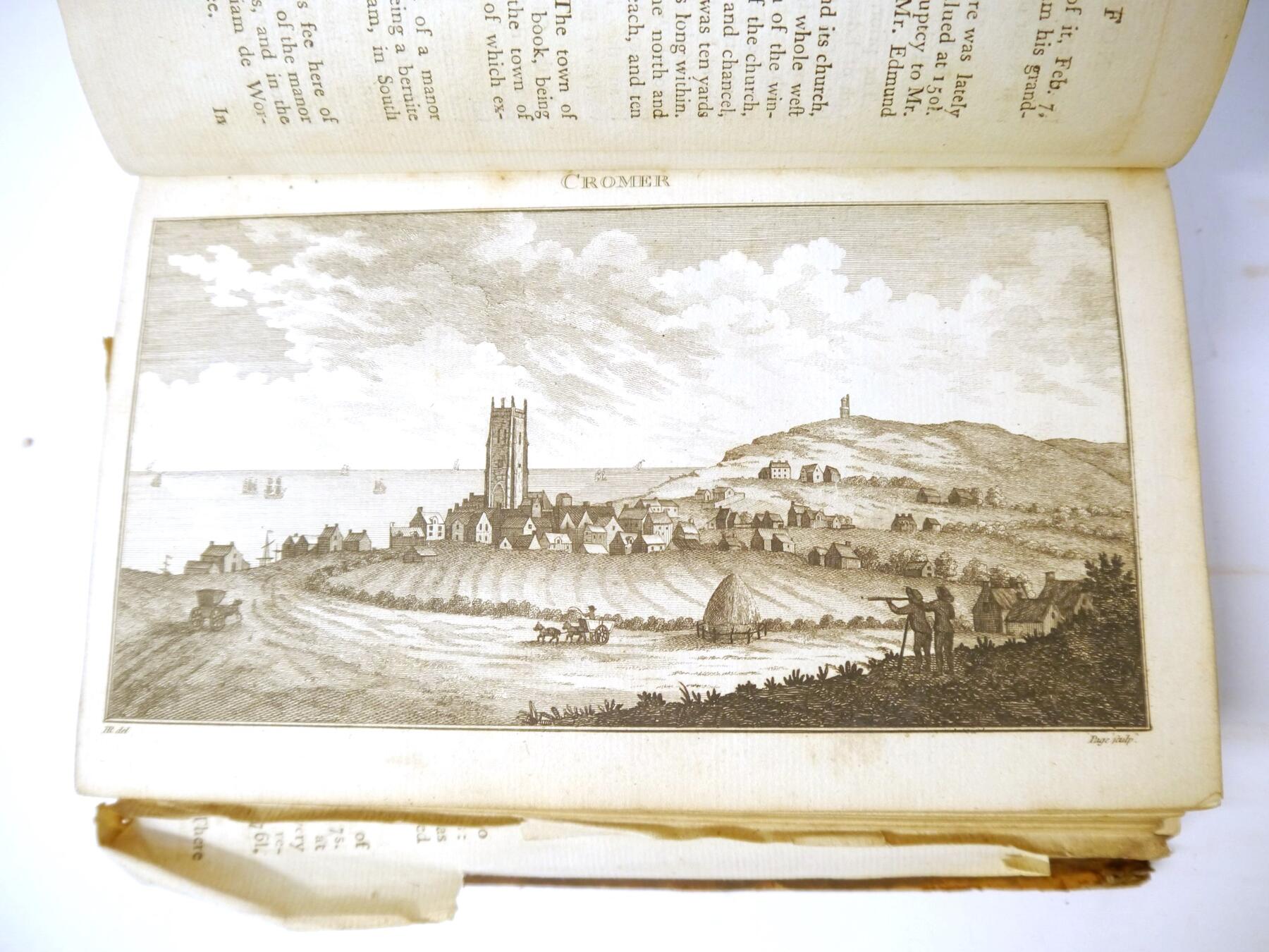 Mostyn John Armstrong: 'History & Antiquities of the County of Norfolk', Norwich, 1781, 10 volumes, volume 1 (Blofield, Brothercross & Clackclose), engraved folding map of Norfolk; Volume 2 (Clavering, Depwade, Diss & Earsham), 5 engraved plates including Scole Inn and Scole Inn sign, both folding; Volume 3 (North Erpingham, South Erpingham & Eynsford) 12 engraved plates including Barningham Hall, Cromer, Felbrigg Hall, Wolterton Hall etc; Volume 4 (East Flegg, West Flegg & Forehoe), 5 engraved plates including Yarmouth, Costessey Hall, Wymondham Abbey etc, Volume 5 (Freebridge Lynn, Freebridge Marshland & Gallow), engraved folding map of Fens and 6 engraved plates including Castleacre, Castle Rising, Middleton Castle etc, Volume 6 (North Greenhoe, South Greenhoe, Grimeshoe & Guiltcross), 7 plates including Binham Priory, Holkham Hall, Stiffkey Hall etc; Volume 7 (Happing, Henstead, Holt, Humbleyard & Loddon) , 6 plates including Bixley Hall, Kirby Bedon, Melton Constable etc and two extras not called for Langley House & Ditchingham Hall; Volume 8 (Launditch, Mitford & Shropham), 7 engraved plates; Volume 9 (Smithdon, Taverham, Tunstead, Walsham & Wayland), 6 engraved plates; Volume 10 (Norwich), 7 engraved plates including view of Norwich, Cathedral, Castle, Bank, Hospital etc (lacks plan of Norwich), a good set with majority of plates, old calf/half calf gilt, mixed condition, duplicates of Volume 1, 2 & 10 (13)