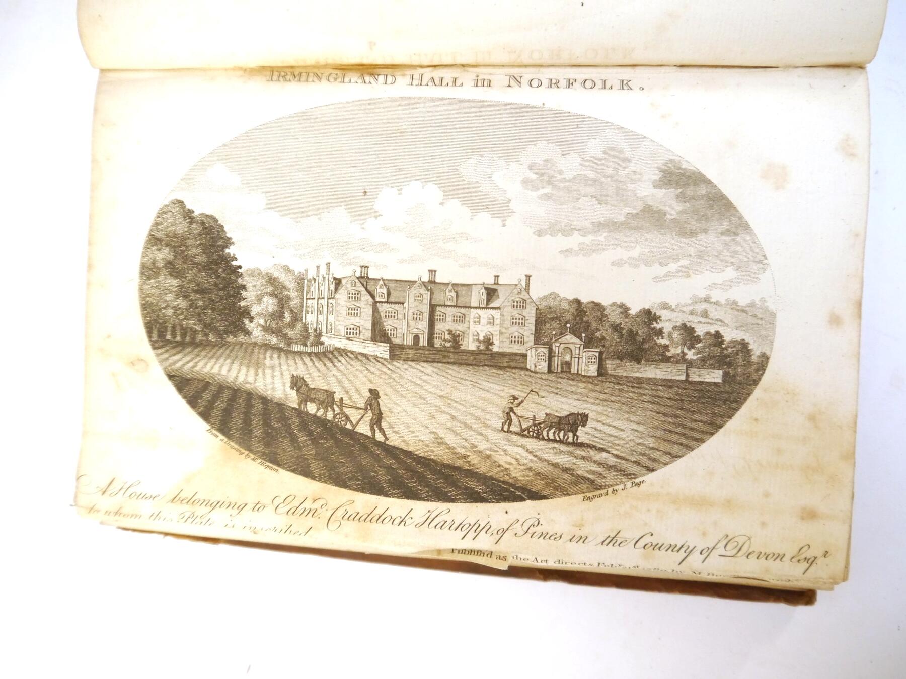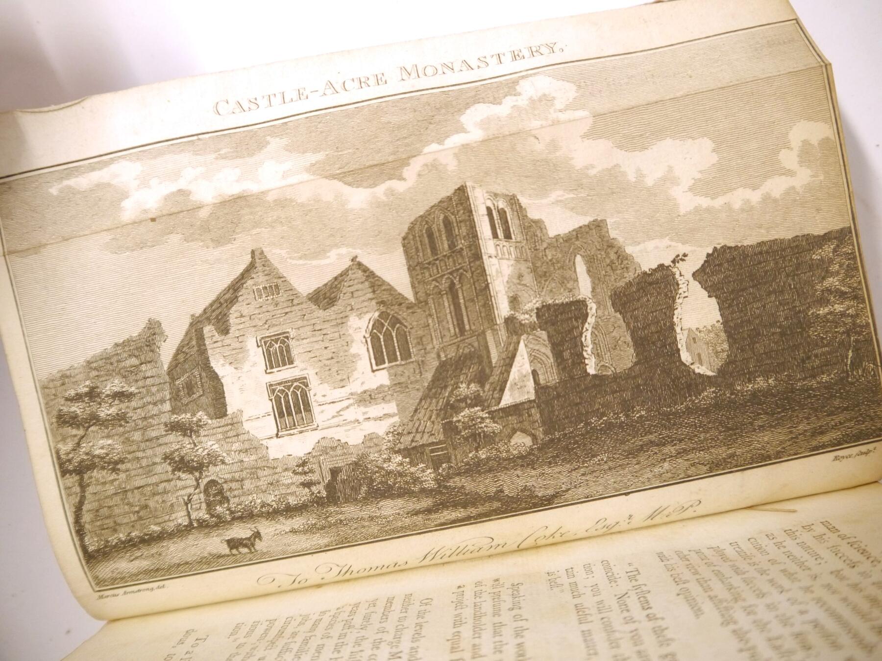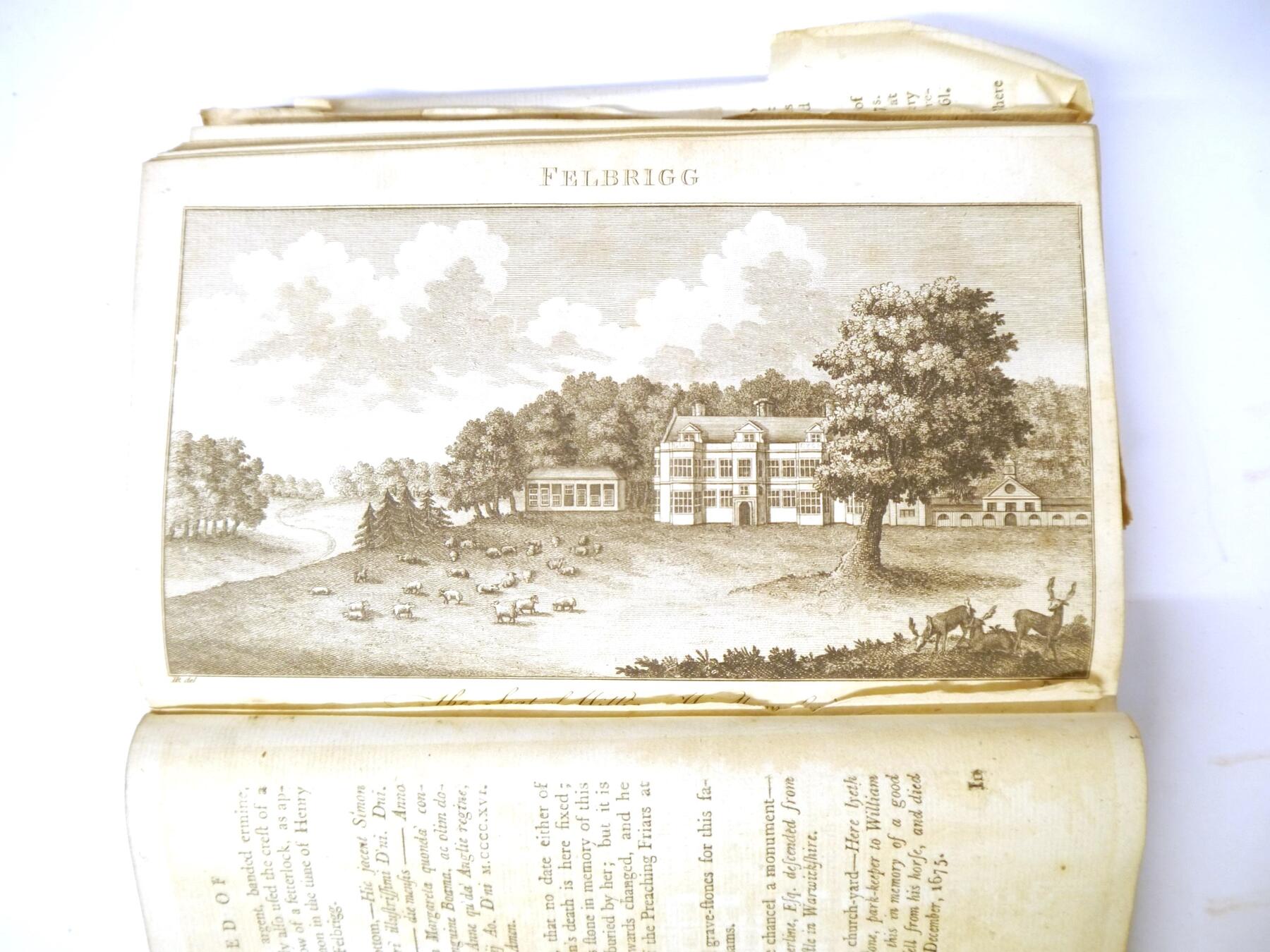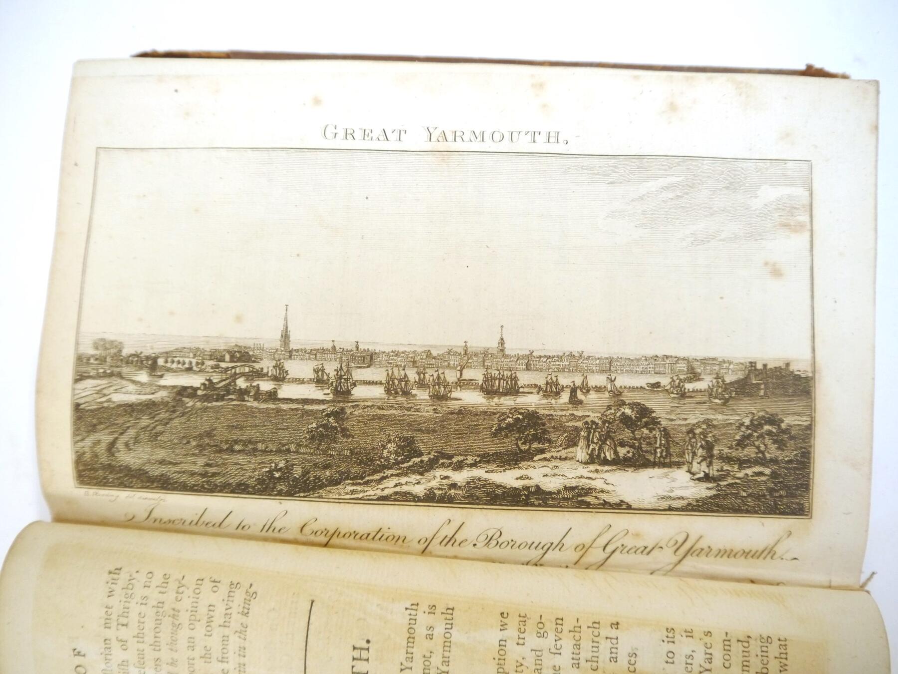 Mostyn John Armstrong: 'History & Antiquities of the County of Norfolk', Norwich, 1781, 10 volumes, volume 1 (Blofield, Brothercross & Clackclose), engraved folding map of Norfolk; Volume 2 (Clavering, Depwade, Diss & Earsham), 5 engraved plates including Scole Inn and Scole Inn sign, both folding; Volume 3 (North Erpingham, South Erpingham & Eynsford) 12 engraved plates including Barningham Hall, Cromer, Felbrigg Hall, Wolterton Hall etc; Volume 4 (East Flegg, West Flegg & Forehoe), 5 engraved plates including Yarmouth, Costessey Hall, Wymondham Abbey etc, Volume 5 (Freebridge Lynn, Freebridge Marshland & Gallow), engraved folding map of Fens and 6 engraved plates including Castleacre, Castle Rising, Middleton Castle etc, Volume 6 (North Greenhoe, South Greenhoe, Grimeshoe & Guiltcross), 7 plates including Binham Priory, Holkham Hall, Stiffkey Hall etc; Volume 7 (Happing, Henstead, Holt, Humbleyard & Loddon) , 6 plates including Bixley Hall, Kirby Bedon, Melton Constable etc and two extras not called for Langley House & Ditchingham Hall; Volume 8 (Launditch, Mitford & Shropham), 7 engraved plates; Volume 9 (Smithdon, Taverham, Tunstead, Walsham & Wayland), 6 engraved plates; Volume 10 (Norwich), 7 engraved plates including view of Norwich, Cathedral, Castle, Bank, Hospital etc (lacks plan of Norwich), a good set with majority of plates, old calf/half calf gilt, mixed condition, duplicates of Volume 1, 2 & 10 (13)