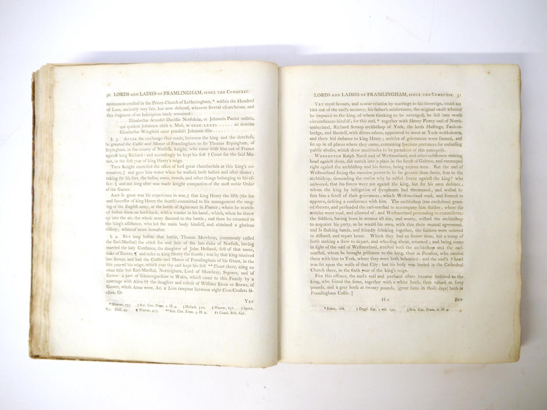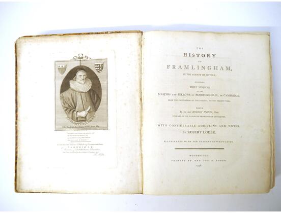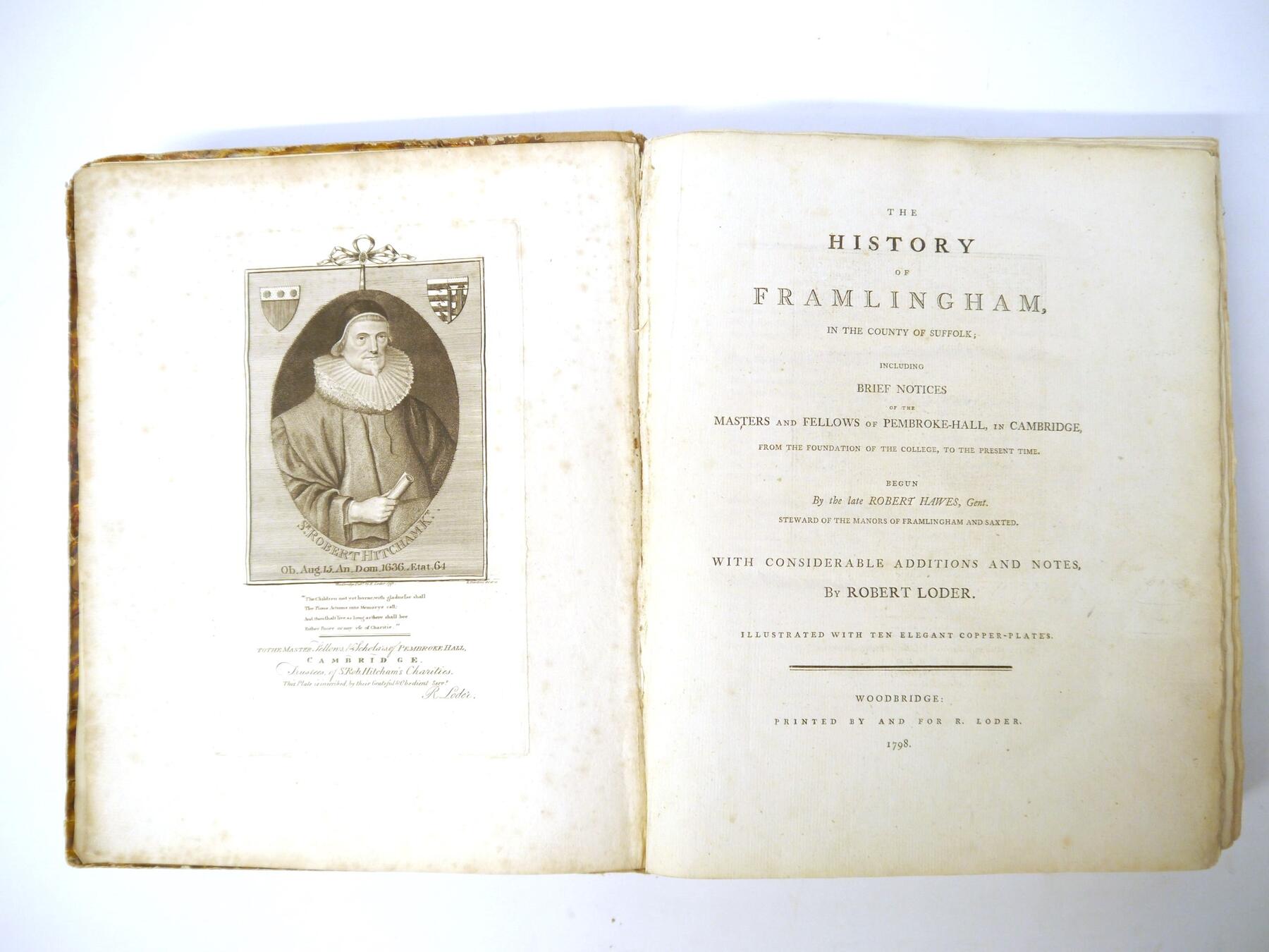 Robert Hawes and Robert Loder: 'The History of Framlingham, in the County of Suffolk', Woodbridge, 1798, limited edition (250), 10 engraved plates as called for, xii,453,[4]pp, 4to, old quarter cloth worn