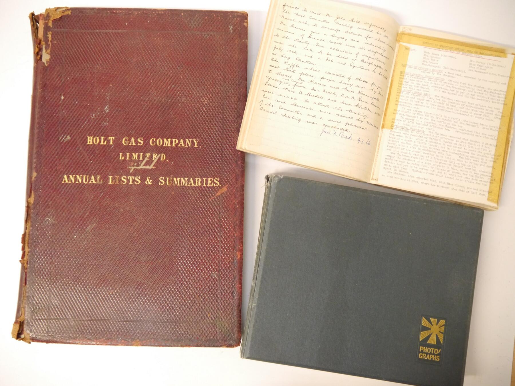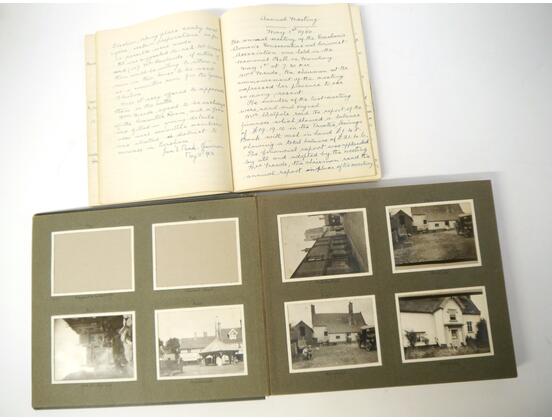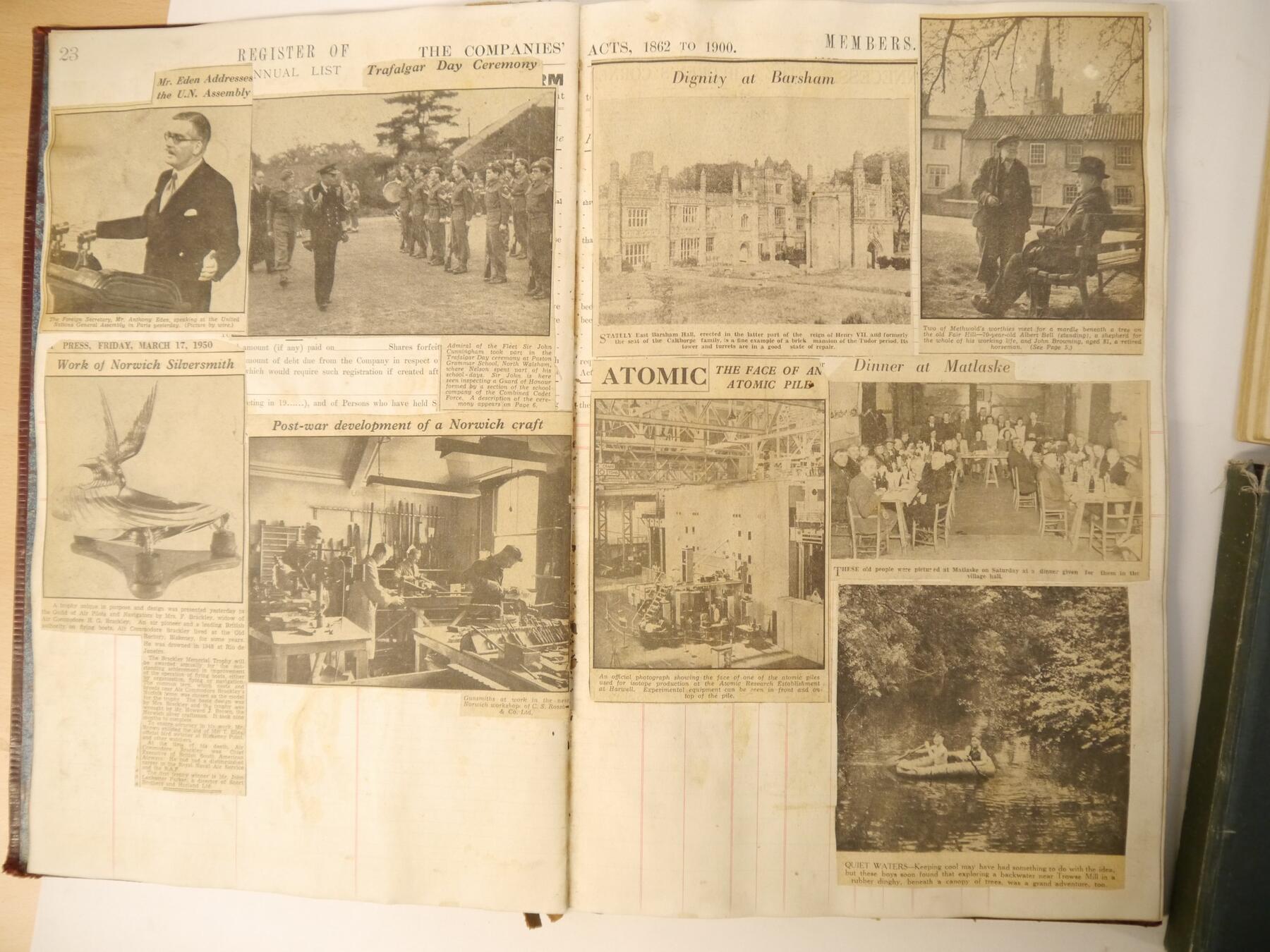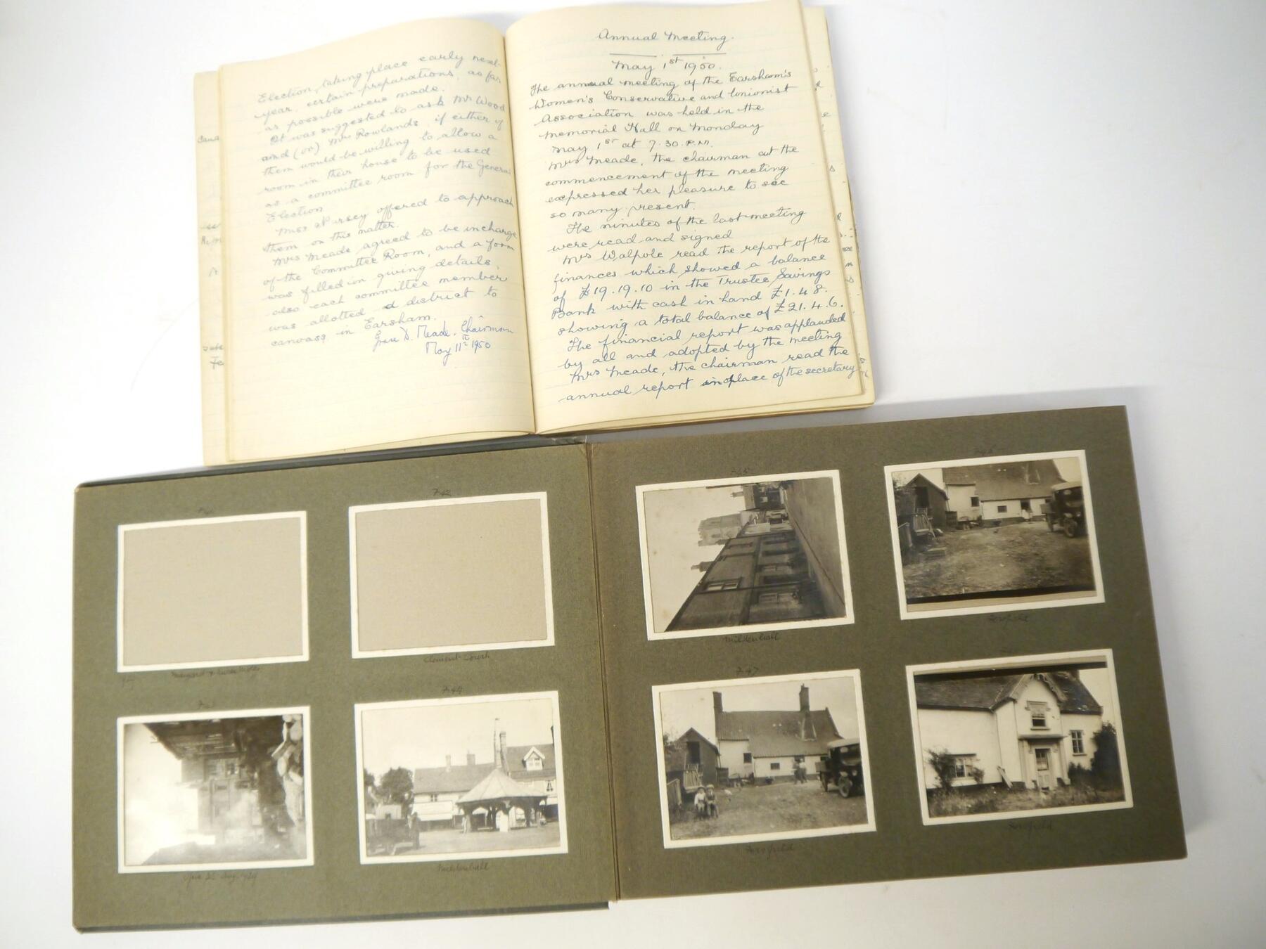 Norfolk interest ephemera, a snapshot photograph album 1929-1931, 75 topographical and architectural views including Shimpling, Mildenhall, Fersfield, Mettingham, Baconsthorpe, Langley Staithe, Colegate, Eaton Grove, Opie Street, Houghton Hall, Brisley, Walsingham, Deopham, many country houses and some churches, some other parts of UK, images 7 X 10cm, oblong, original cloth gilt ; South Norfolk Women's Unionist Association, Eastern Branch Earsham, book of manuscript notes/minutes from meetings 1929-1967 good quality manuscript and some typed notes at end, notes signed by A. Howe & Grace D Meade and dated throughout, old quarter cloth; an old ledger containing local interest news cuttings mainly, circa 1940's/1950's, large folio, full calf gilt (worn) (3)