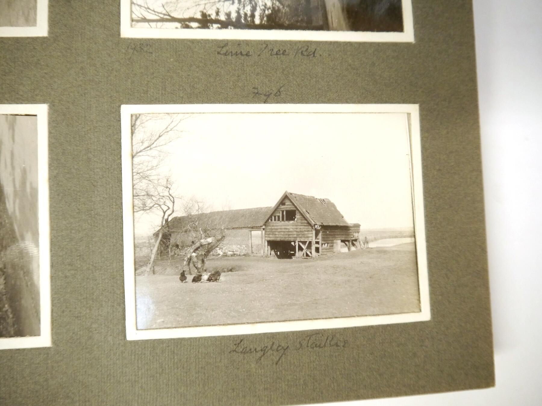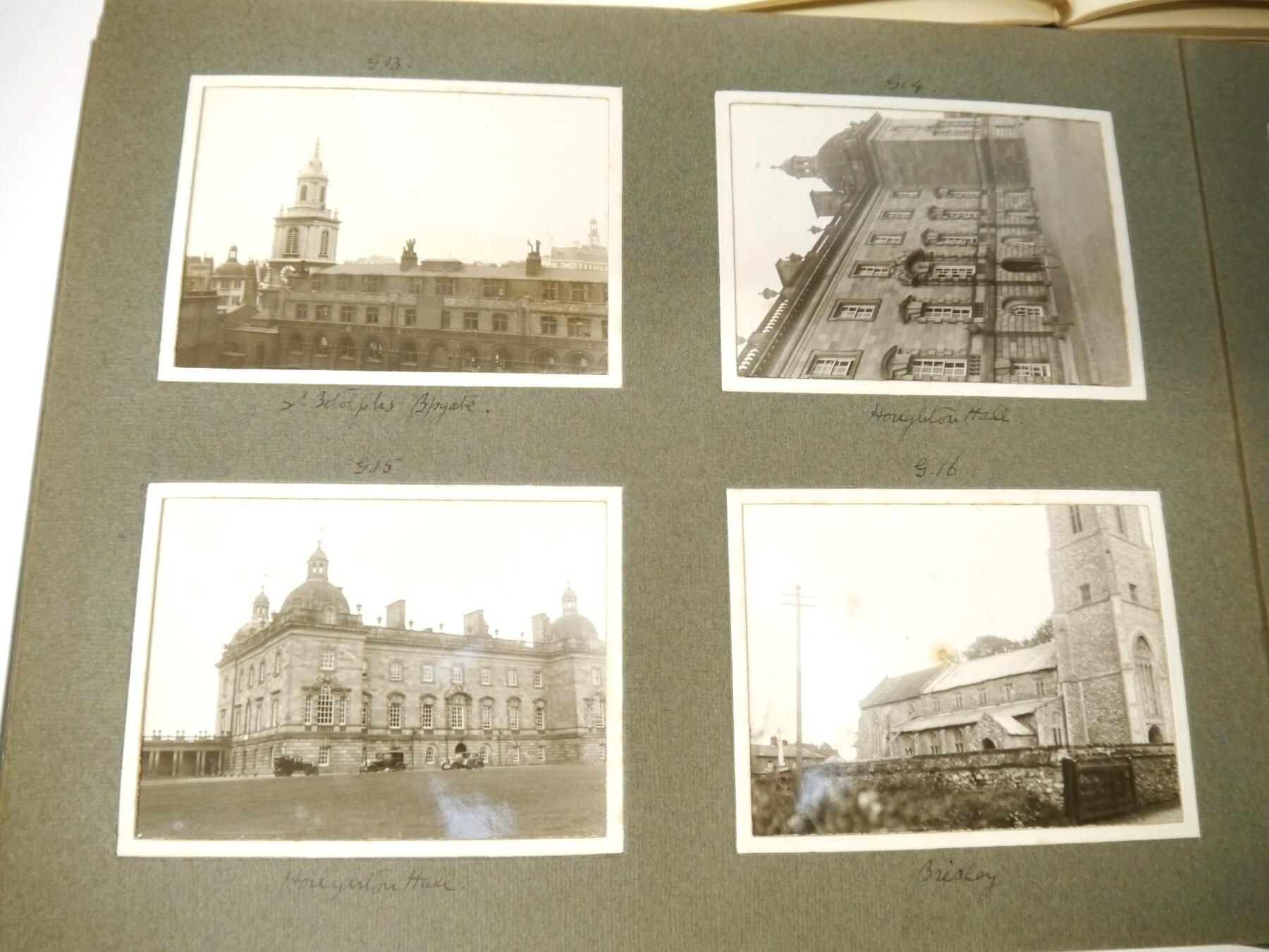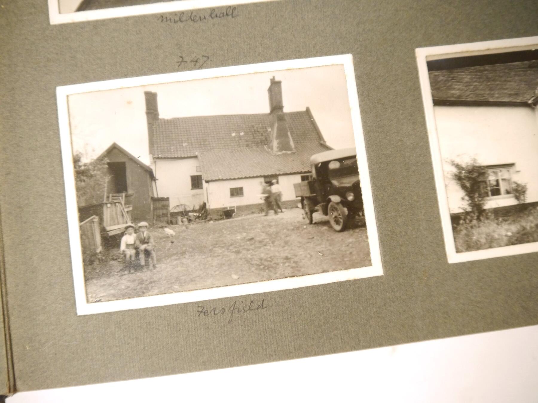 Norfolk interest ephemera, a snapshot photograph album 1929-1931, 75 topographical and architectural views including Shimpling, Mildenhall, Fersfield, Mettingham, Baconsthorpe, Langley Staithe, Colegate, Eaton Grove, Opie Street, Houghton Hall, Brisley, Walsingham, Deopham, many country houses and some churches, some other parts of UK, images 7 X 10cm, oblong, original cloth gilt ; South Norfolk Women's Unionist Association, Eastern Branch Earsham, book of manuscript notes/minutes from meetings 1929-1967 good quality manuscript and some typed notes at end, notes signed by A. Howe & Grace D Meade and dated throughout, old quarter cloth; an old ledger containing local interest news cuttings mainly, circa 1940's/1950's, large folio, full calf gilt (worn) (3)