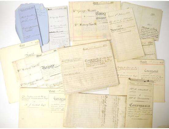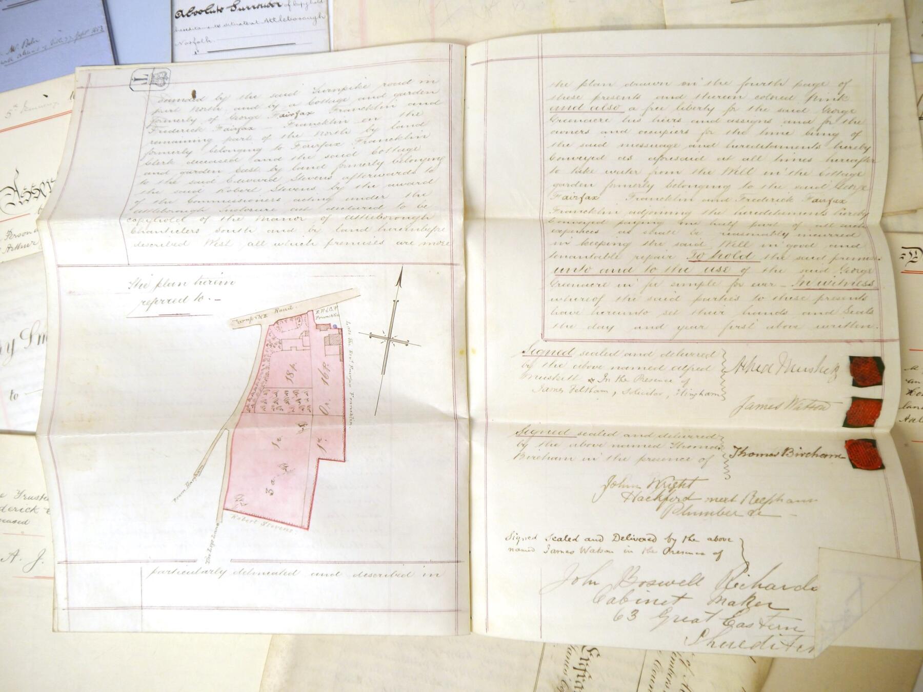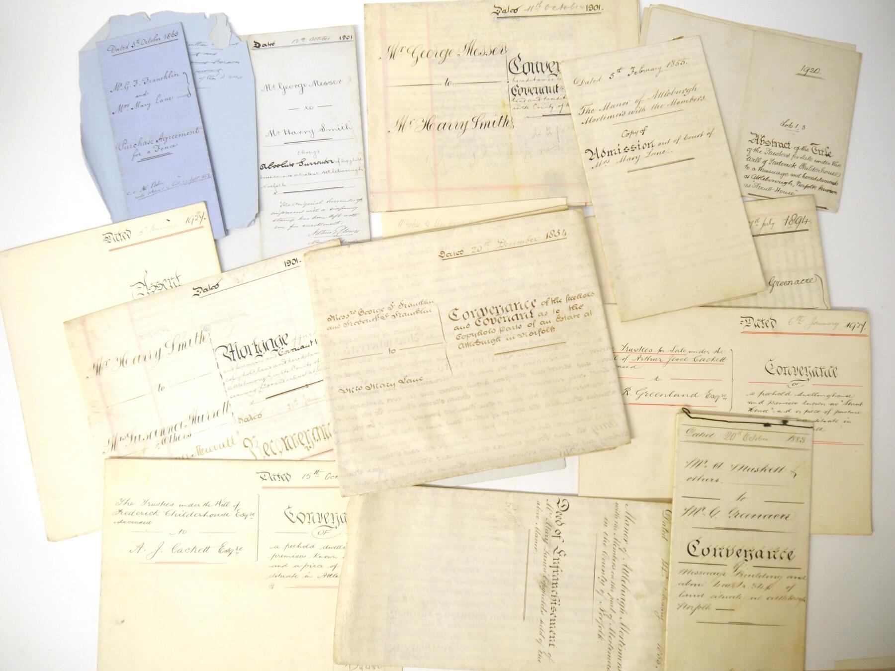 A packet of 14 vellum and other indentures 1850's-1920's, all Attleborough related, including vellum conveyance 1883 for ''Shrub House'', Attleborough, messuage of building and over 4 acres of land, outbuildings, pleasure garden, etc., situated between Hargham Road and Turnpike Road (present day High Street), 5 pages including hand-coloured pen & ink plan, plus another similar vellum document 1854 for same estate, also with hand-coloured pen & ink plan, etc., etc