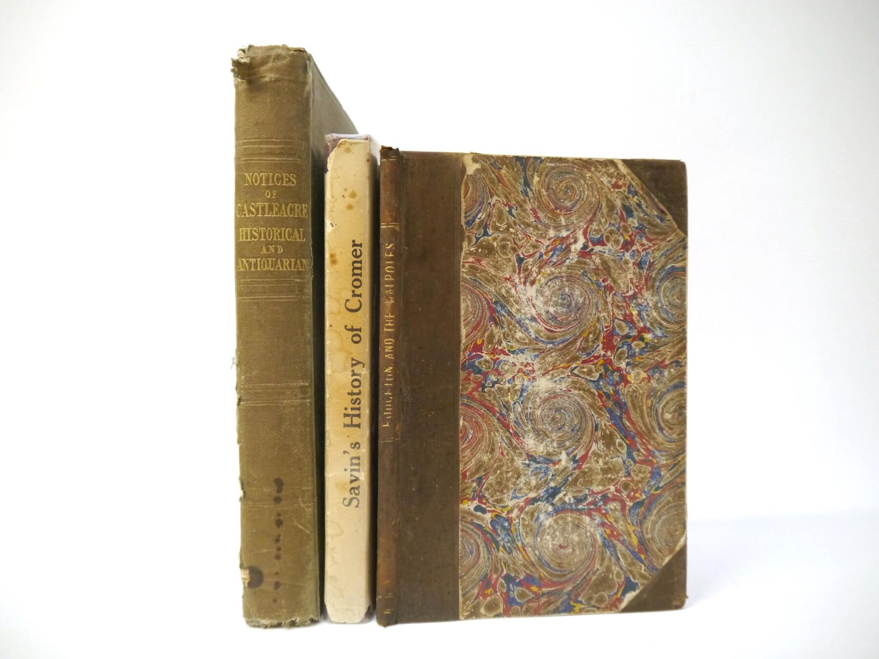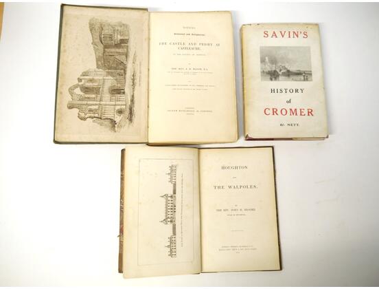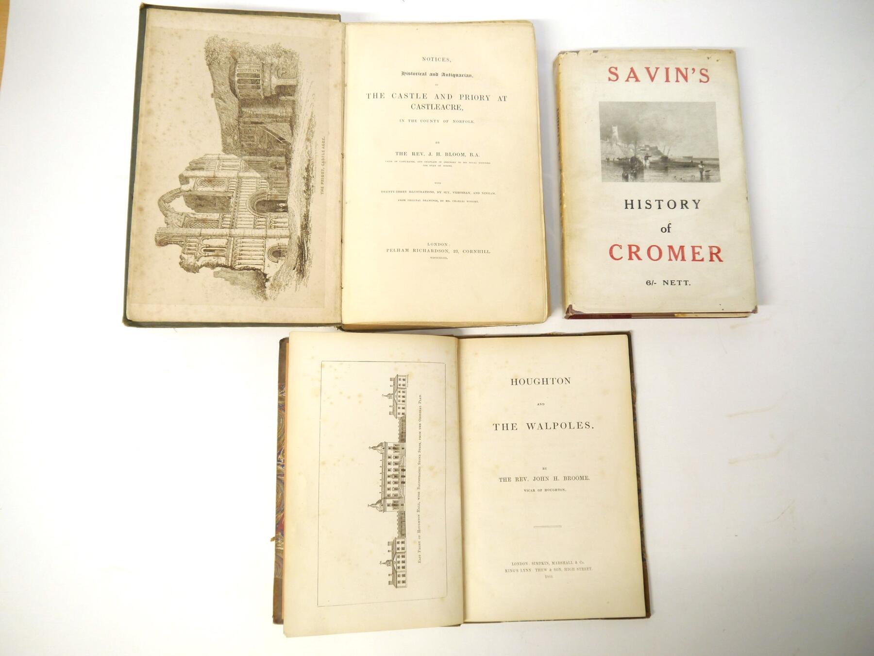 Rev. John H Broome: 'Houghton and The Walpoles', London & Lynn, 1865, 1st edition, engraved frontis, 43pp, contemporary calf gilt, plus Bloom: 'Notices of the Castle and Priory at Castleacre', London, 1843, 1st edition, frontis and 11 plates and 4 plans and illustrations in text as called for, original cloth gilt (worn); plus Savin's History of Cromer, 1937, 1st edition, original cloth gilt, dust wrapper (3)