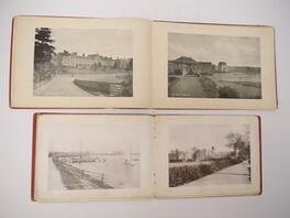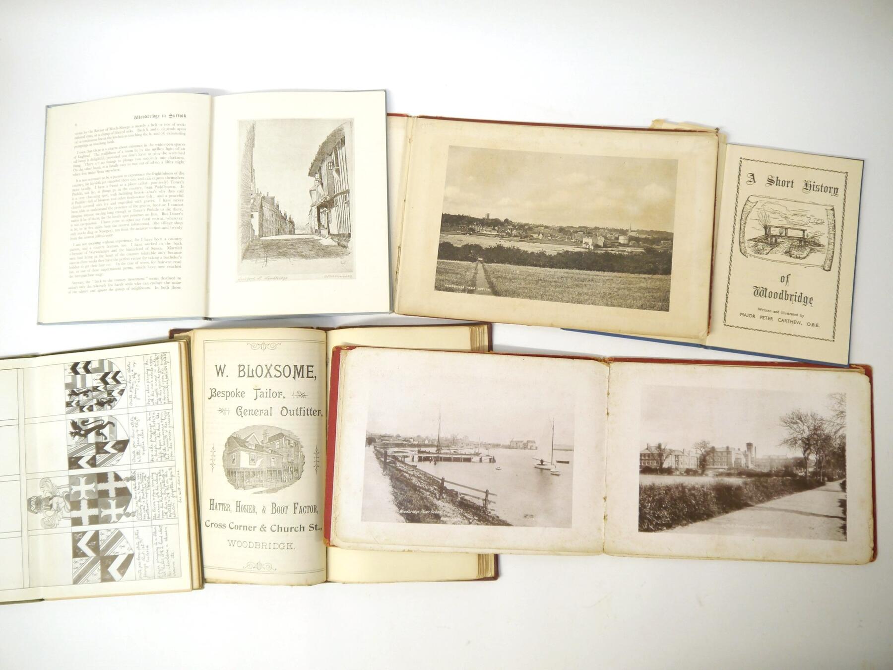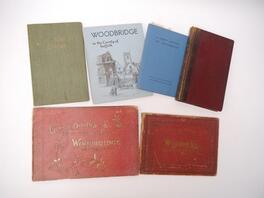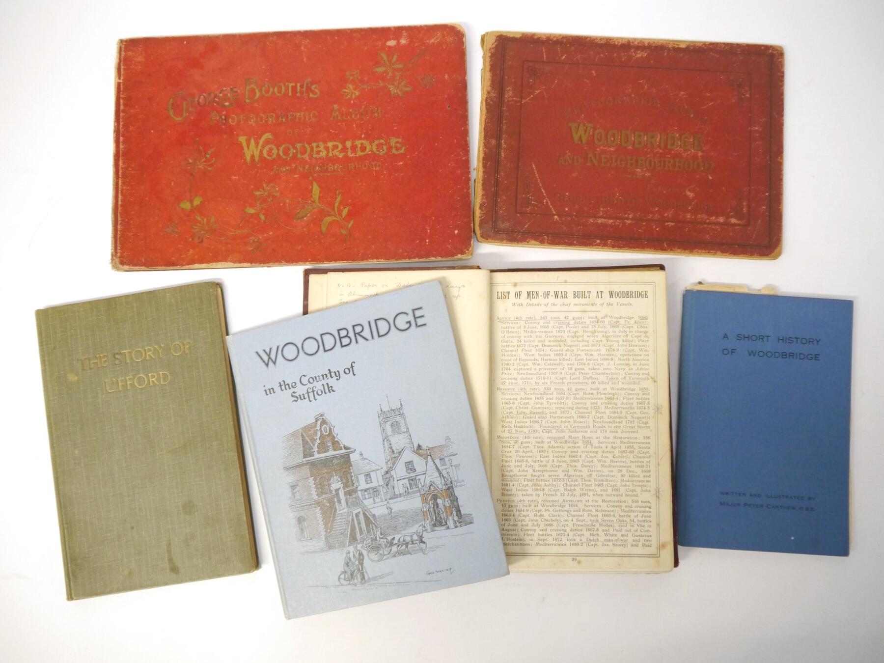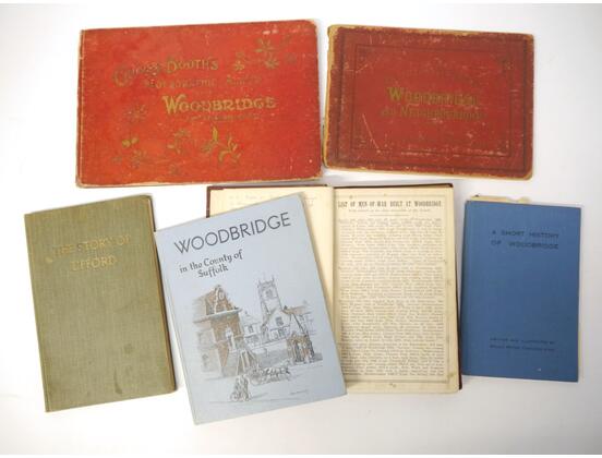 Six titles Woodbridge and environs, including Major Peter Carthew: 'A Short History of Woodbridge', [1950], original cloth; Vincent B. Restone & others, a composite bound album of extracts on Woodbridge etc from 'Booth's Almanack', circa 1897-1904, Vincent redstone's copy with his ownership signature to FFEP, contemporary quarter calf gilt; plus 2 George Booth view albums Woodbridge circa late 19th/early 20th Century, larger format album (19 x 28cm) with 20 plates including Seckford Hall, Ufford Church and Martlesham Red Lion, the other (17 x 24cm) with 18 views on 8 leaves, each oblong, original boards gilt (worn); plus 'The Story of Ufford' by R W Maitland, 1879, printed by W E Harrison of Ipswich, colour image of Ufford Place pasted in, original cloth gilt; plus Dudley Symon: 'Woodbridge in Suffolk', [1934], original pictorial cloth (6)