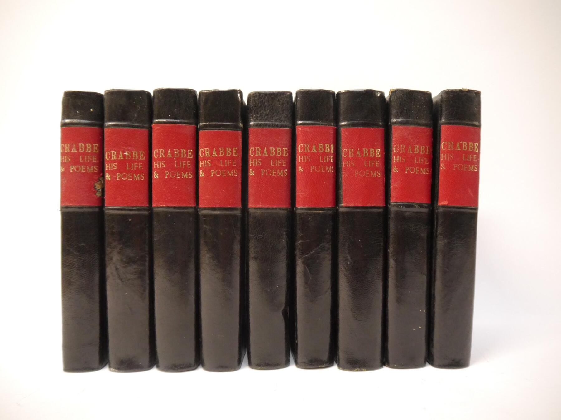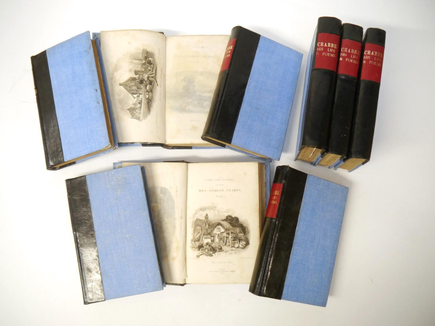 George Crabbe: 'The Poetical Works of the Rev. George Crabbe: With his letters and journals, and his life, by his son', London, John Murray, 1834, 8 volumes, each with engraved frontis and added engraved title page as called for; plus 'Life of The Rev. George Crabbe, LLB by his son', Murray, 1838, new edition, 15 engraved plates, rebound uniform quarter calf (9). George Crabbe (1754-1832), known as Aldeburgh's Poet, was educated at Bungay and later Stowmarket, was married in Beccles and for 13 years had a living as a clergyman in Parham, Great Glemham and Rendham, eventually gaining poetic fame and capturing the imagination of his peers with his ''realistic narrative poetry'' based on the middle and working classes of the time