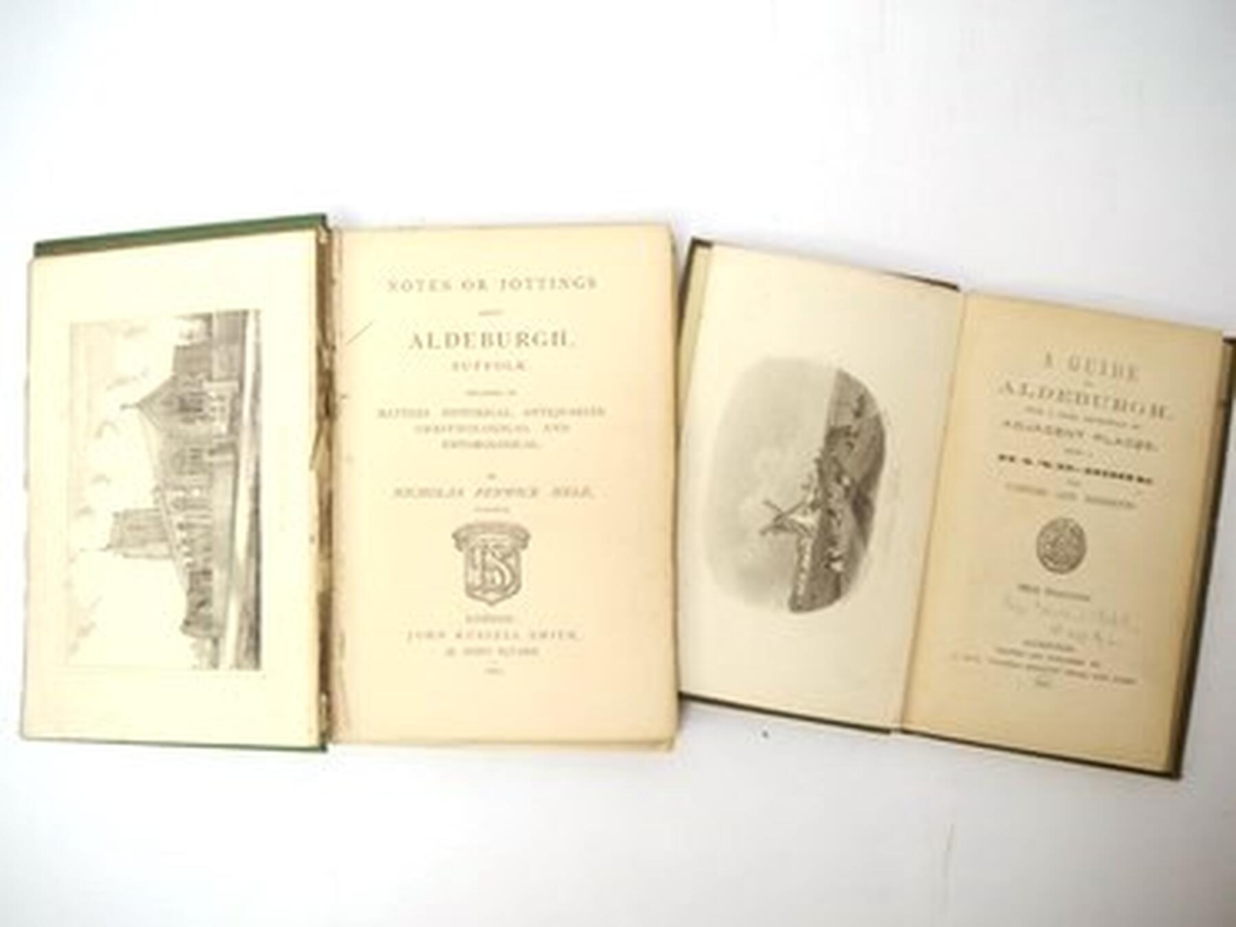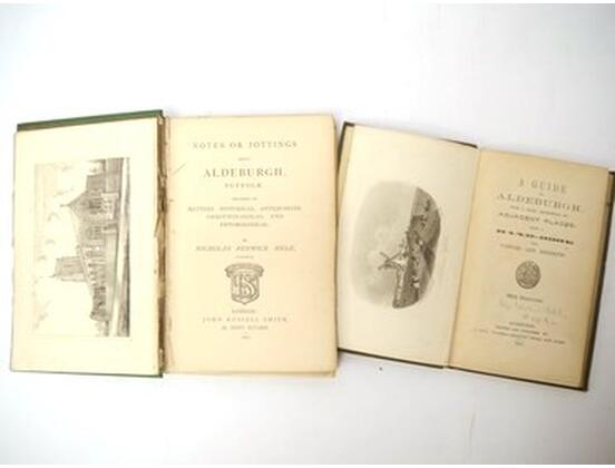 [Edward Clodd]: A guide to Aldeburgh : with a brief description of adjacent places: being a hand-book for visitors and residents', Aldeburgh, J. Buck, 1861, 1st edition, 8 engraved views by Rock Brothers as called for, original blind stamped cloth gilt, very scarce; plus N.F. Hele: 'Notes or Jottings about Aldeburgh, Suffolk', London, 1870, 1st edition, 5 plates as called for, original pictorial cloth gilt, text block split, some leaves loose (2)