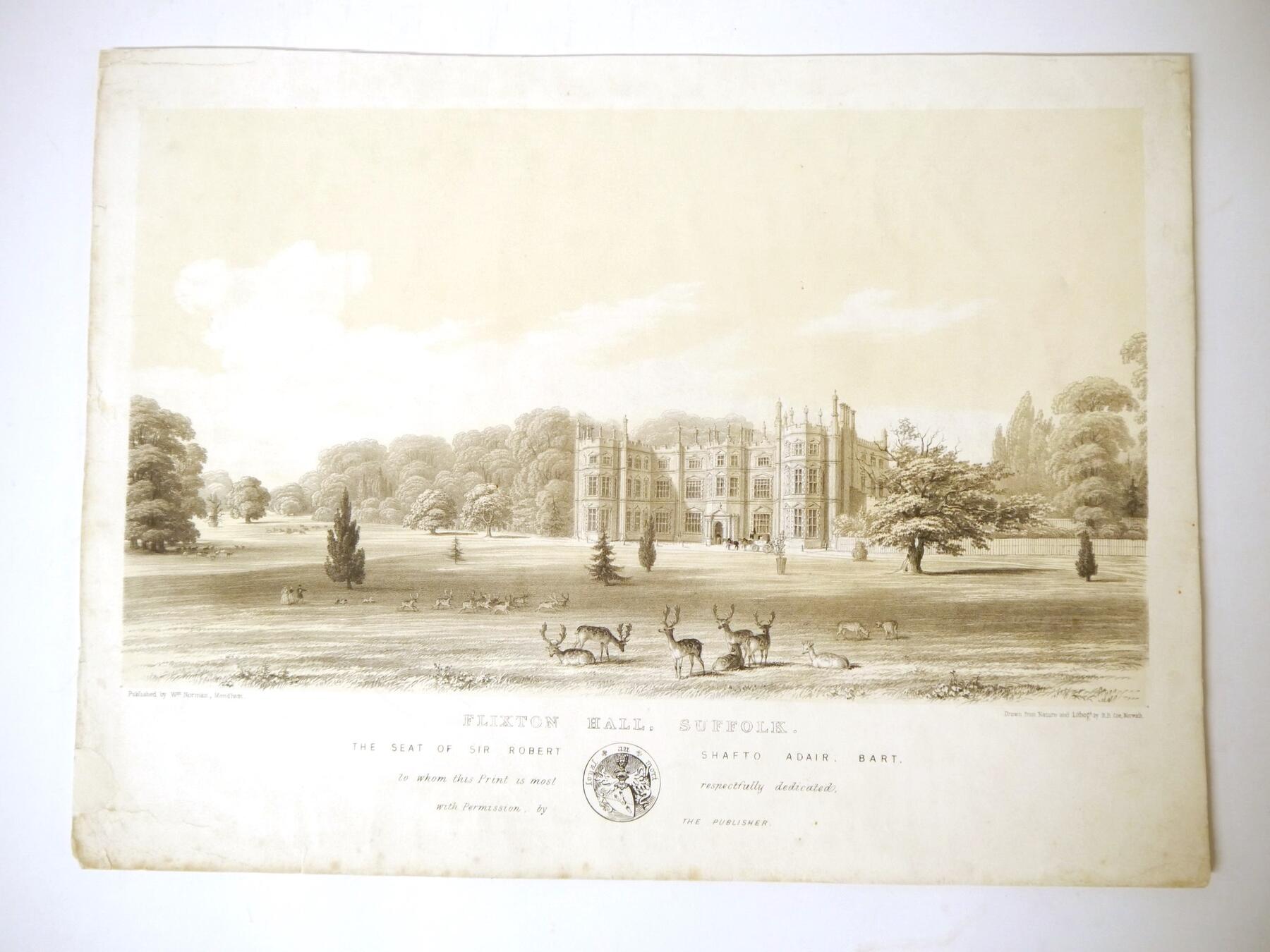 A 19th Century Lithograph of Flixton Hall, Suffolk, by R.B Coe for William Norman, Mendham, with armorial of Sir Robert Shafto Adair, image approx 25 x 42.5cm, scarce