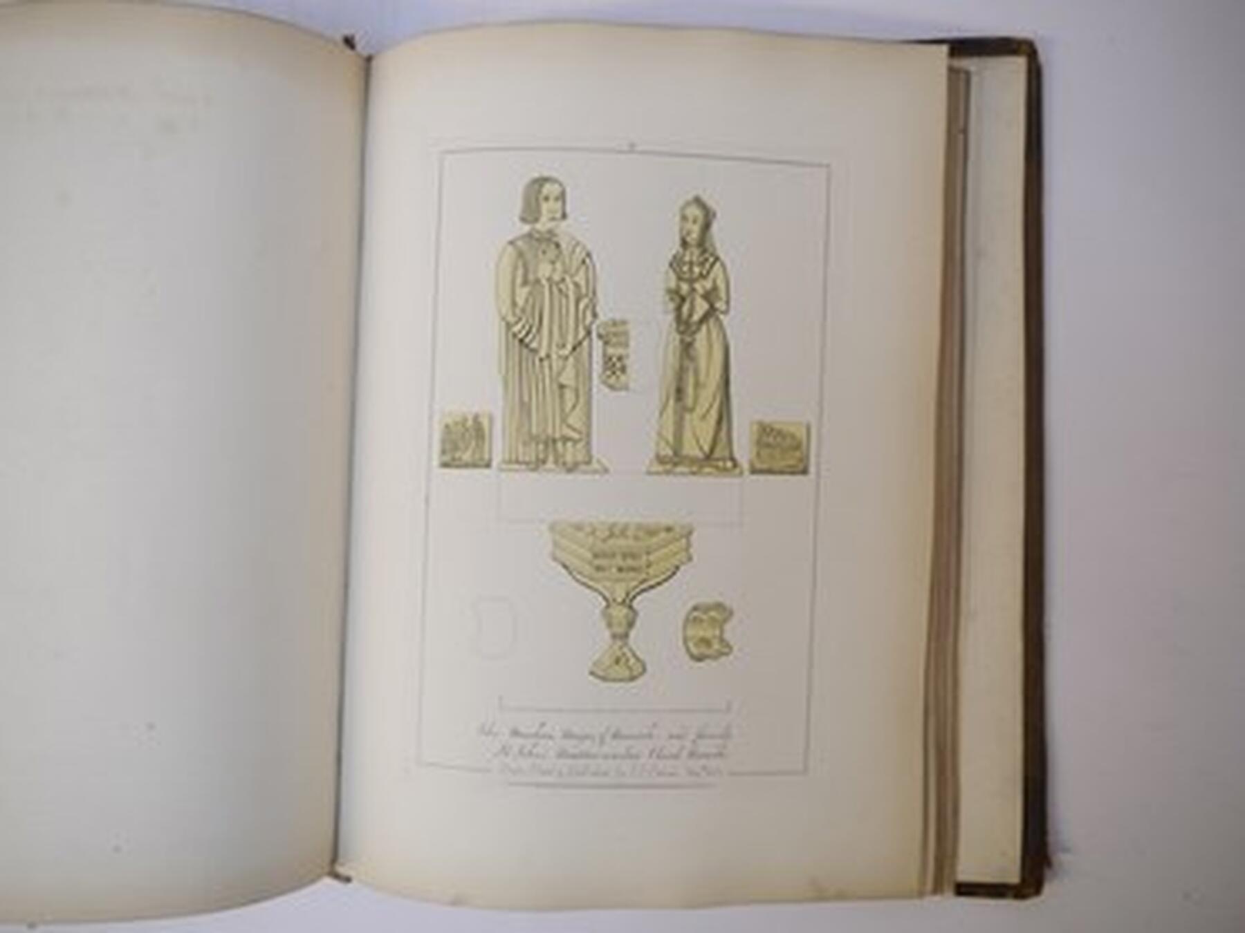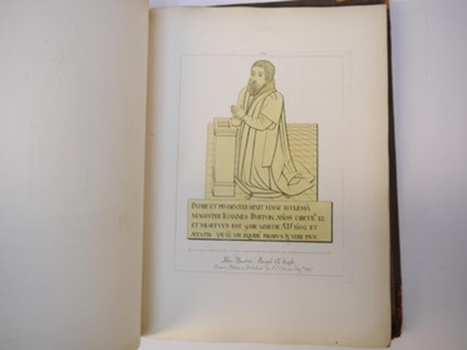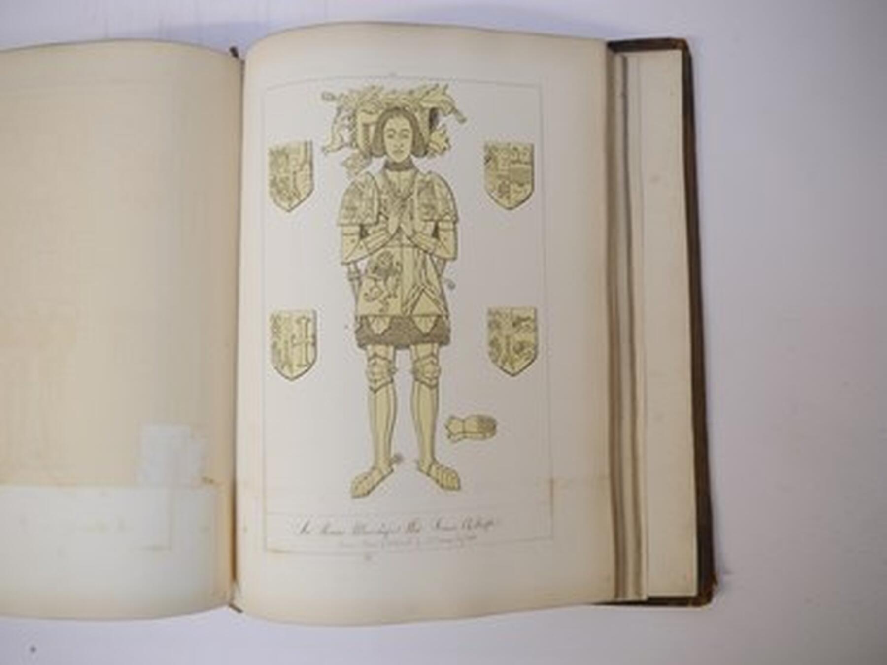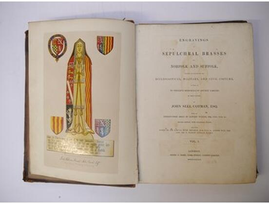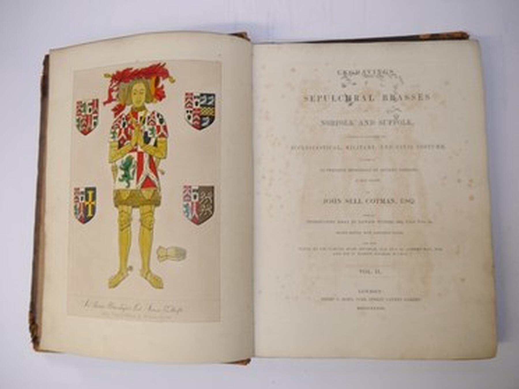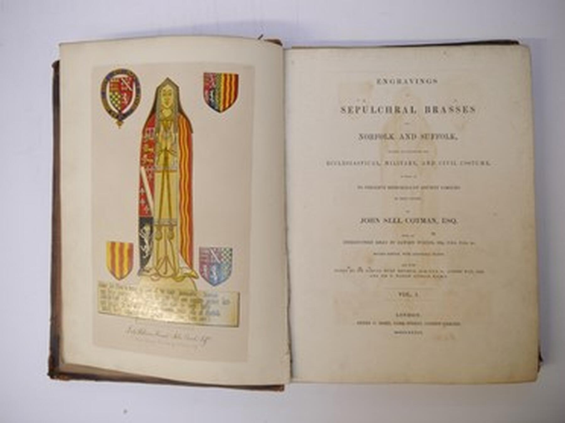 John Sell Cotman: 'Engravings of sepulchral brasses in Norfolk and Suffolk : tending to illustrate the ecclesiastical, military, and civil costume as well as to preserve memorials of ancient families in that county', London, Henry G. Bohn, 1839, 2nd edition, 2 volumes, 171 plates comprising 2 coloured frontispieces + 169 mainly hand tinted plates, many folding, folio, contemporary half calf gilt (very worn), all edges gilt (2)