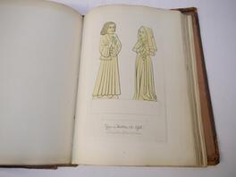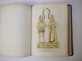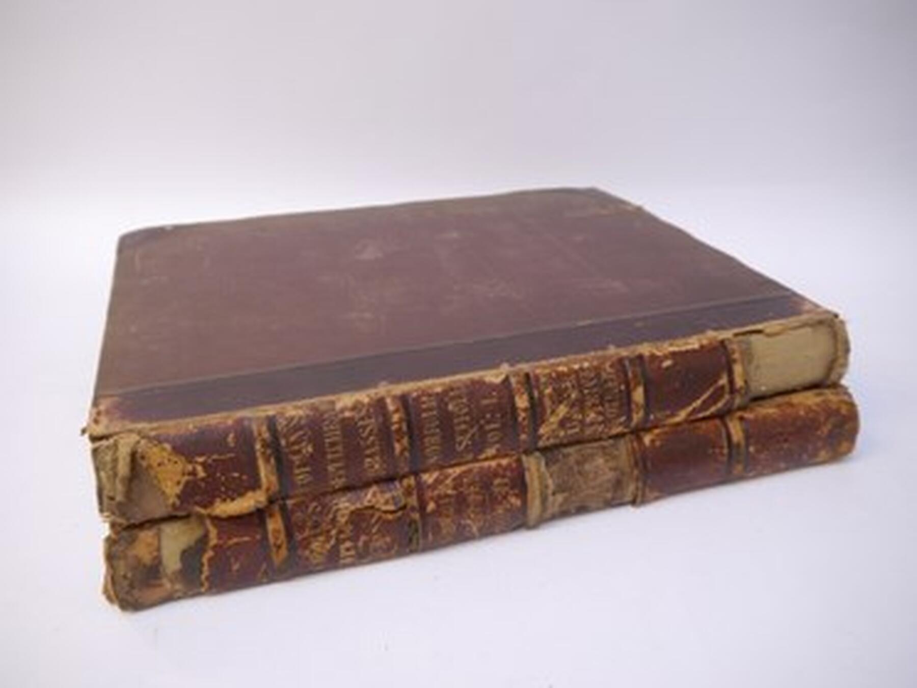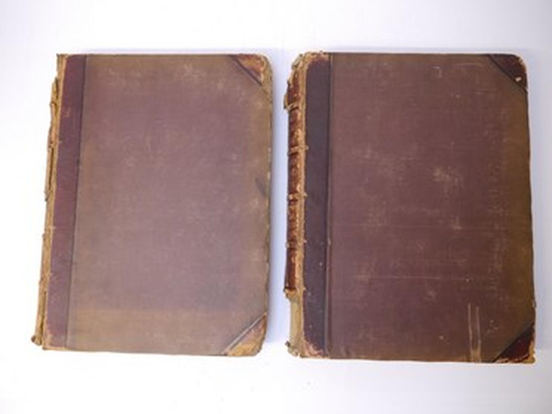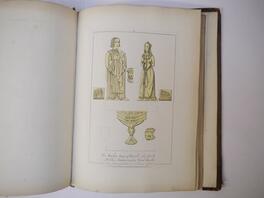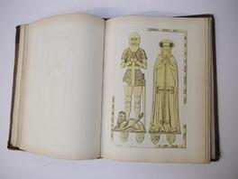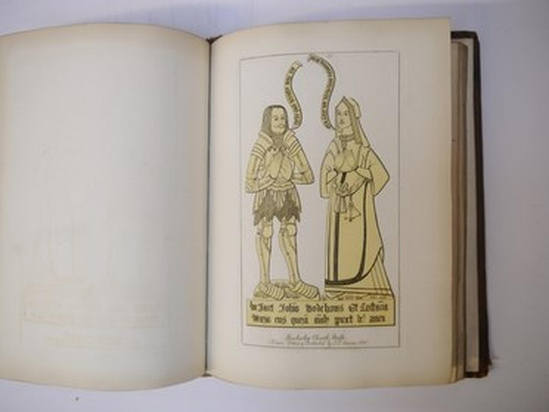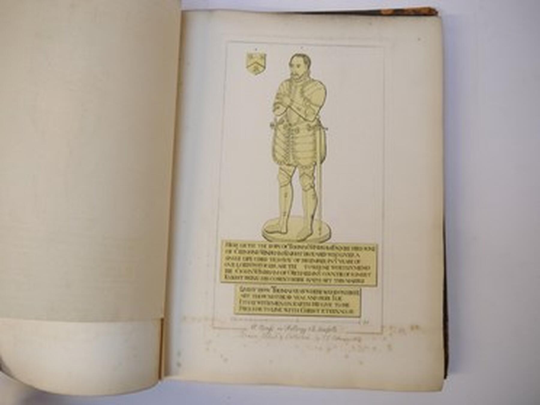 John Sell Cotman: 'Engravings of sepulchral brasses in Norfolk and Suffolk : tending to illustrate the ecclesiastical, military, and civil costume as well as to preserve memorials of ancient families in that county', London, Henry G. Bohn, 1839, 2nd edition, 2 volumes, 171 plates comprising 2 coloured frontispieces + 169 mainly hand tinted plates, many folding, folio, contemporary half calf gilt (very worn), all edges gilt (2)