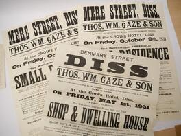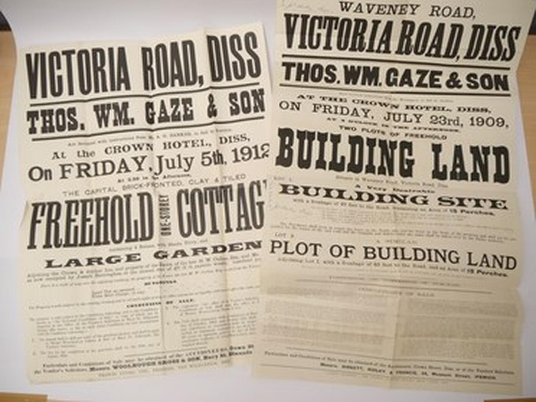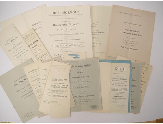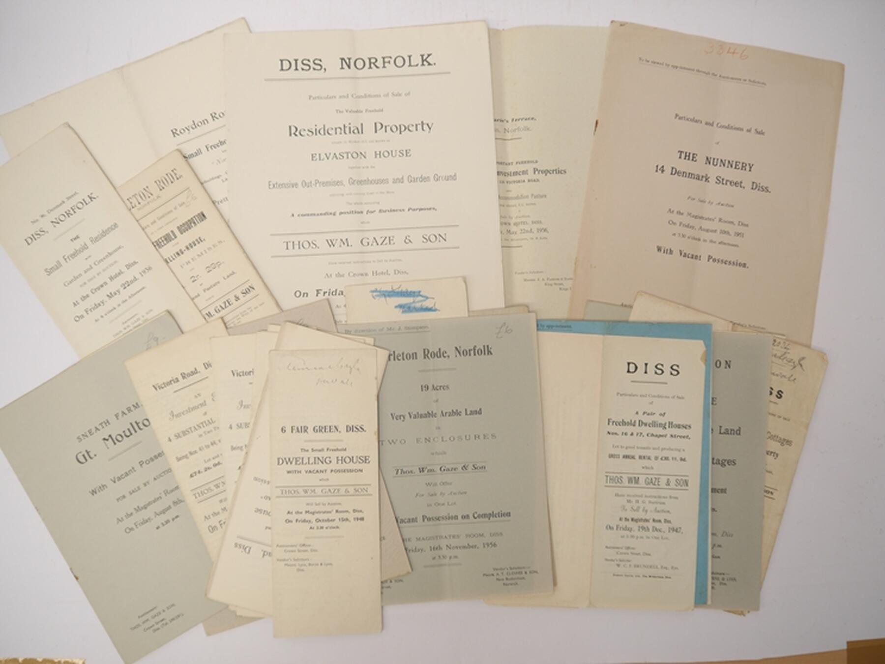 A packet containing 25 sale particulars circa 1930's-1960's, mainly properties in Diss including Nunnery etc., couple Great Moulton and Carleton Rode; 5 sale posters for properties in Diss on Mere Street, Victoria Road, Denmark Street, 1909-1931, all T.W. Gaze auctioneer
