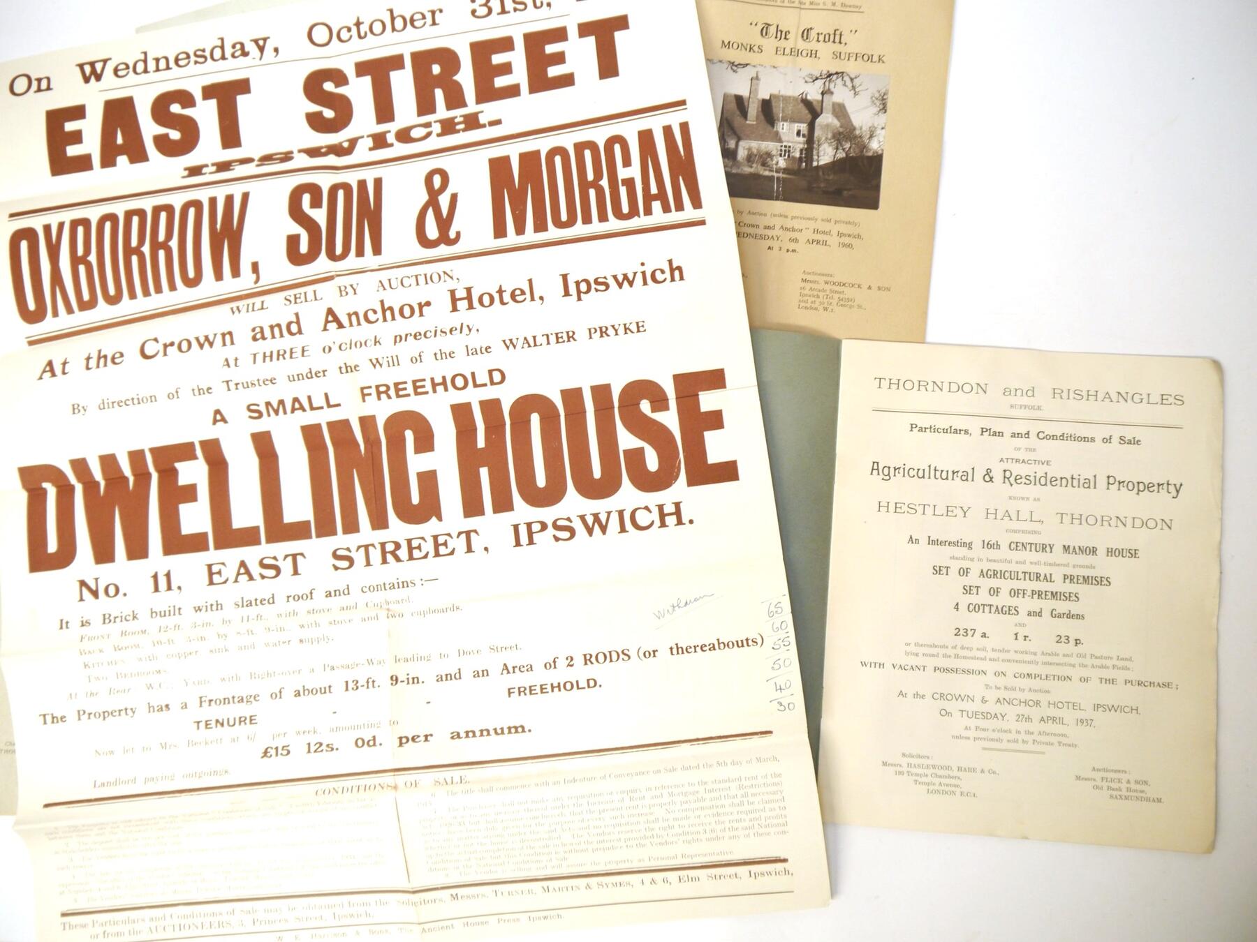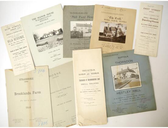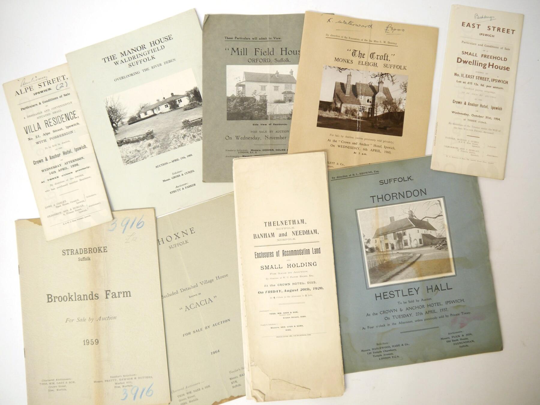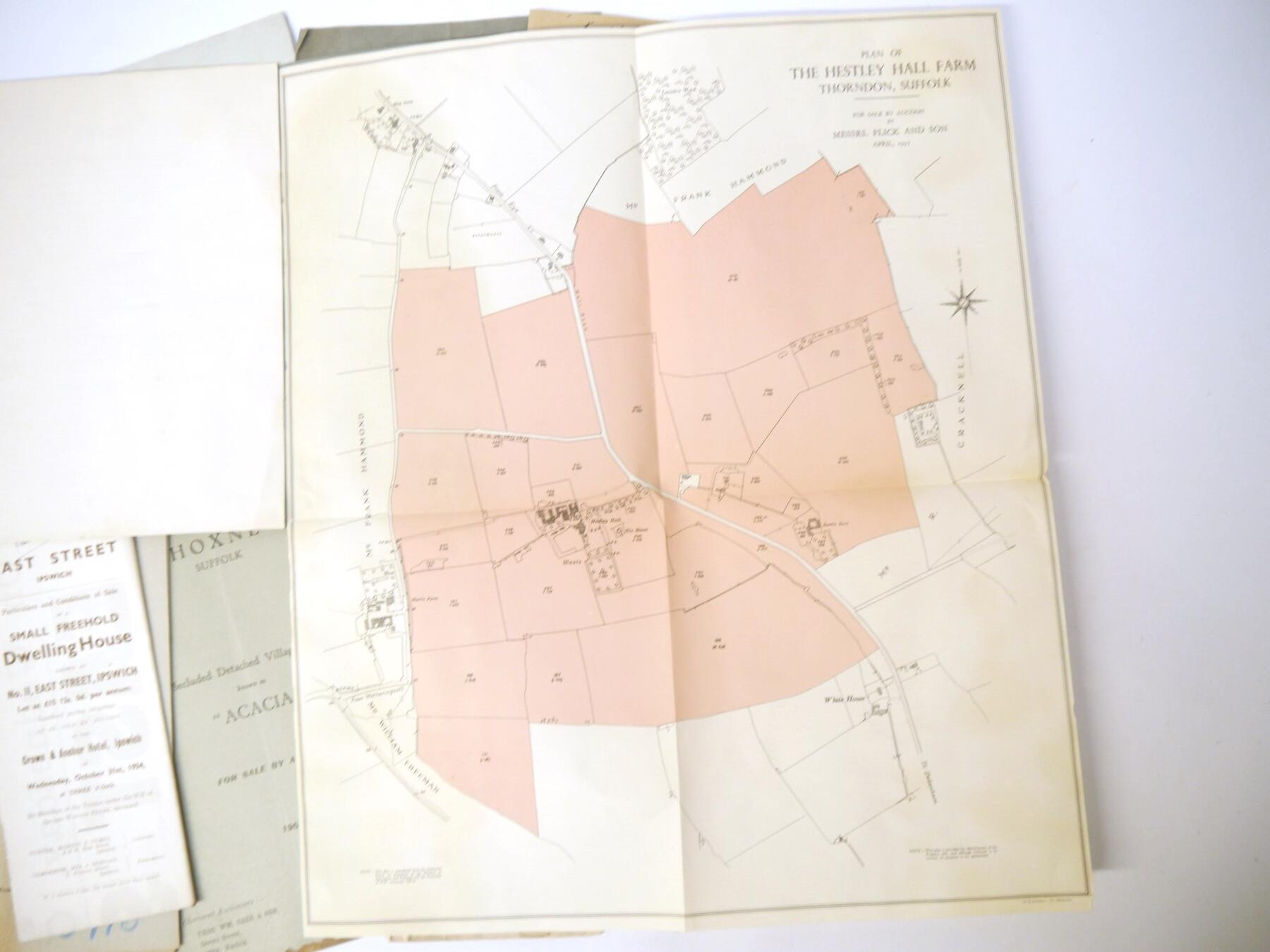 Packet sale particulars incl Hestley Hall, Thorndon, Suffolk, 1937, folding plan, illustration from photo mounted to top wrap, plus 10 others 1920's-1960's including Stradbroke, Hoxne, Thelnetham etc