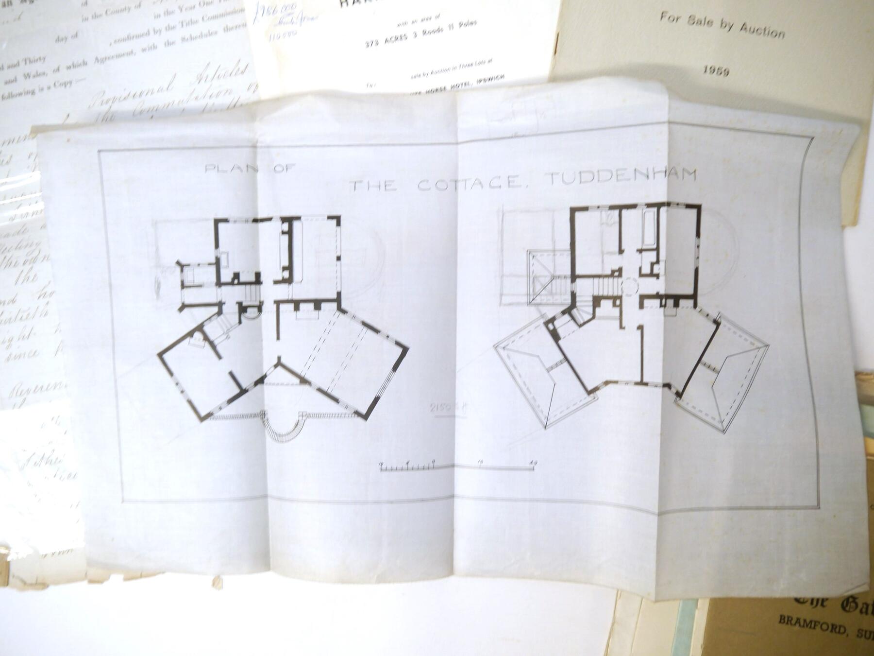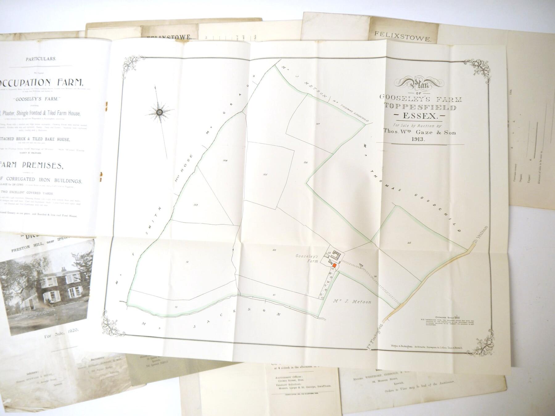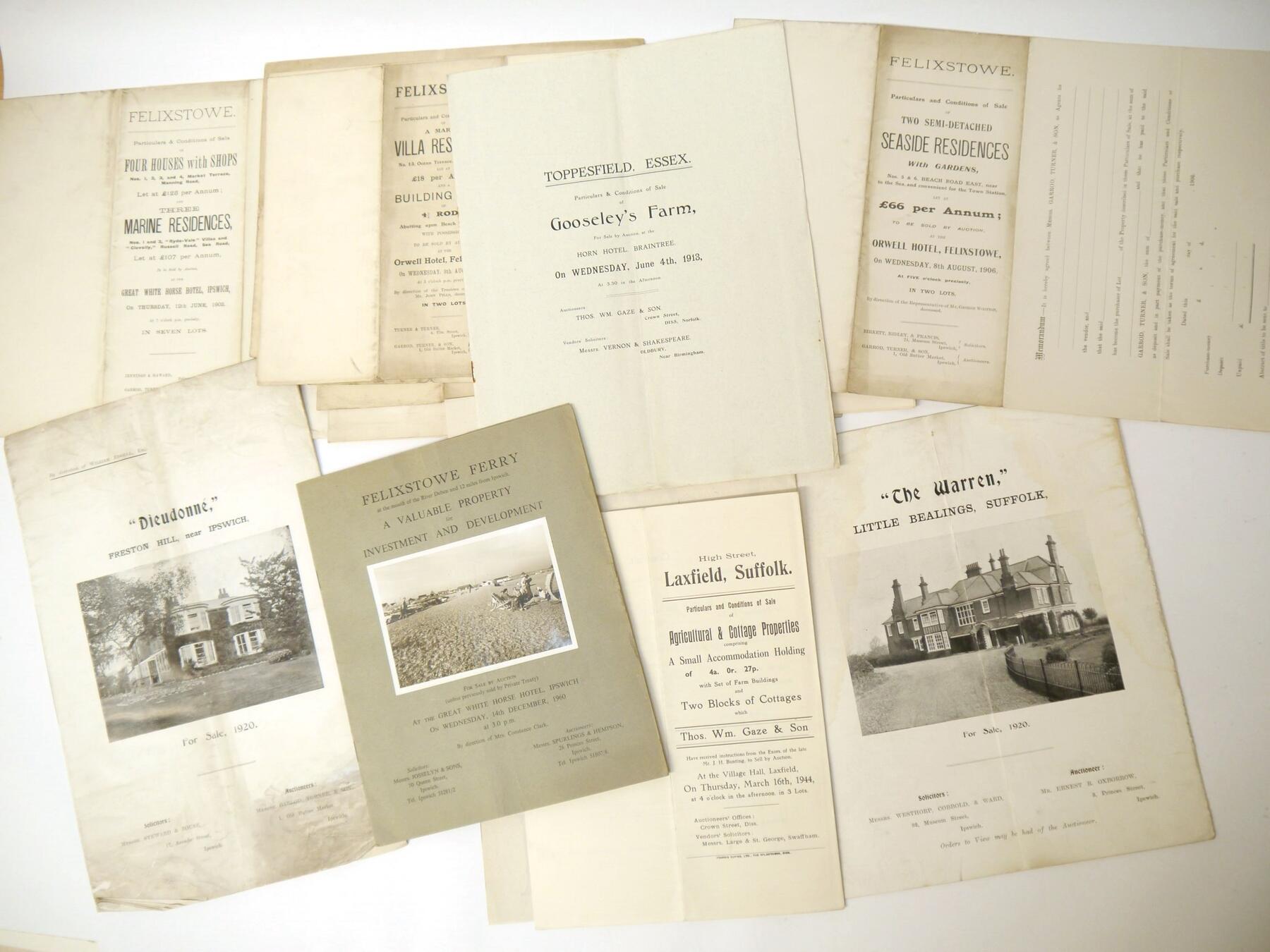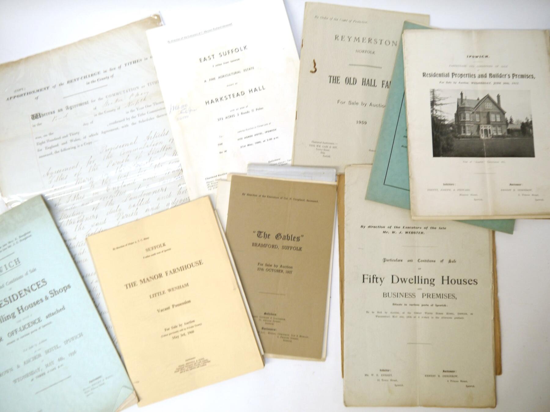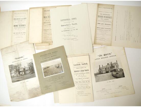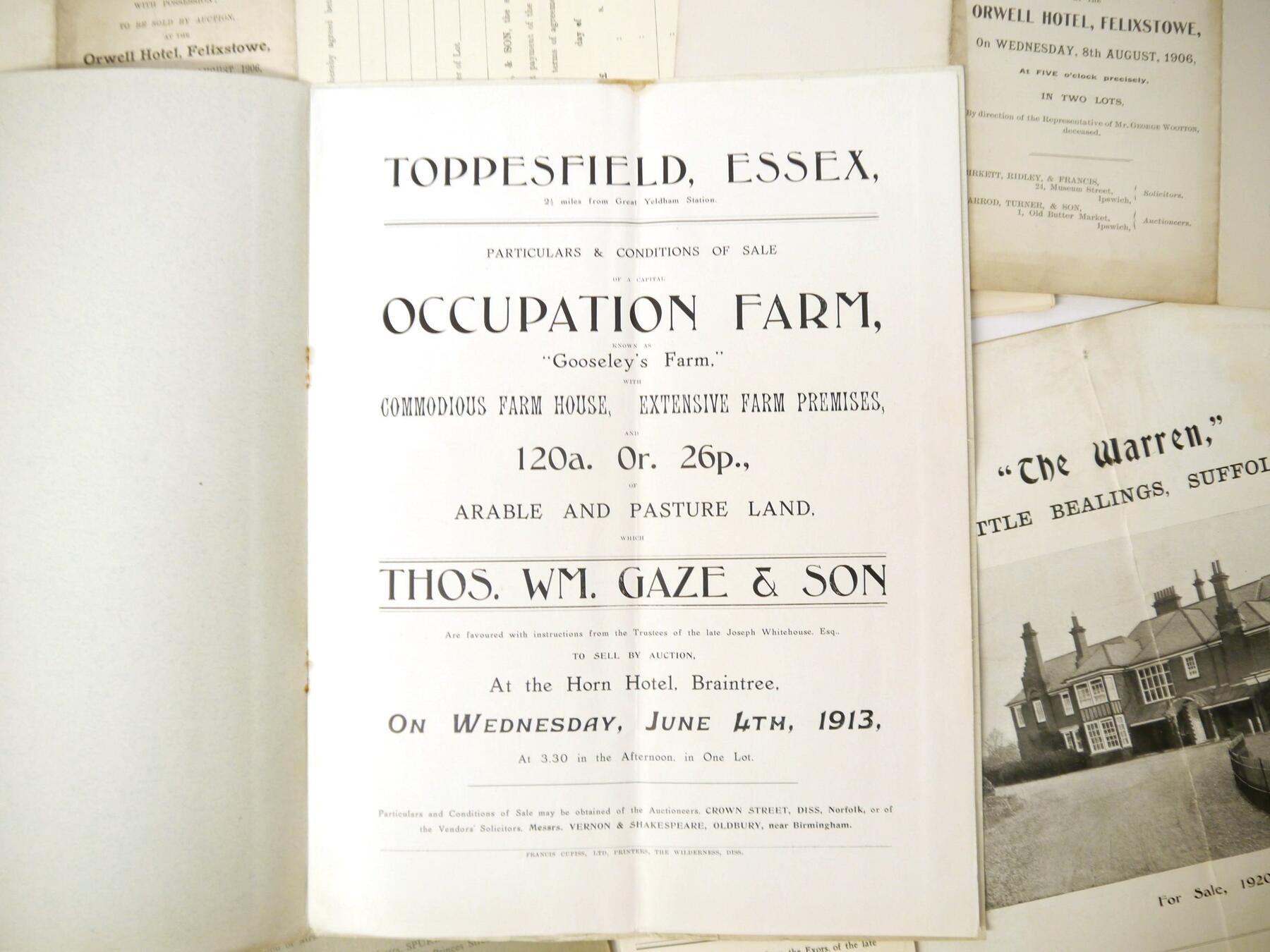 Two packets of approx 25 sale particulars, mainly mid 20th Century, Ipswich including St Matthews Lodge with plan and photo; Scawfell; Harkstead Hall etc, plus others Ipswich & Felixstowe, Topplesfield Essex ''Goosely's Farm'' 1913 etc (2)