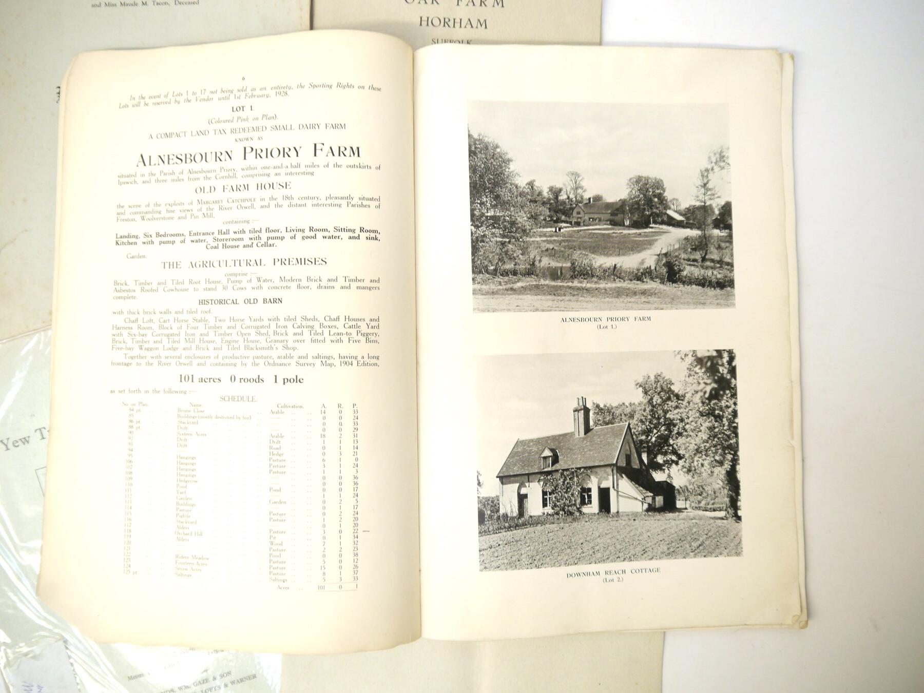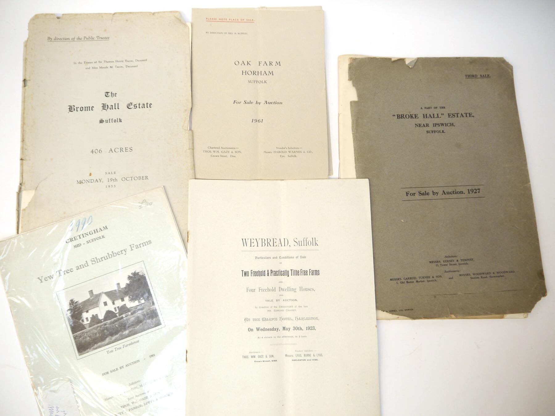 A packet of sale particulars including Brome Hall 1953; Weybread 1923, with folding plan; Horham; Cretingham; Broke Hall Estate 1927