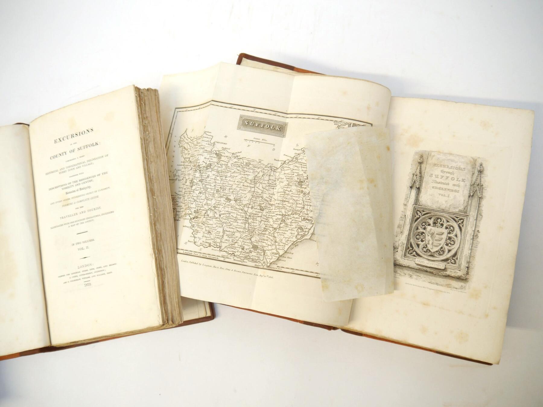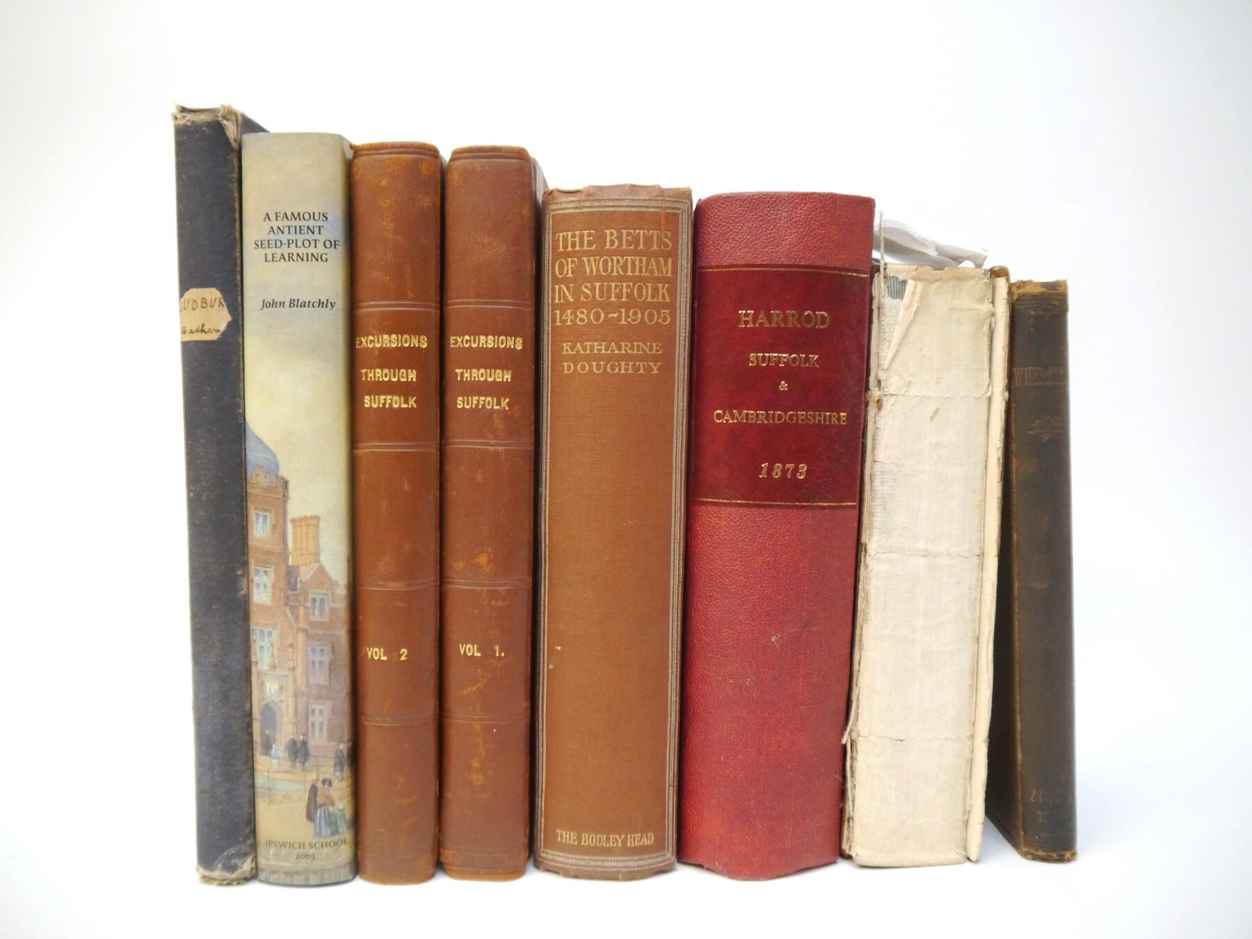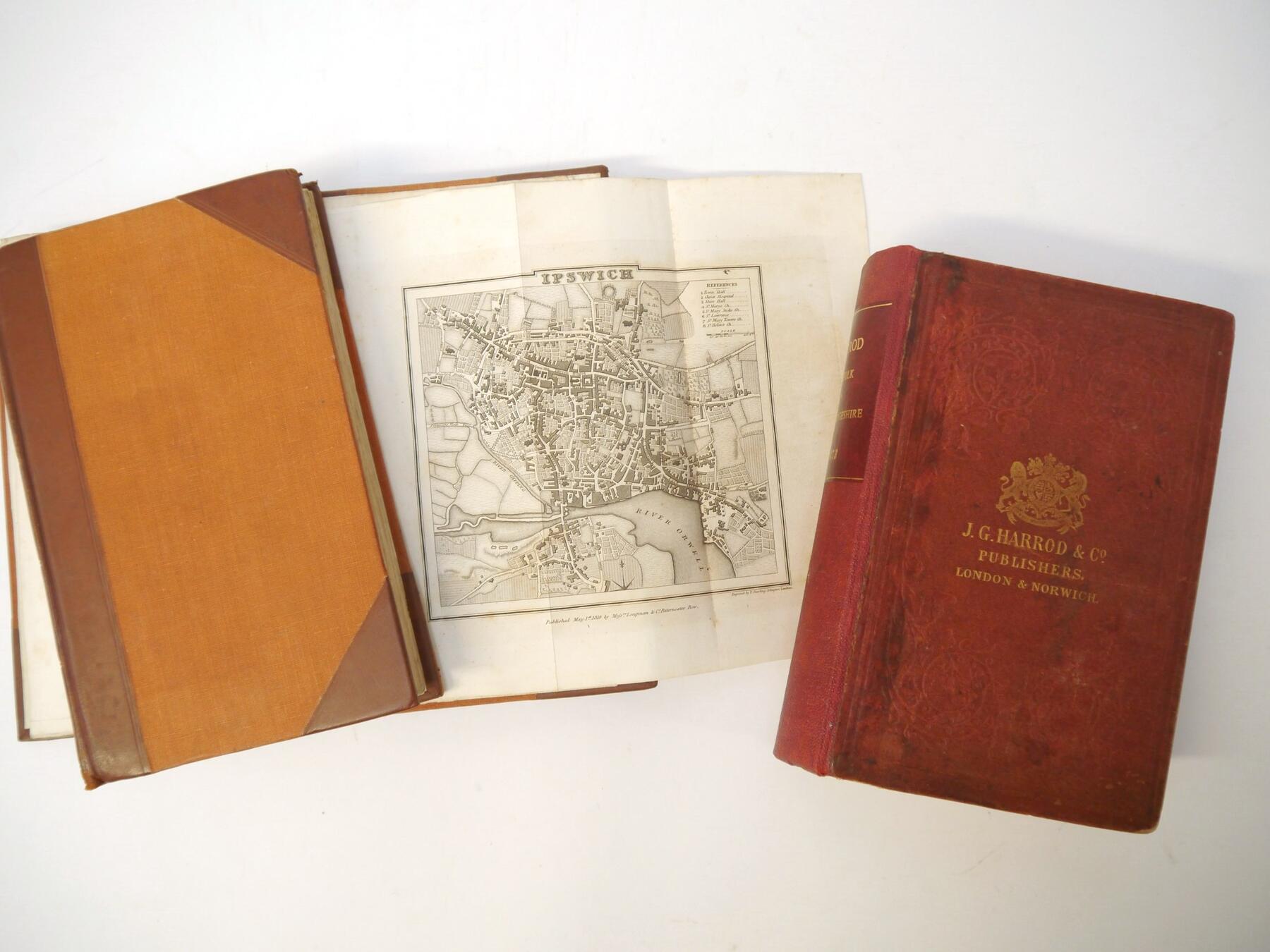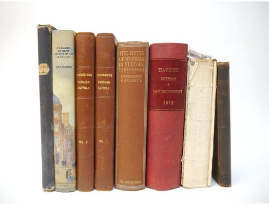 Eight Suffolk interest volumes, including Thomas Kitson Cromwell: 'Excursions in the County of Suffolk', London, 1818, 2 volumes, large paper copy, folding map of Suffolk, folding plan of Ipswich, 2 added engraved title pages and 96 plates as called for, rebound half calf gilt; Kirby: 'The Suffolk Traveller', London, 1764, 2nd edition, large hand coloured folding map of Suffolk + four folding road strip maps + 12 plates, xvi, 340pp, bound together with Richard Canning: 'An Account of the Gifts & Legacies... bequeathed to the town of Ipswich', 1747, vi,201,[2]pp., and 'An Historical Account of the Twelve Prints... in the county of Suffolk...by Joshua Kirby', 1748, [4],36,4pp, contemporary calf gilt, lacks bakcstrip, top board detached (but present), from Monks Hall Syleham; 'Harrod & Co's Directory of Suffolk & Cambridgeshire', 1873, a/f, title page and first few leaves supplied in facsimile, rebacked; Barham-Zincke: 'Some Materials For the History of Wherstead', 1887, maps and plates as called for, inscribed by author, original cloth (worn); plus Badham 'History of All Saints Church Sudbury', 1852, 'The Betts of Wortham' 1912, plus one other (8)