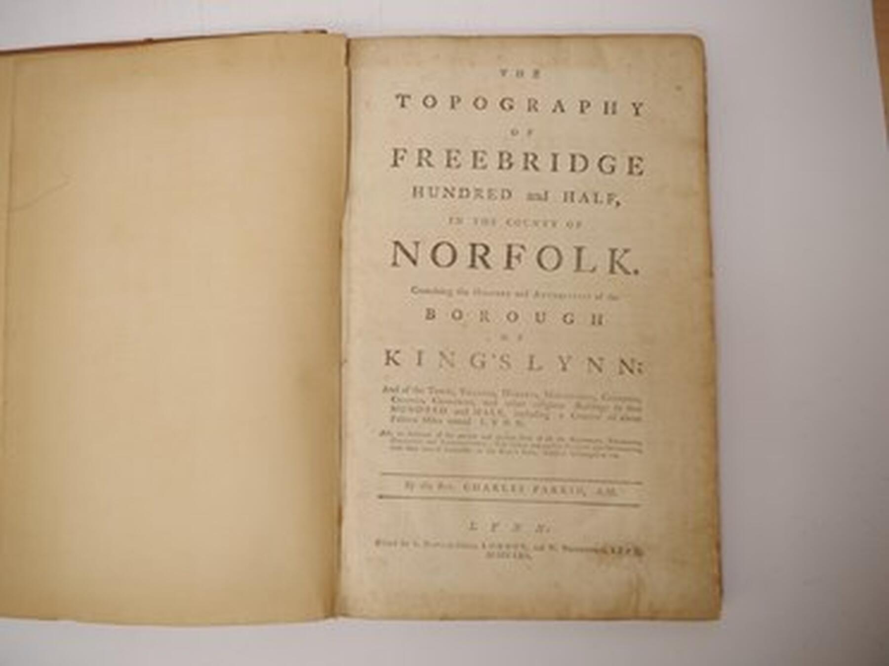 Charles Parkin: 'The Topography of Freebridge hundred and half, in the county of Norfolk', Lyn, 1762, 1st edition, folding engraved plan of Lynn by Henrico Bell 1725 loosely inserted, folding pedigrees etc as called for, folio, contemporary calf worn (top board near detached), bookplates of Bryan Hall of Old Rectory, Banningham, and Francis J Cresswell