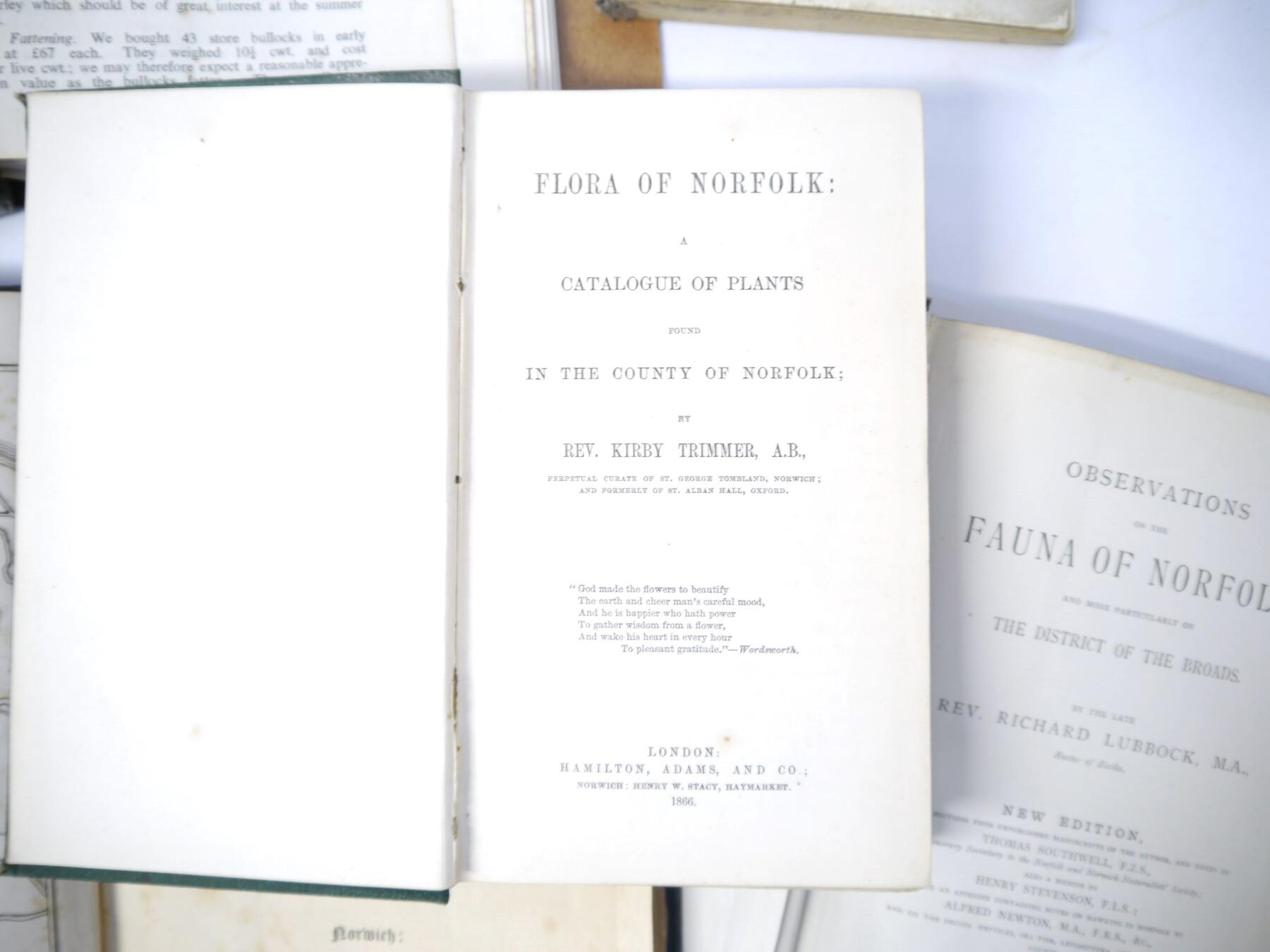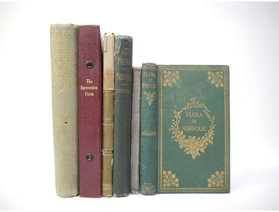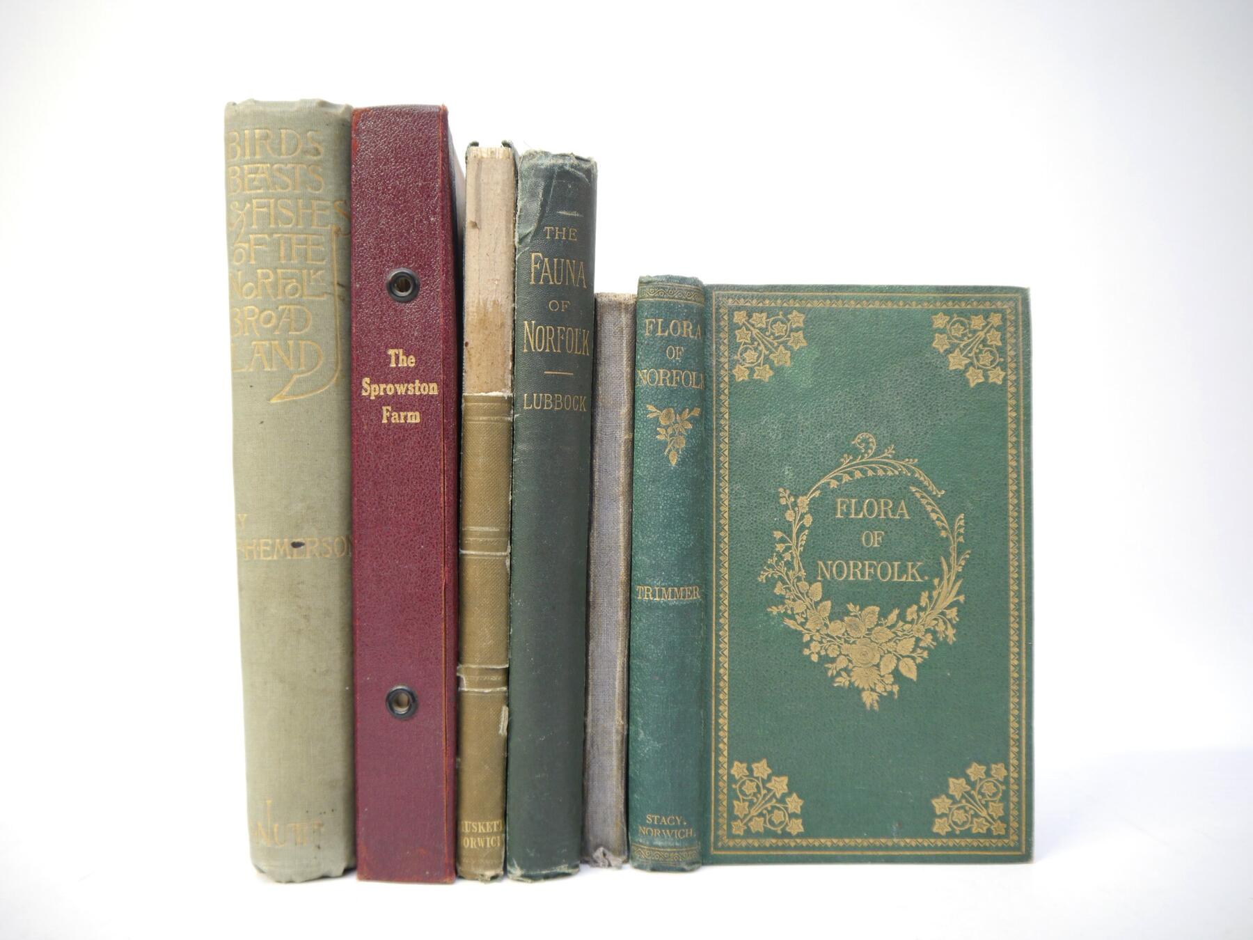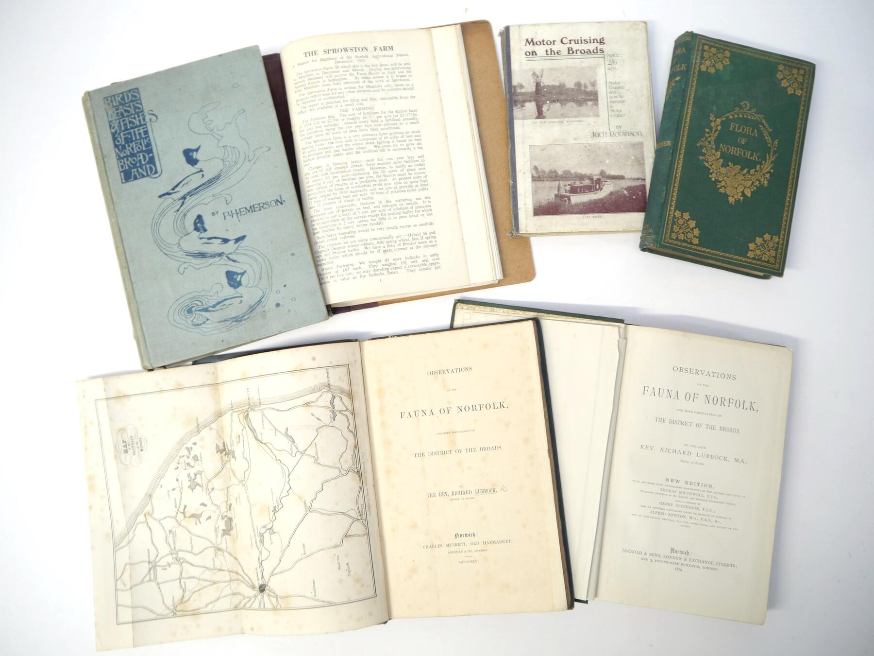 Rev. Kirby Trimmer: 'Flora of Norfolk', London, Hamilton Adams, 1866, original decorative cloth gilt, all edges gilt; Rev Richard Lubbock: 'Observations on the Fauna of Norfolk, and more particularly on the District of the Broads', Norwich, Charles Muskett, 1845, 1st edition, folding map + two plates as called for, original blind stamped cloth gilt (worn); plus a copy of the 1879 edition revised by Stevenson, Southwell and Newton, folding map + two plates as called for, original cloth gilt; P.H. Emerson: 'Birds, Beasts and Fishes of the Norfolk Broadland', London, Nutt, 1885, 1st edition, 24 ills. from photos on 8 leaves of plates + double page map, contemporary m/s pencil notes of a weeks tour on the broads to FFEP, original cloth backed pictorial boards, plus one other Norfolk interest (6)