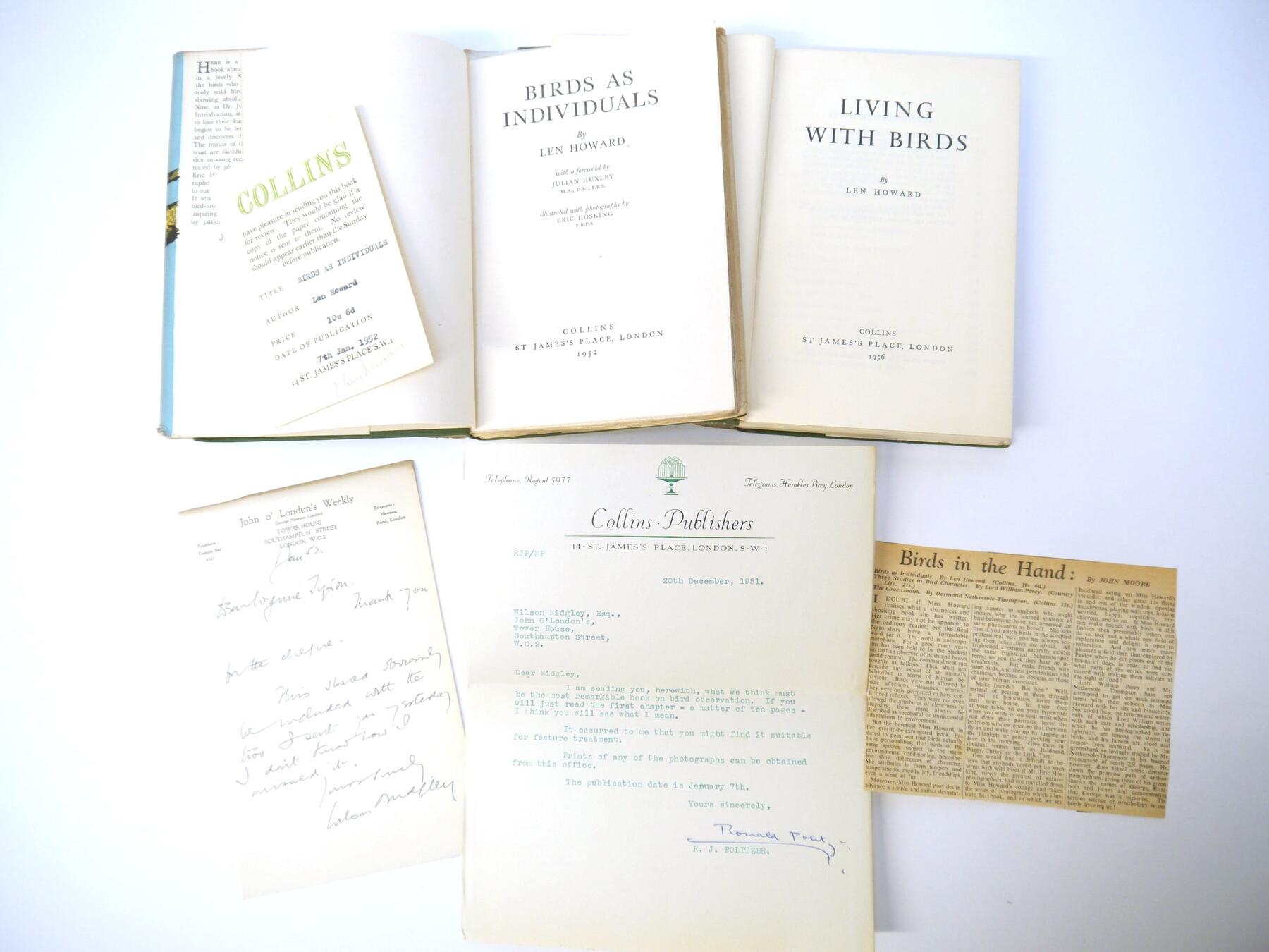Len Howard, 2 titles: 'Birds as Individuals', London, Collins, 1952, 1st edition, publisher's review copy with their printed slip and typed letter signed and autograph letter signed between publisher's and John o'Londons weekly loosely inserted, original cloth, dust wrapper, 'Living With Birds', Collins, 1956, 1st edition, original cloth, dust wrapper (2)