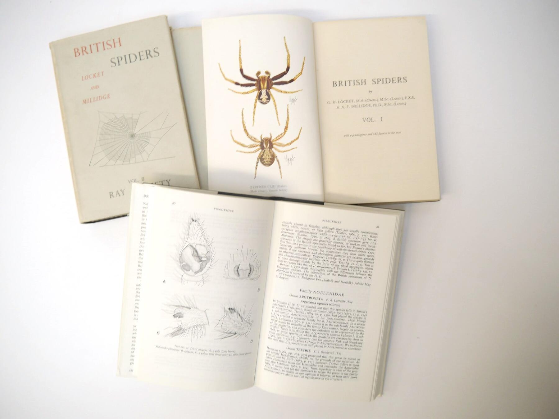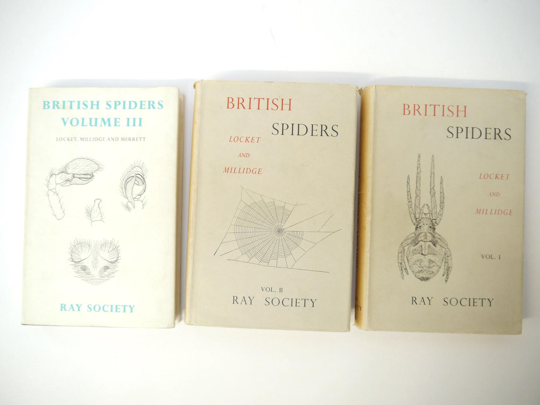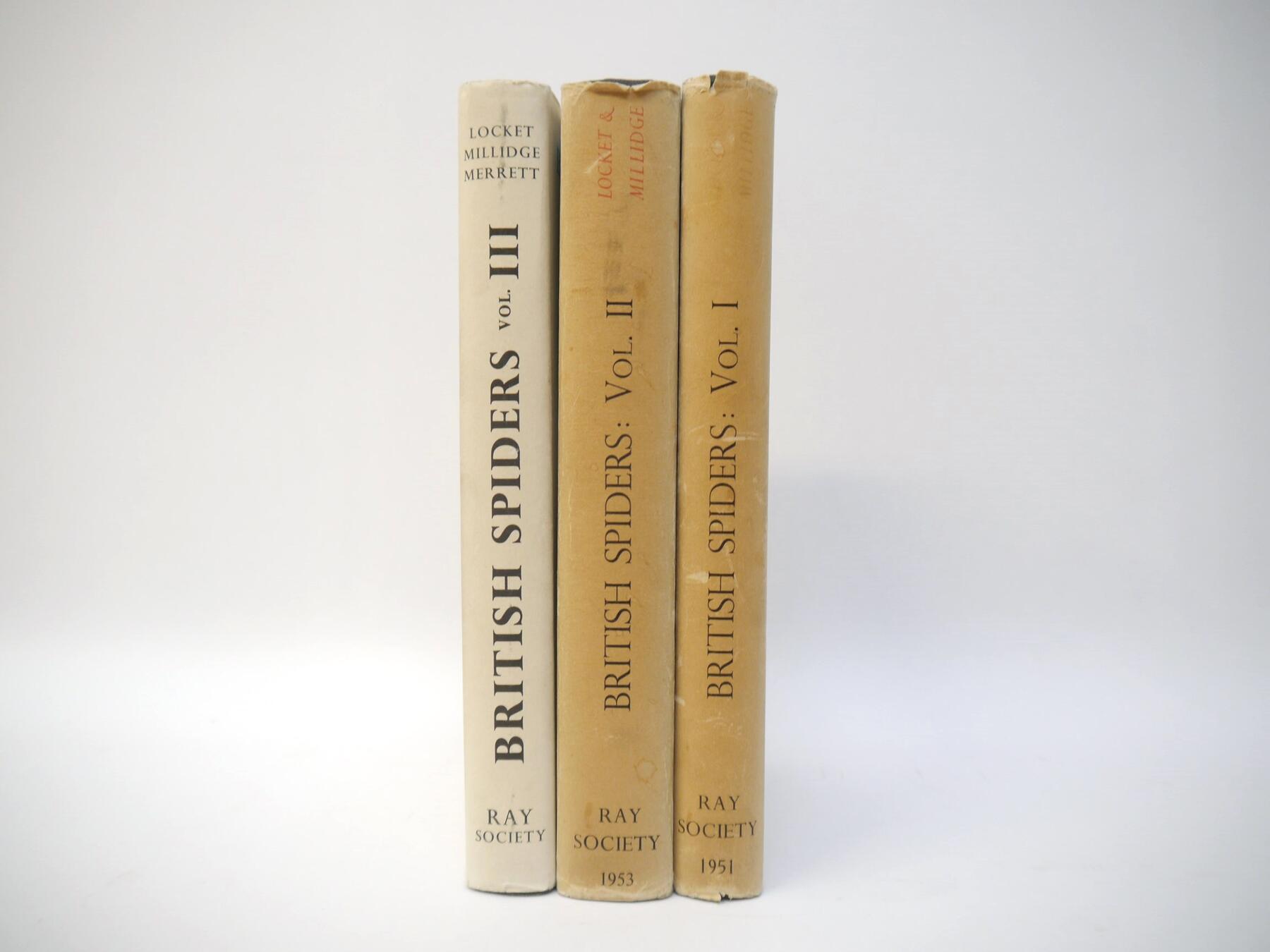 Locket, Millidge & Merett: 'British Spiders' London, Ray Society, 1951-1974, three volumes, coloured frontis, 471 figures, 612 maps, original cloth gilt, dust wrappers (3)