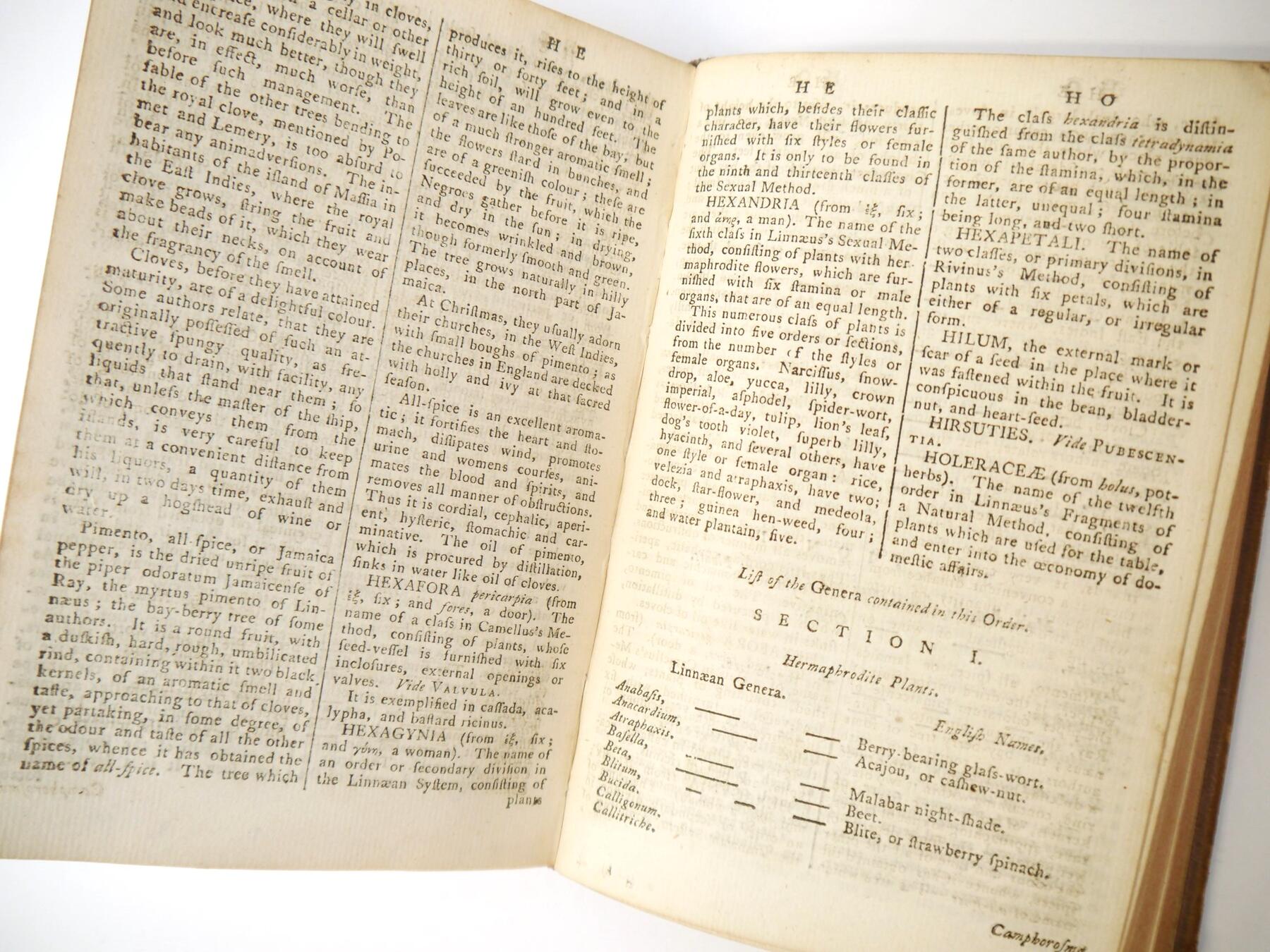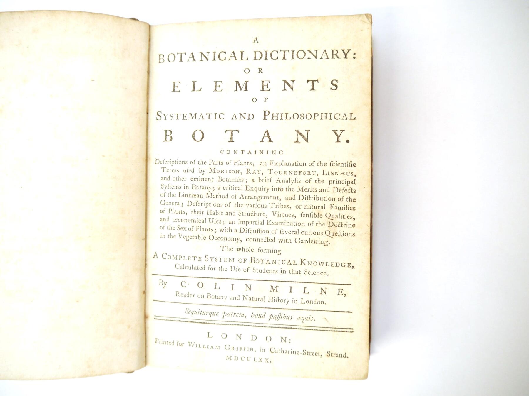Colin Milne: 'A Botanical Dictionary: or Elements of Systematic and Philosophical Botany', London, Griffin, 1770, 1st edition, [451]pp, two folding tables showing Tournefort, Linnaeus and Ray's methods of Classification, contemporary calf gilt, oxblood Morocco gilt title label to spine