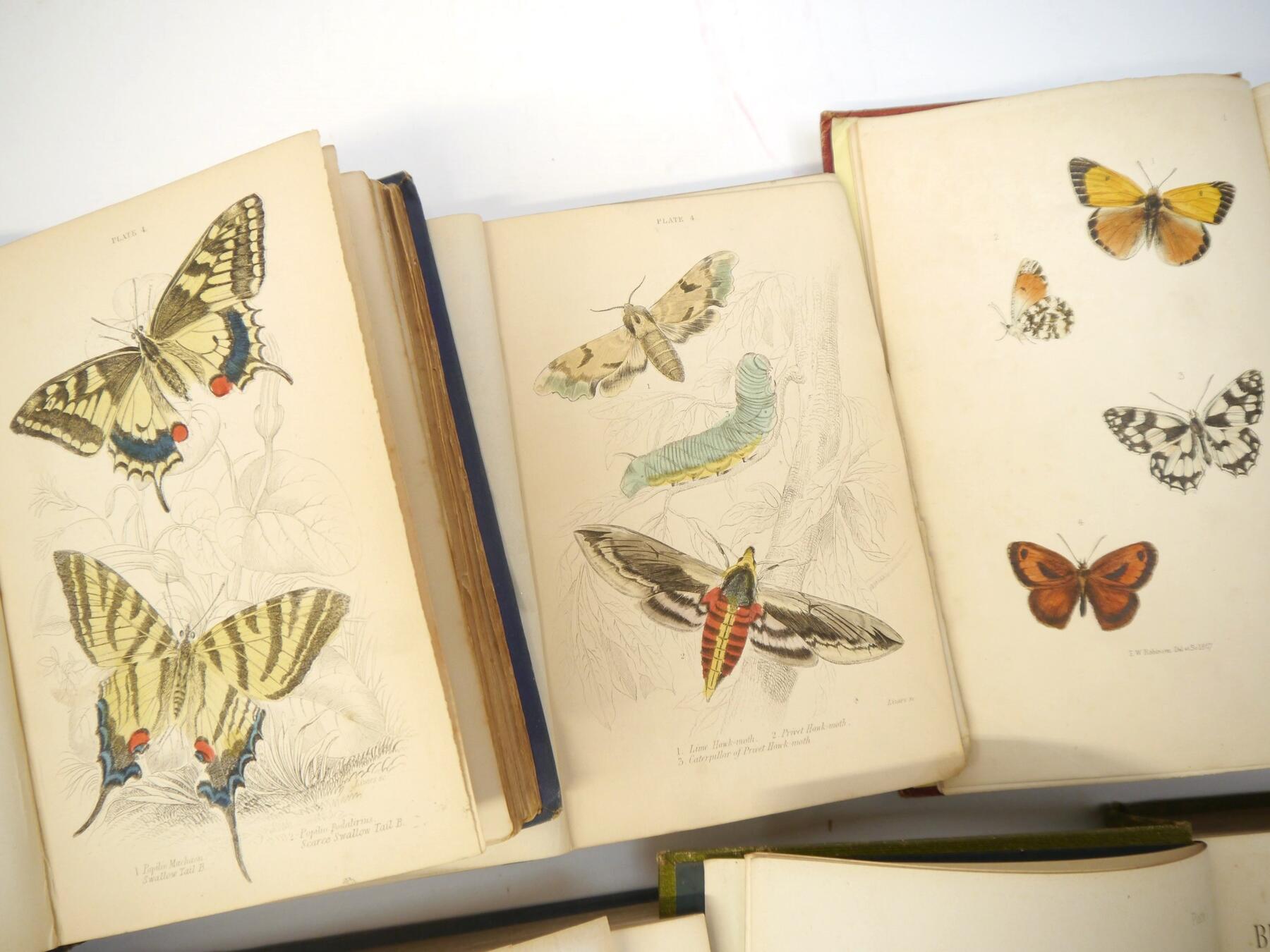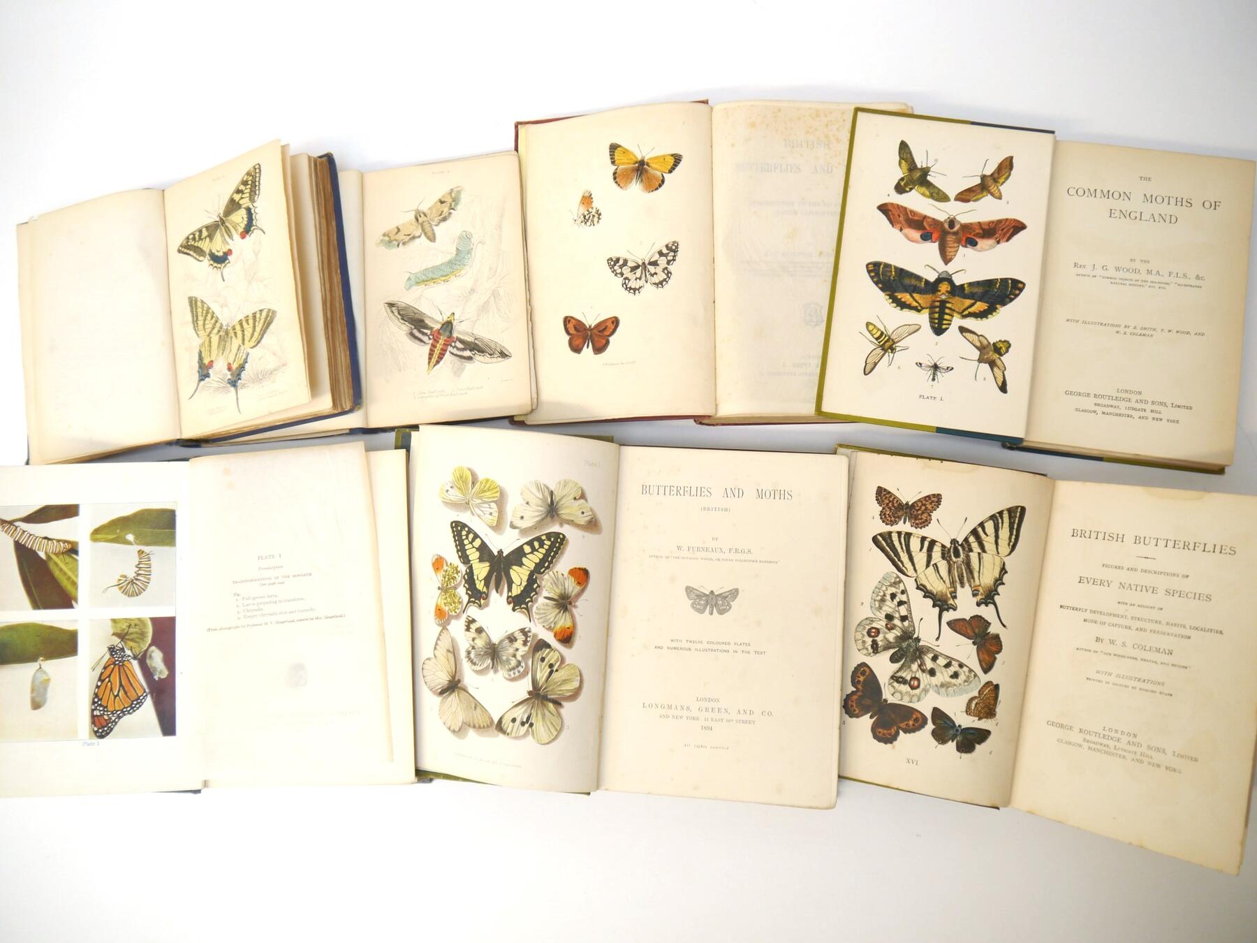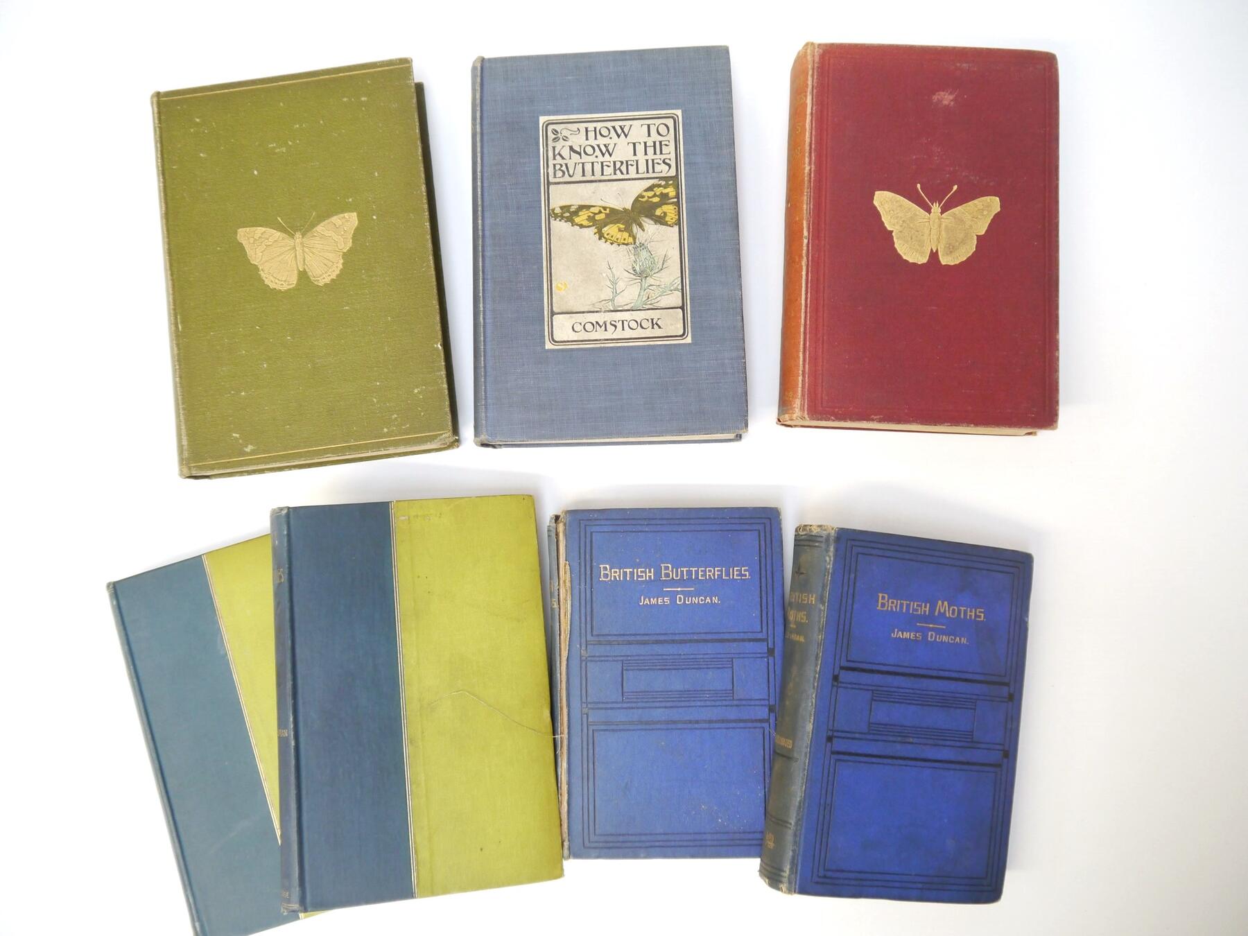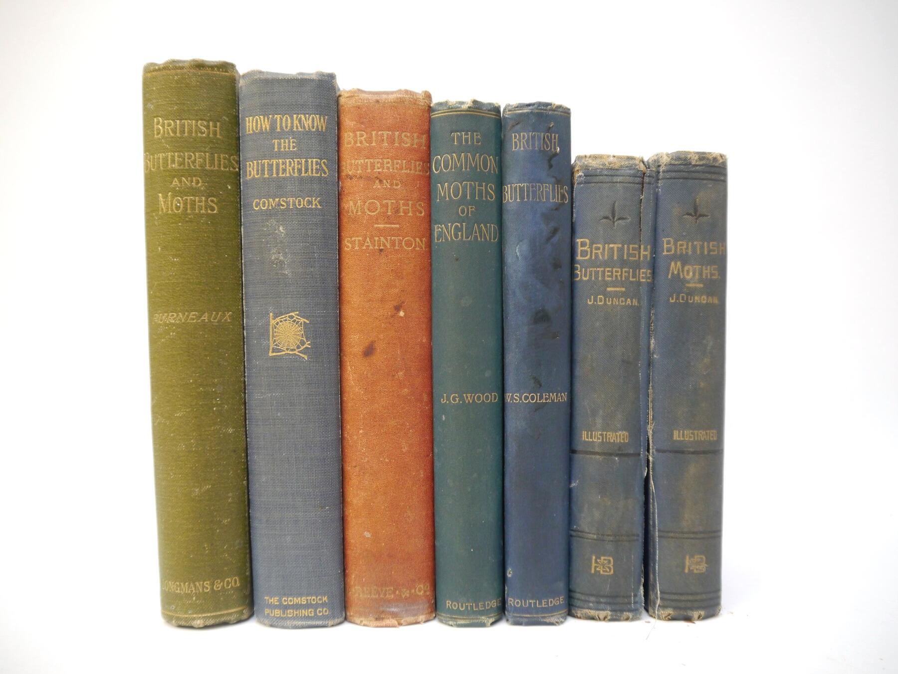 W. Furneaux: 'Butterflies and Moths (British)', London, Longmans, 1894, 1st edition, 12 coloured plates as called for, original pictorial cloth gilt; James Duncan, two titles 'British Moths', 'British Butterflies' each Hardwicke & Bogue, 1876, 1st title 30 coloured plates and illustrations in text as called for, original cloth gilt, inner joints split, 2nd title 34 coloured plates + ills. in text as called for, original cloth gilt, top board detached (but present); Stainton: 'British Butterflies & Moths', London, Reeve, [1867], 16 coloured plates as called for, 16pp publisher's catalogue at end, original pictorial cloth gilt; Comstock: 'How to Know Butterflies', Ithaca, 1920, 45 tissue guarded coloured coloured plates as called for, original cloth gilt, mounted coloured illustration to top board; Coleman: 'British Butterflies', London, Routledge, circa 1892, 16 coloured plates as called for; Wood: 'The Common Moths of England', London, Routledge, circa 1892, 12 coloured plates as called for, each original two tone cloth gilt (7)