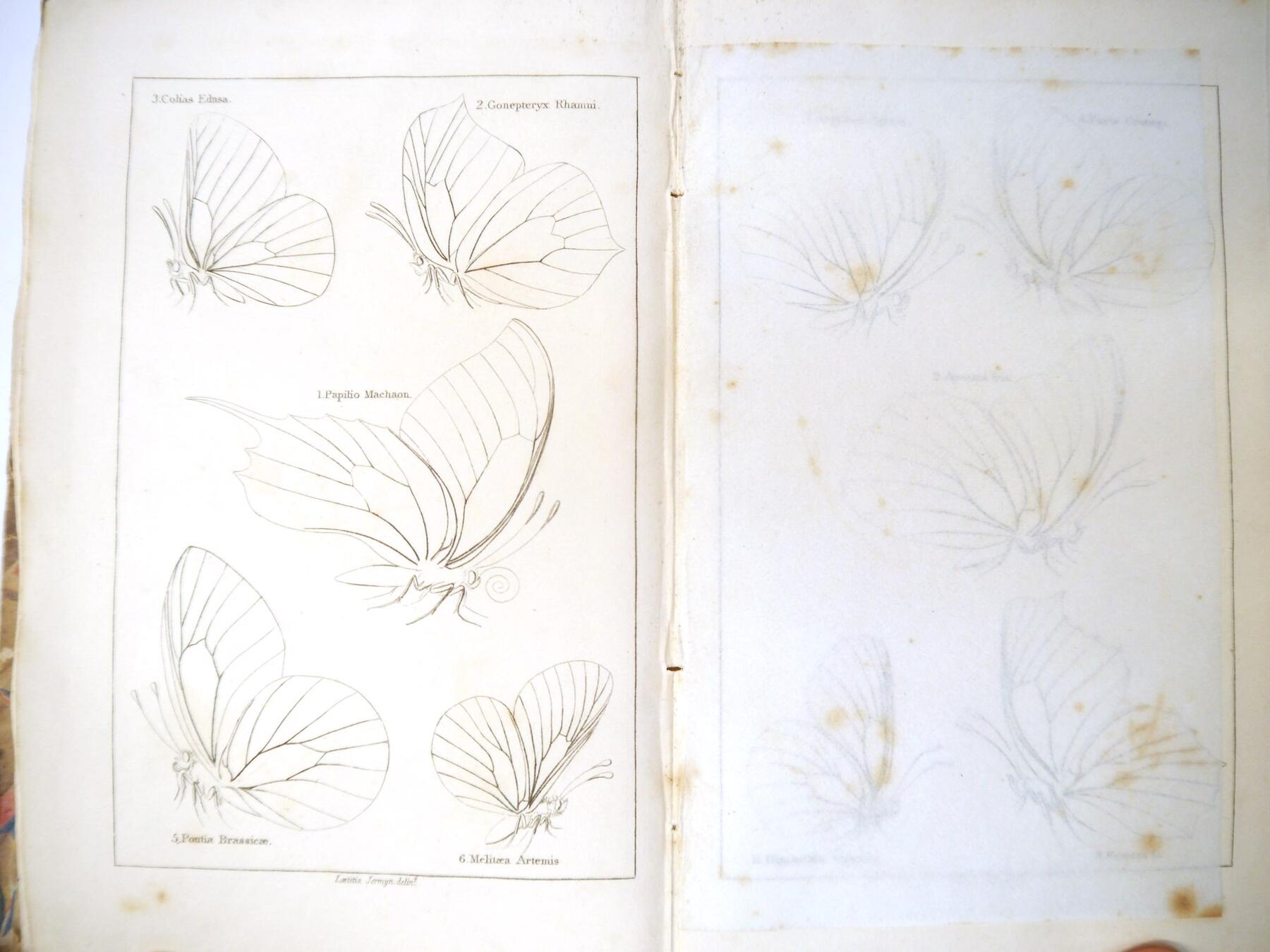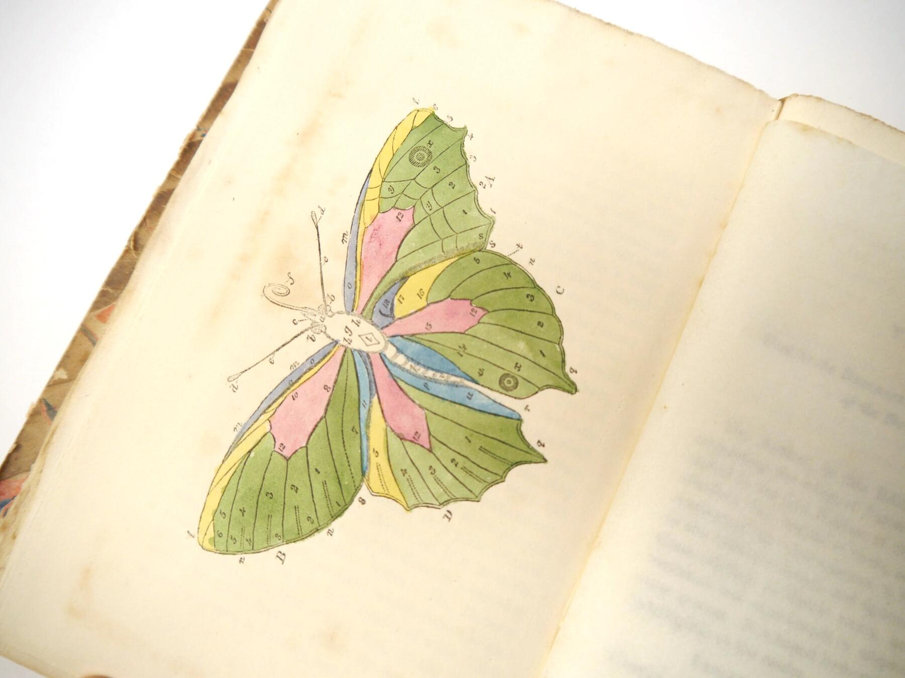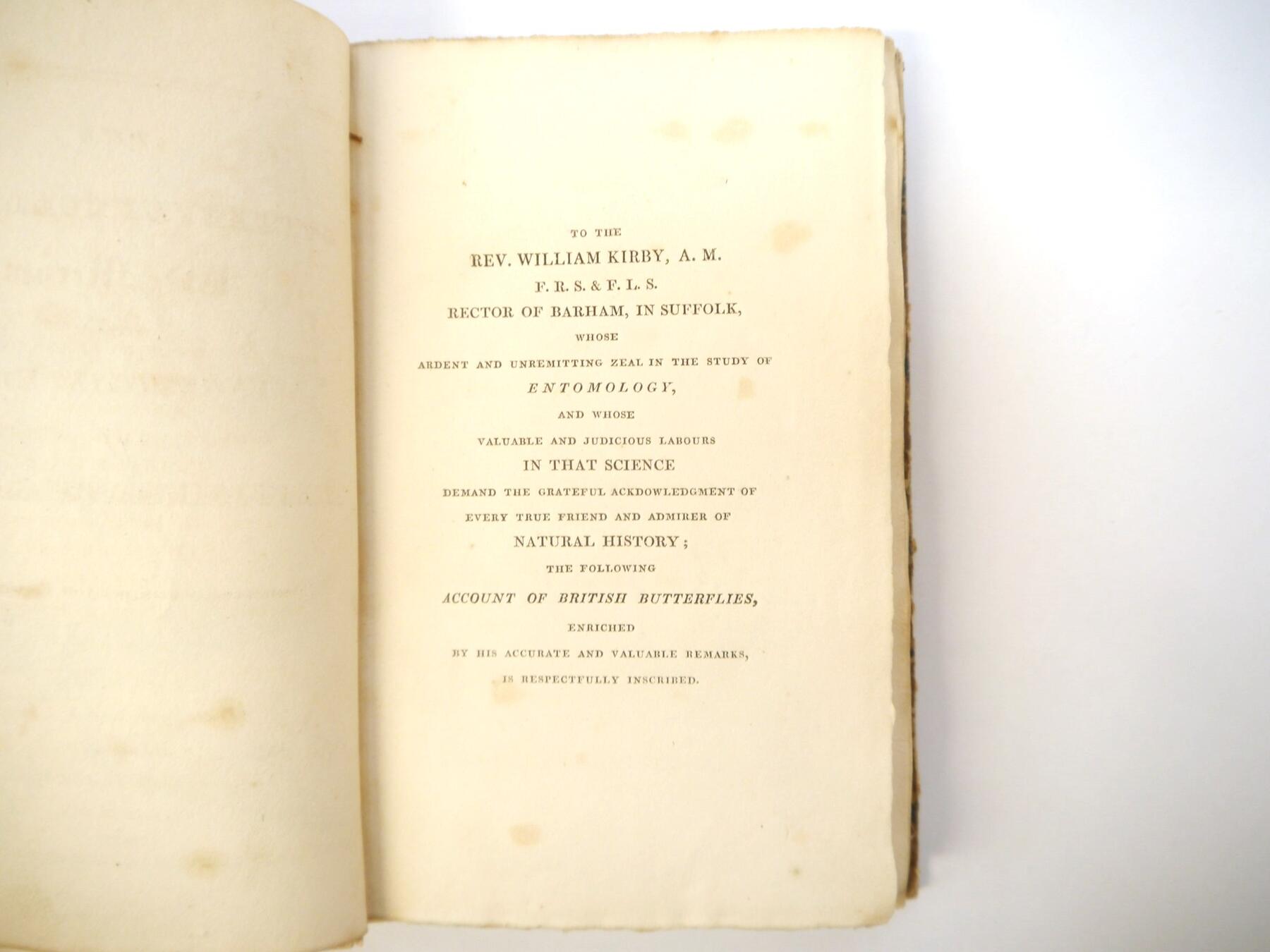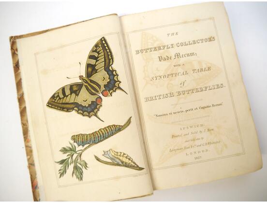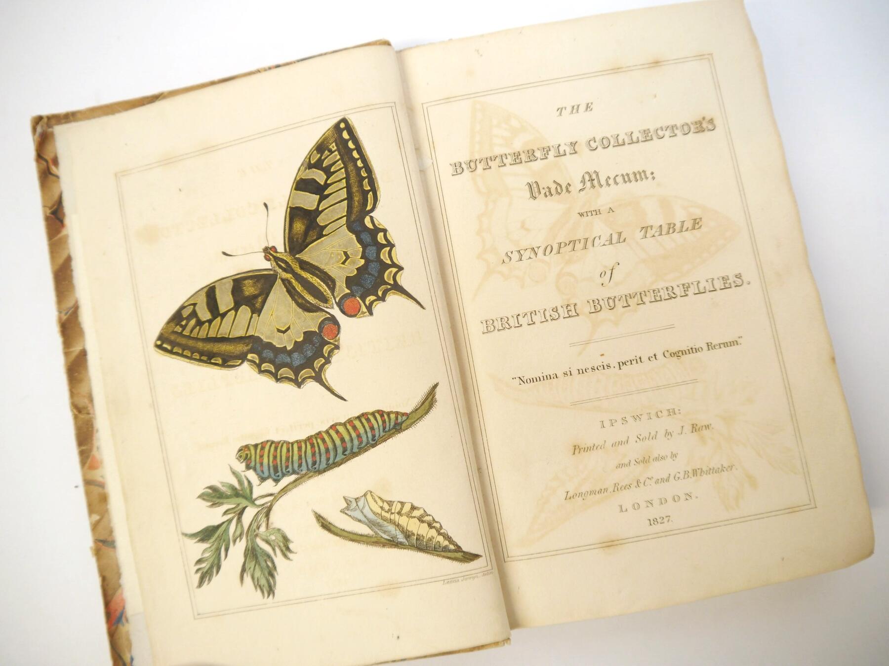 [Laetitia Jermyn, afterwards Ford]: 'The butterfly collector's Vade Mecum: with a synoptical table of British butterflies', Ipswich, J. Raw, 1827, 2nd edition, five engraved plates of which two hand coloured as called for, 169pp, original marbled paper covered boards, printed paper label to top board