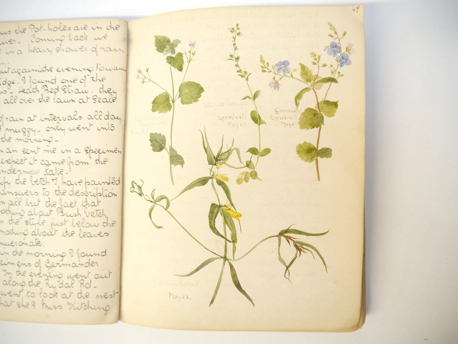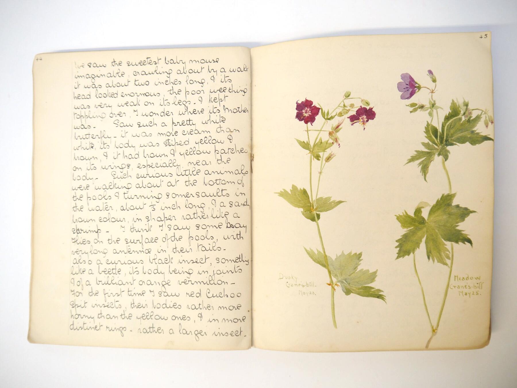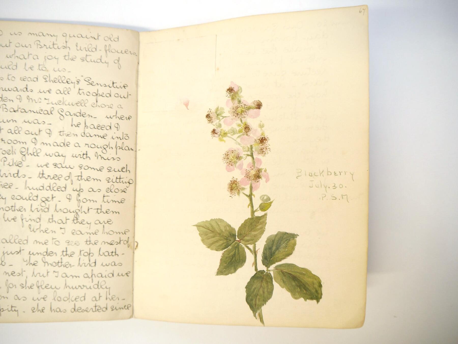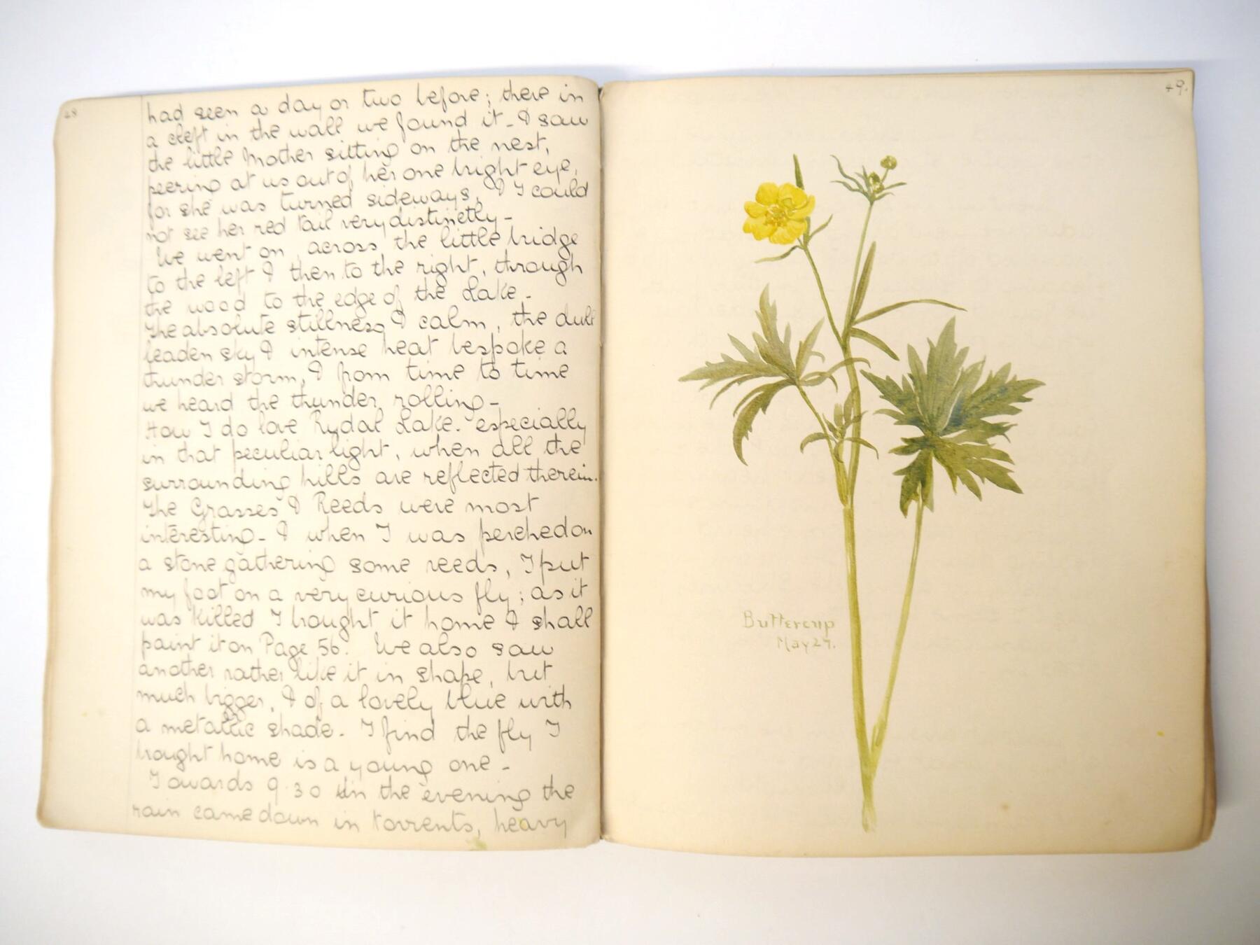 A manuscript students album of natural history observations and well executed watercolour sketches of flora and fauna dated 1901 and bearing the name Lillian Lees, 150+ pages of m/s entries in diary form and relating to excursions in the Lake District and Isle of Man, good number of well executed botanical watercolours throughout including Norway Maple, Groundsel, Pistillate Willow, Sorrel, Larch Rose, Pink Campion, Buttercup, Scorpion Grass etc, plus a few other watercolour sketches of butterflies, frogs, snakes etc, manuscript tables with monthly numbers of species of flora and fauna observed etc, original cloth, printed label to top board with manuscript details ''Lillian Lees-Student-House of Education Ambleside Nature Diary''