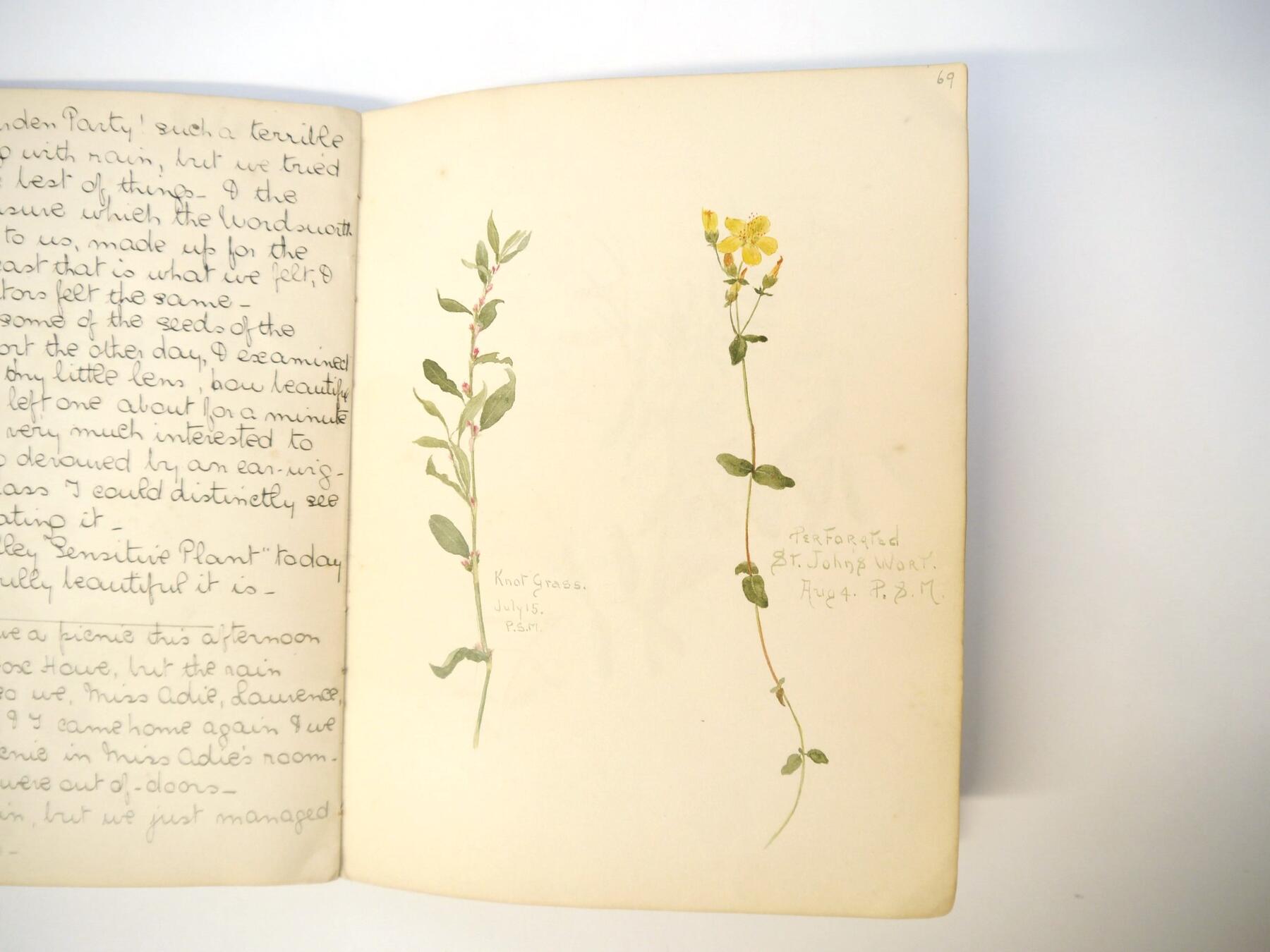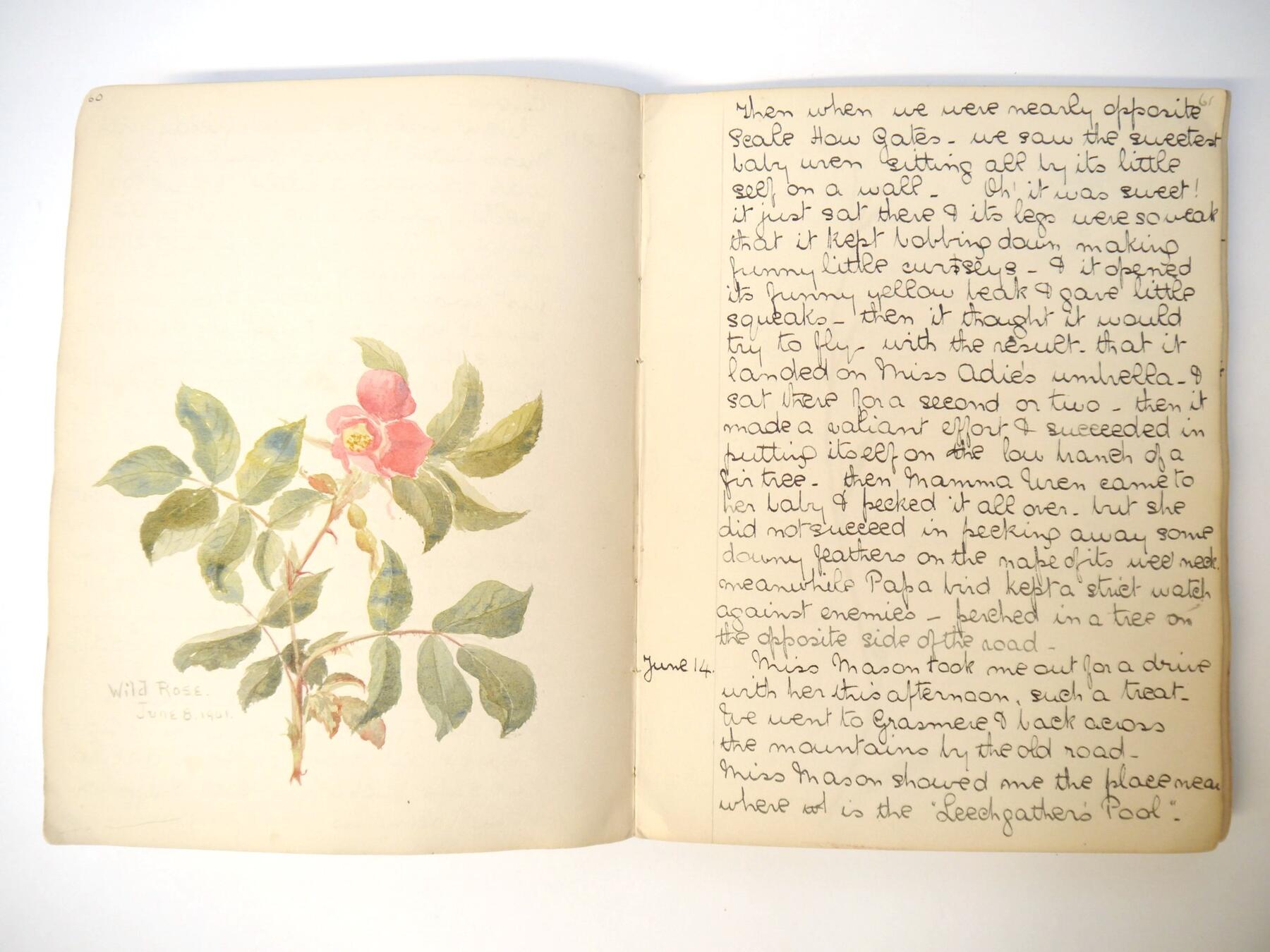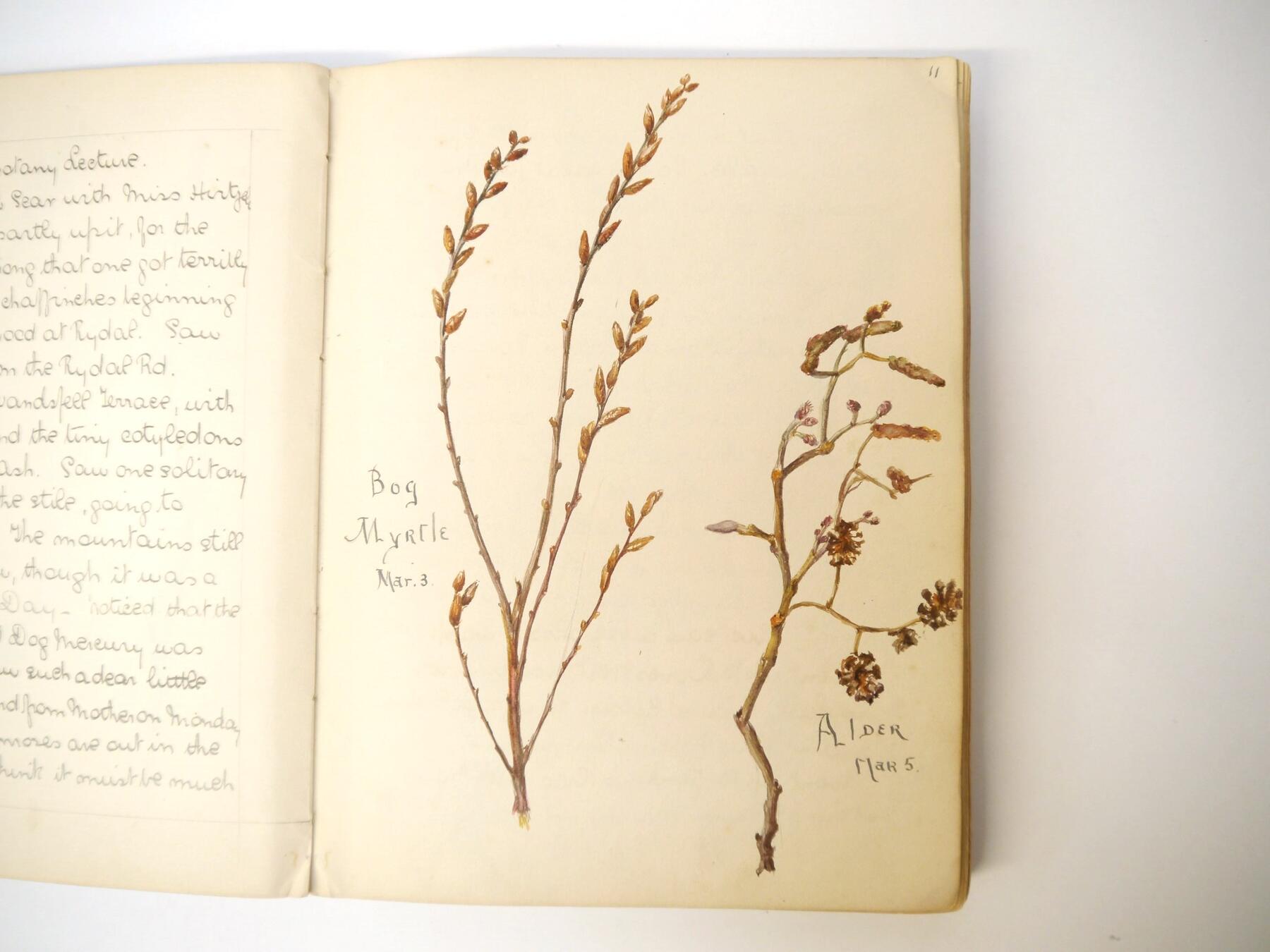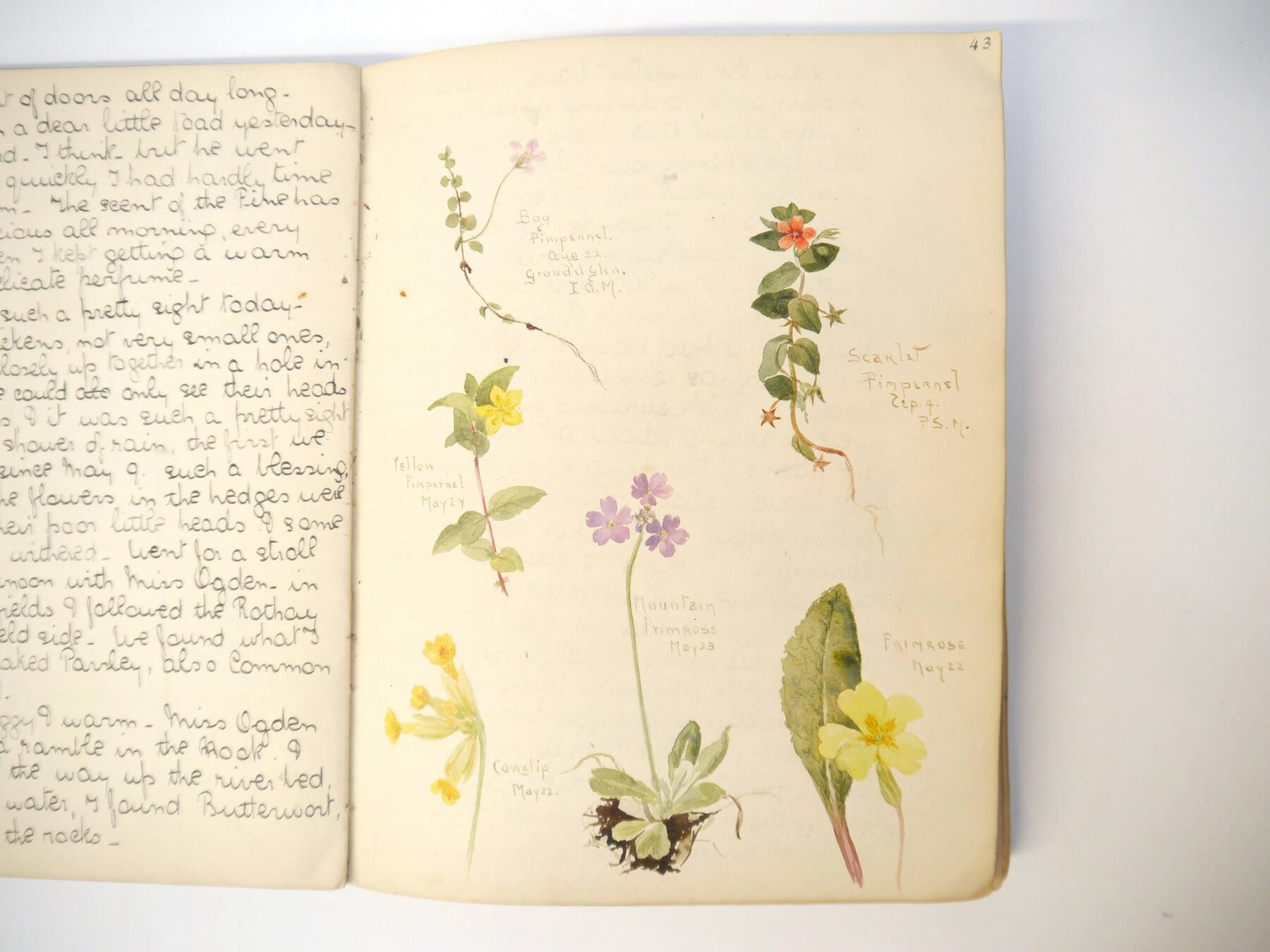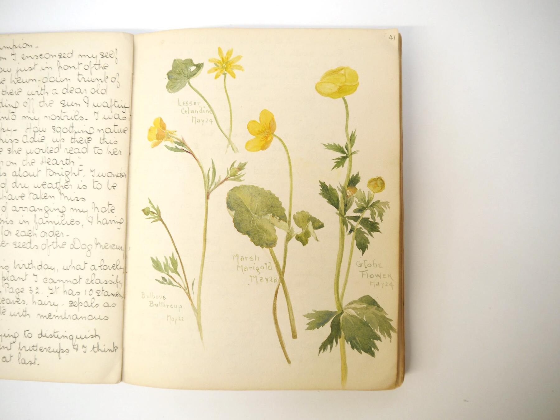 A manuscript students album of natural history observations and well executed watercolour sketches of flora and fauna dated 1901 and bearing the name Lillian Lees, 150+ pages of m/s entries in diary form and relating to excursions in the Lake District and Isle of Man, good number of well executed botanical watercolours throughout including Norway Maple, Groundsel, Pistillate Willow, Sorrel, Larch Rose, Pink Campion, Buttercup, Scorpion Grass etc, plus a few other watercolour sketches of butterflies, frogs, snakes etc, manuscript tables with monthly numbers of species of flora and fauna observed etc, original cloth, printed label to top board with manuscript details ''Lillian Lees-Student-House of Education Ambleside Nature Diary''